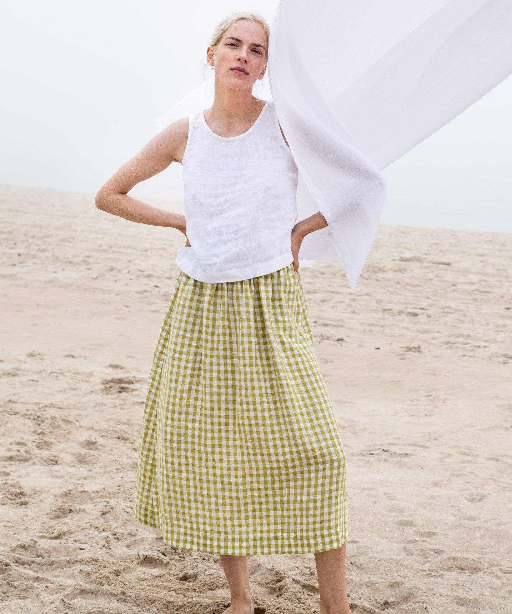 When it comes to color and patterns, we have a wide range to choose from. From classic white linen skirts for summer to bright shades like burnt orange, we've got you covered. We also have patterned options, including gingham, stripes, and checks.