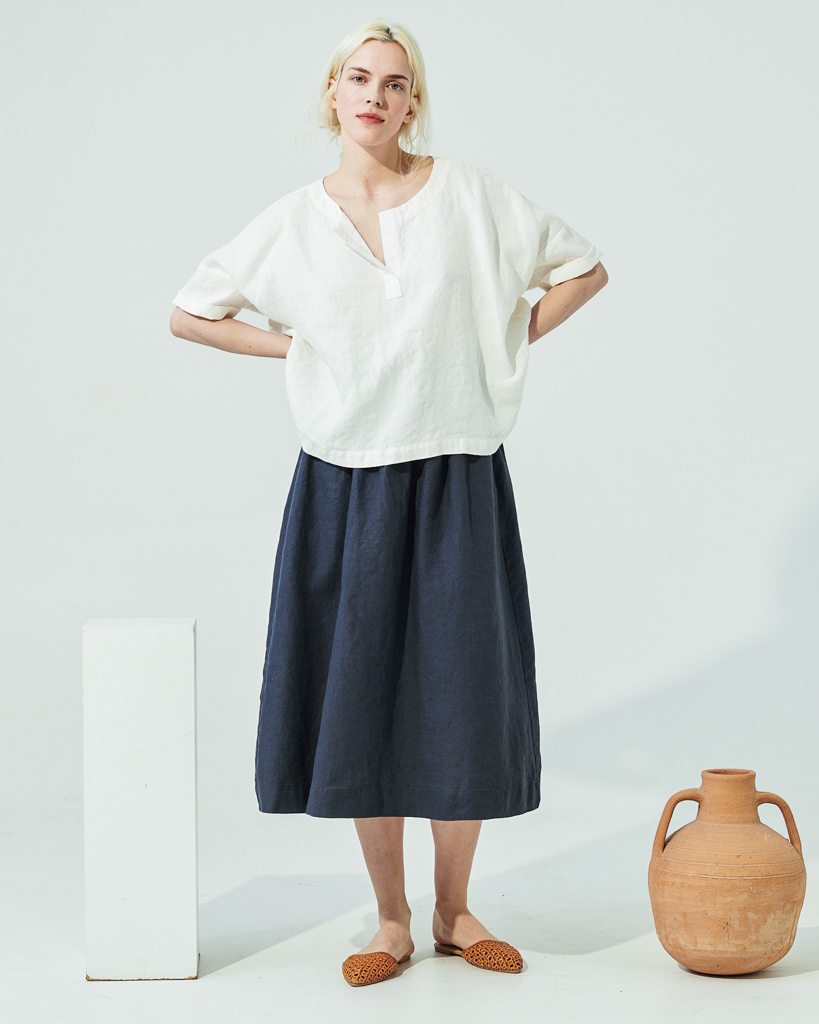 • Model is size S and wears a top in cream, paired with Sion skirt in charcoal blue.