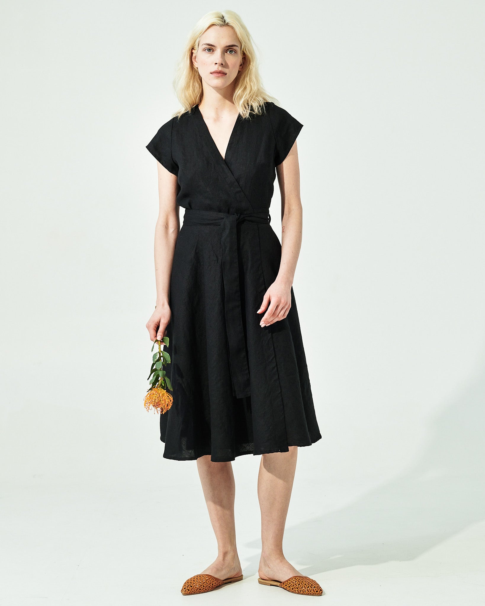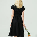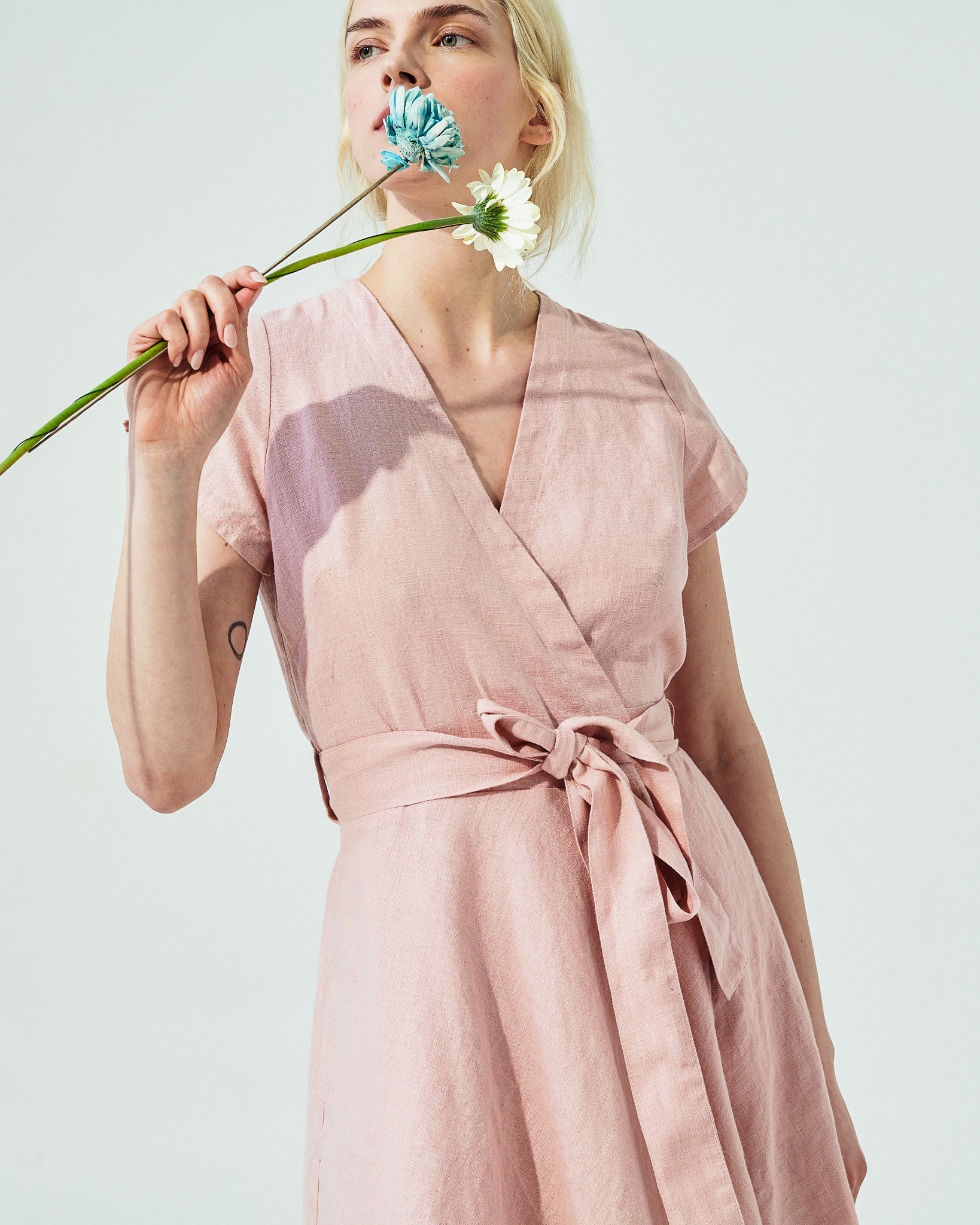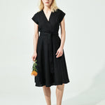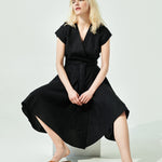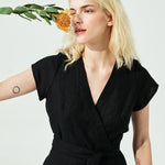 • Subtle v-neckline, cap sleeves, elastic waistband, and wraparound tie. Also, it has pockets!