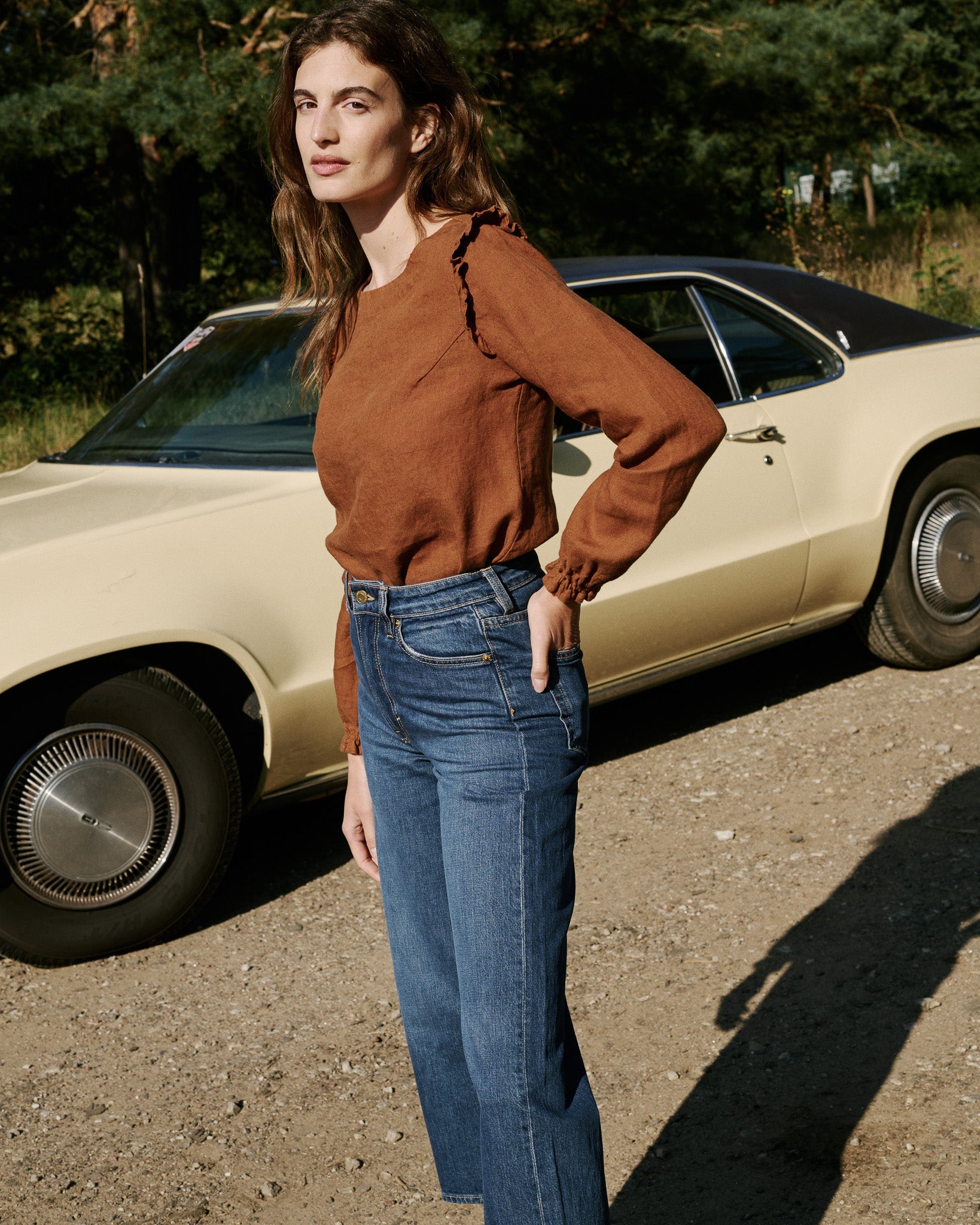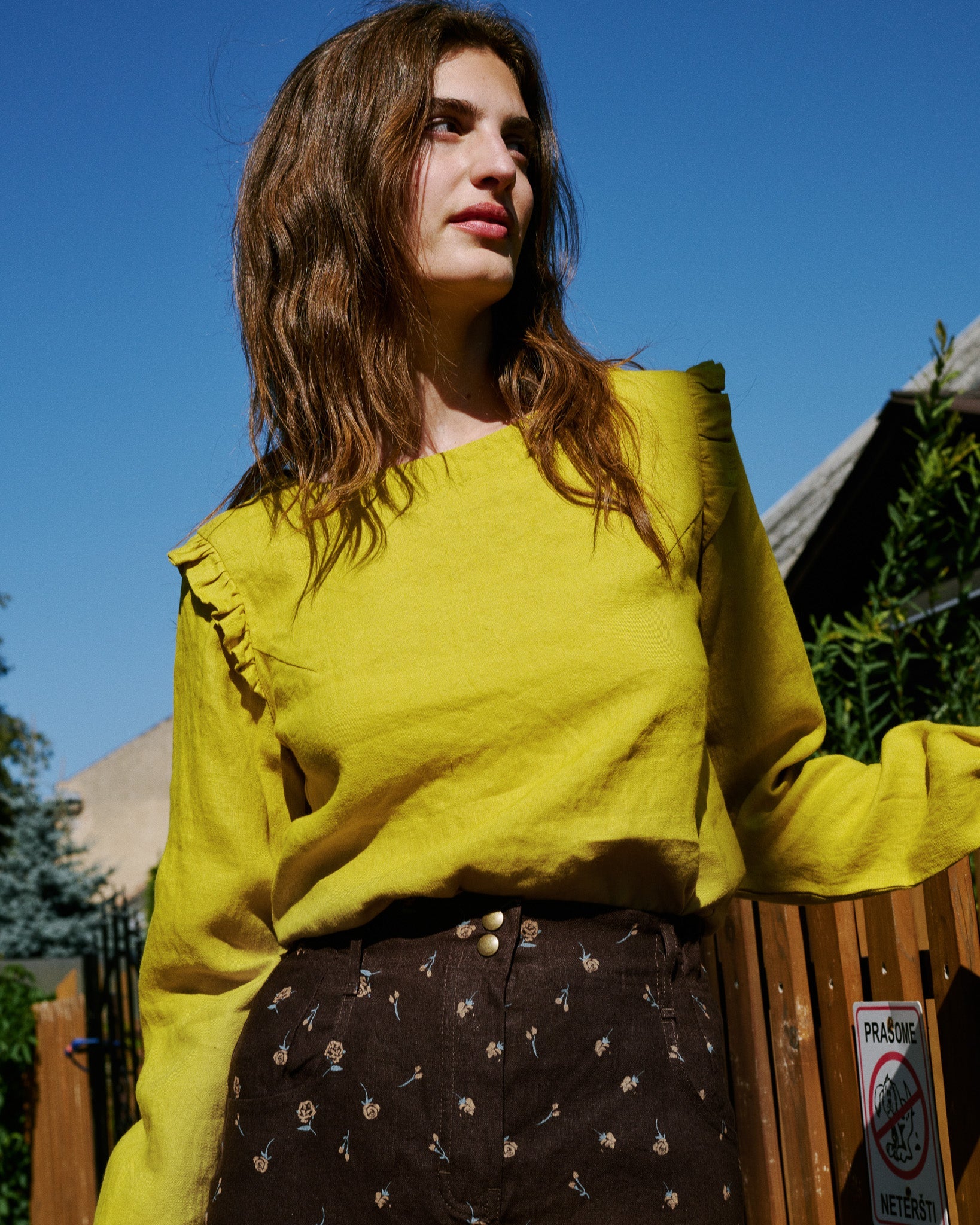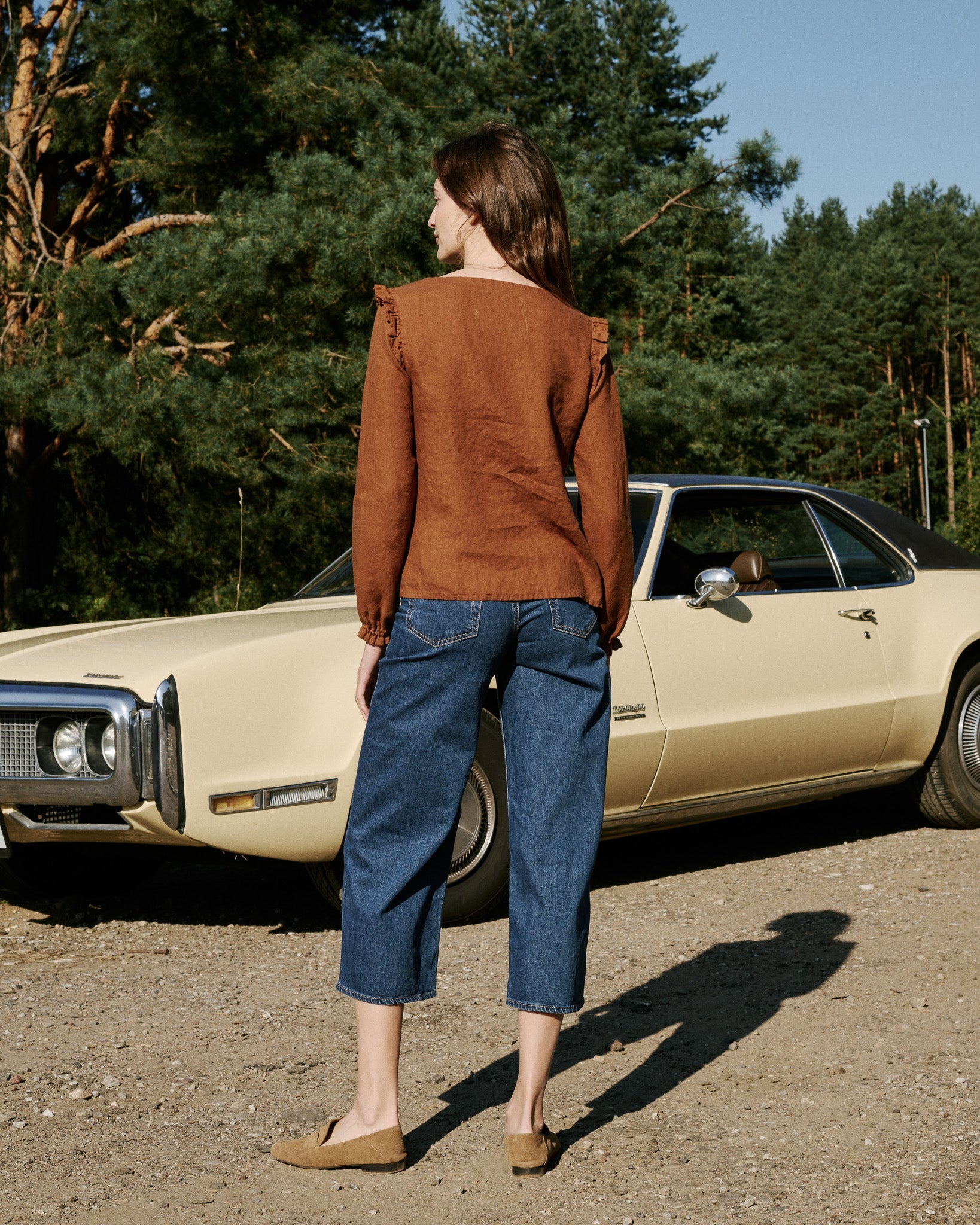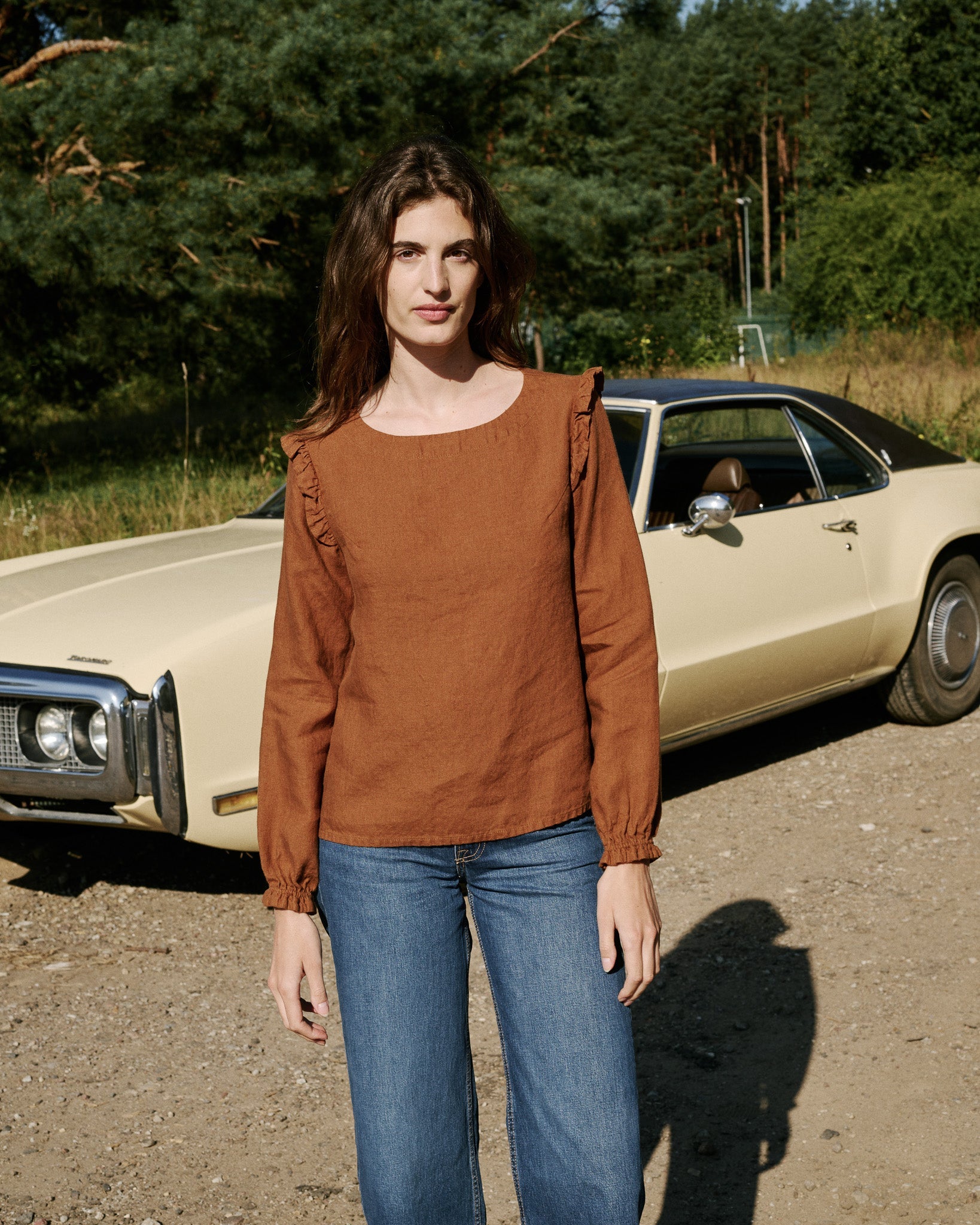 • Simple, gorgeous linen top with a subtle rounded neckline and long sleevs with ruffle finish.