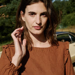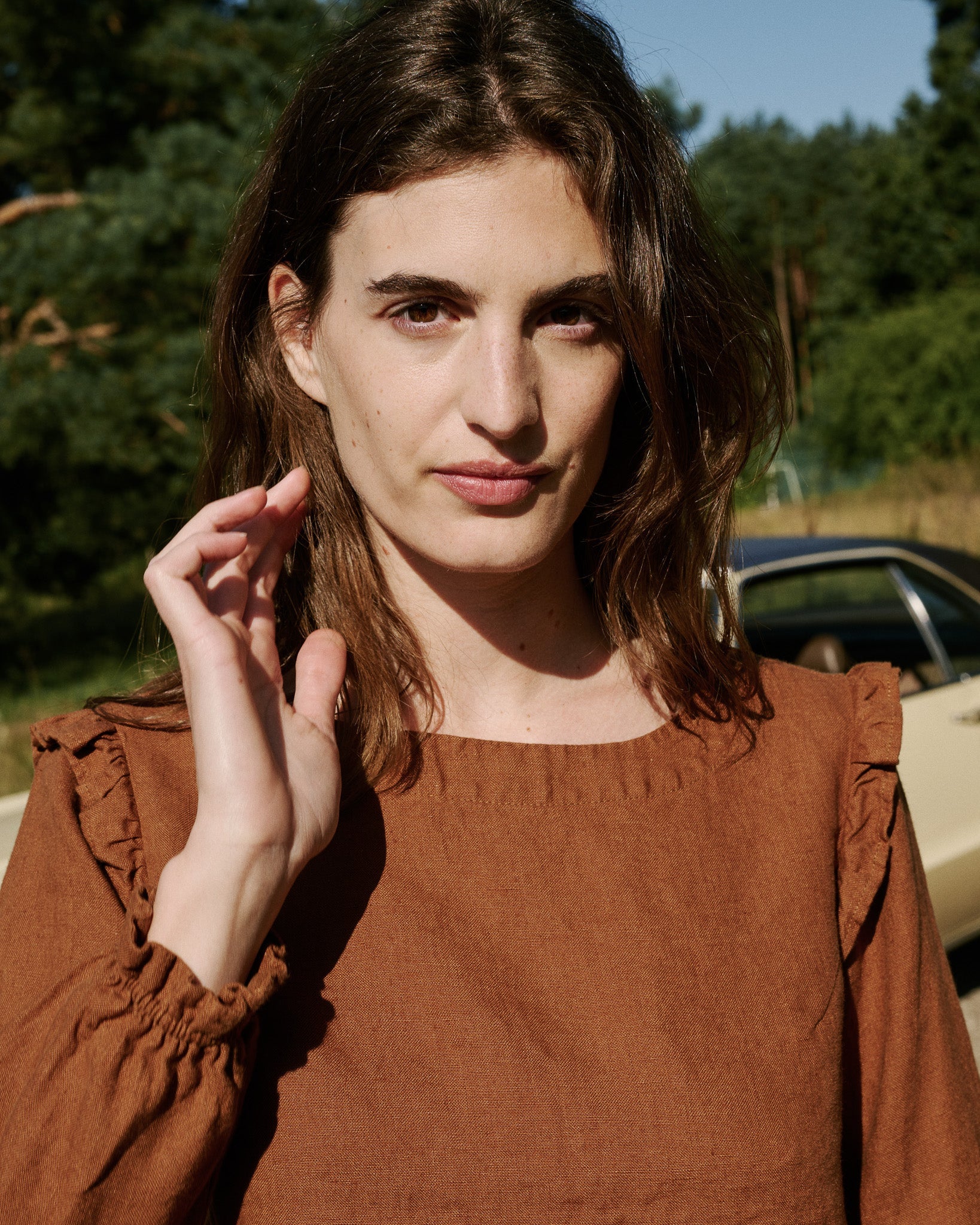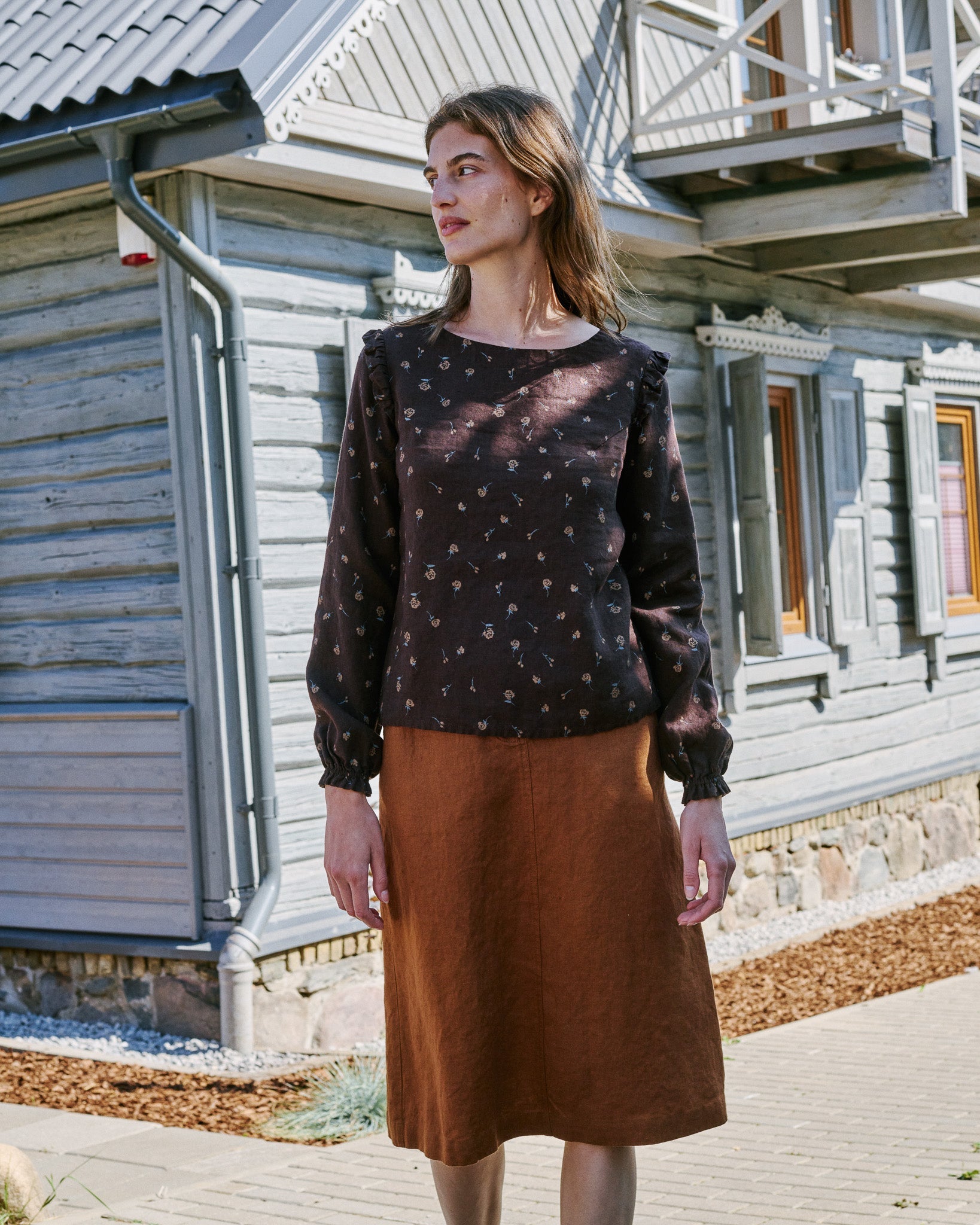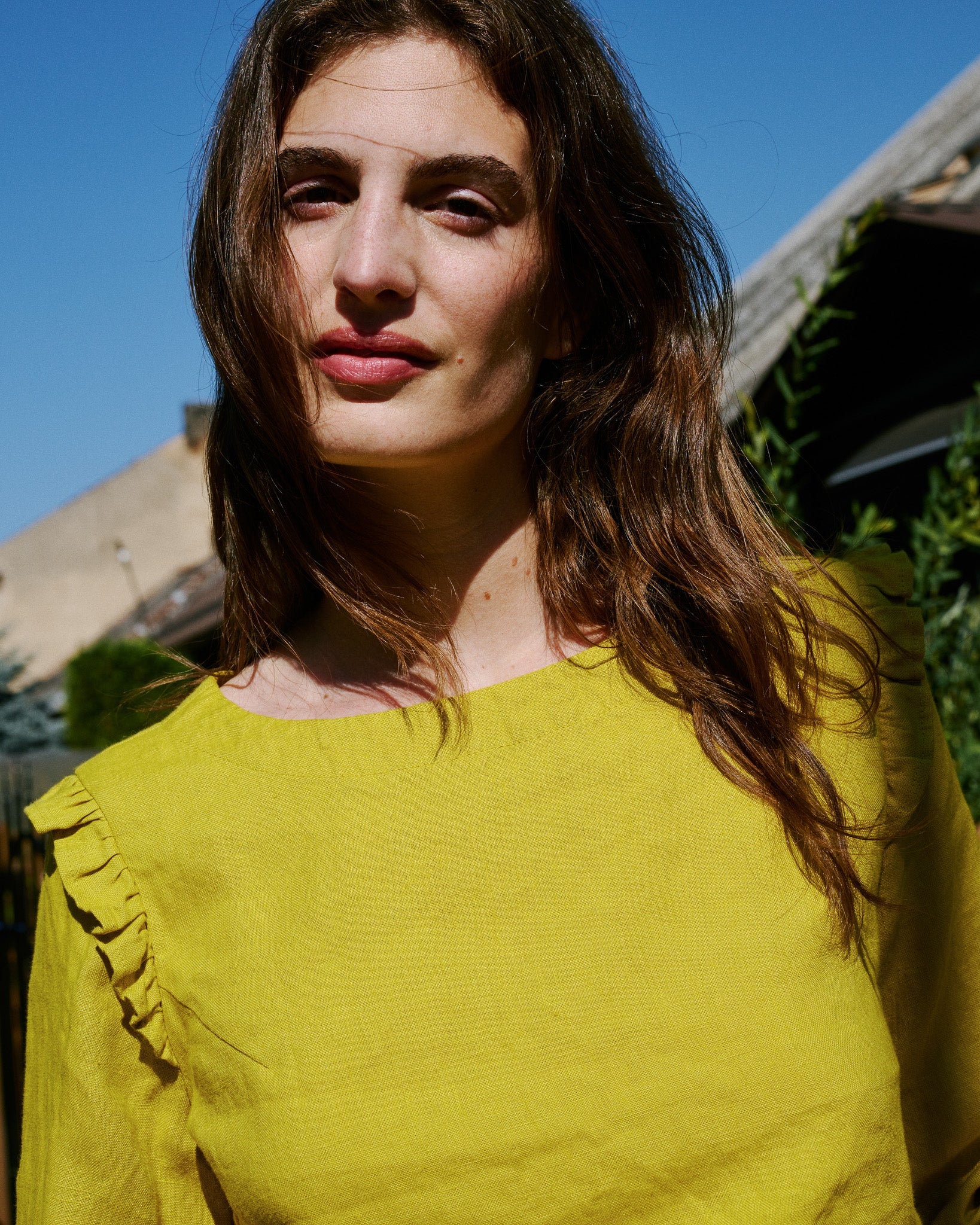 • Simple, gorgeous linen top with a subtle rounded neckline and long sleevs with ruffle finish.