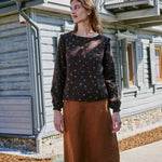 • Model is wearing a top in espresso rose, paired with Matera skirt in heavy toast.