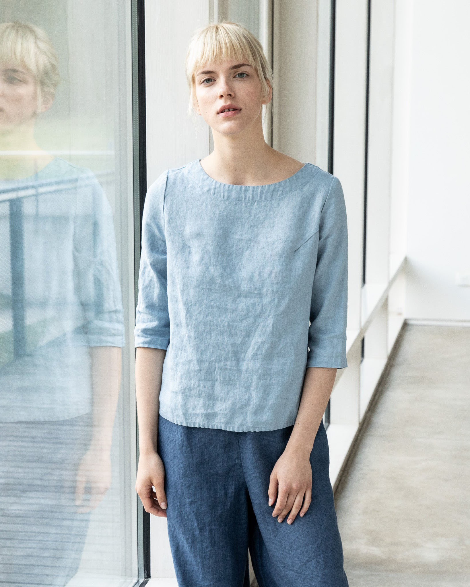 • Simple, gorgeous linen top with a subtle rounded neckline and ¾-length sleeves.
