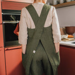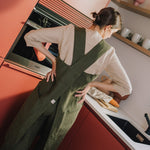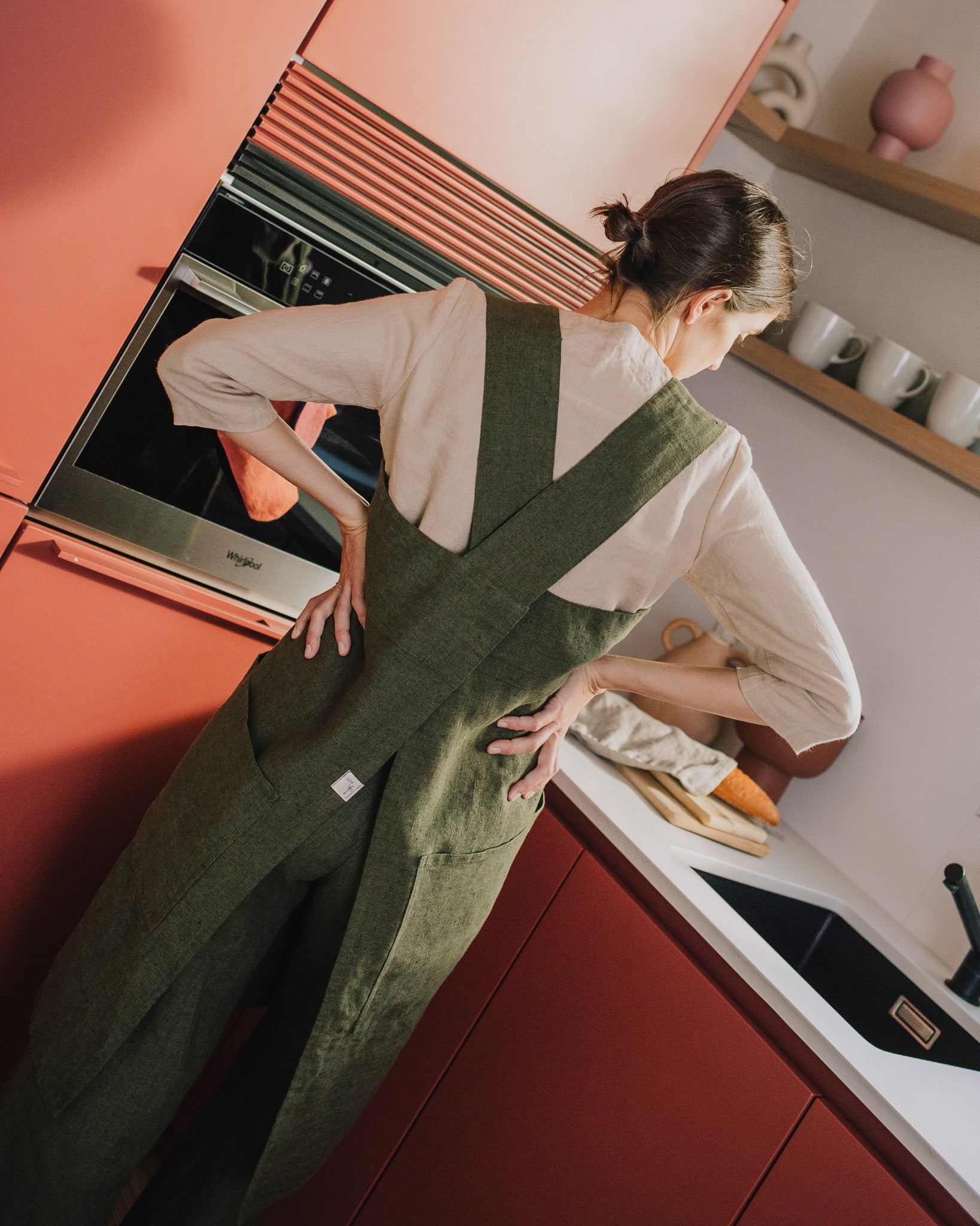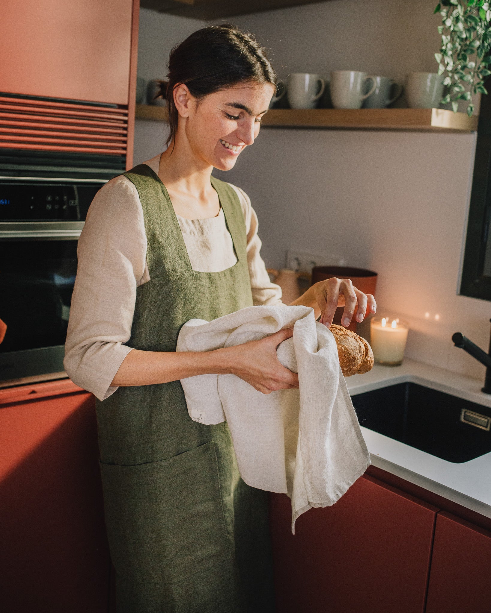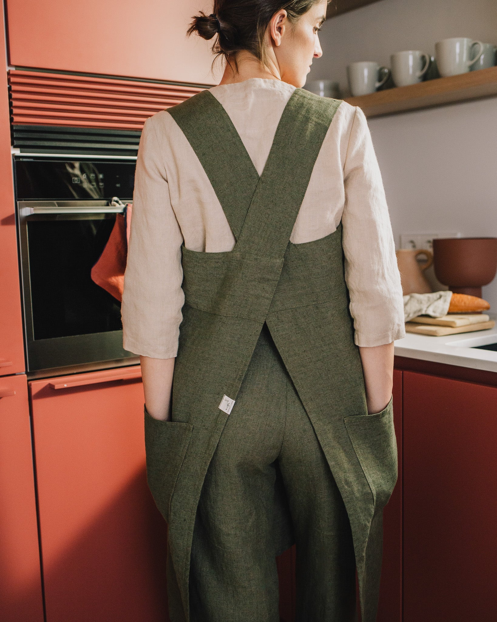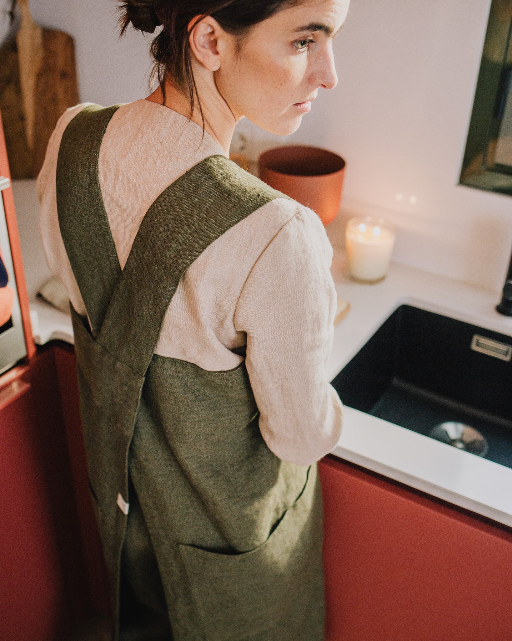 • Model is wearing an apron in heavy khaki linen (1st photo).