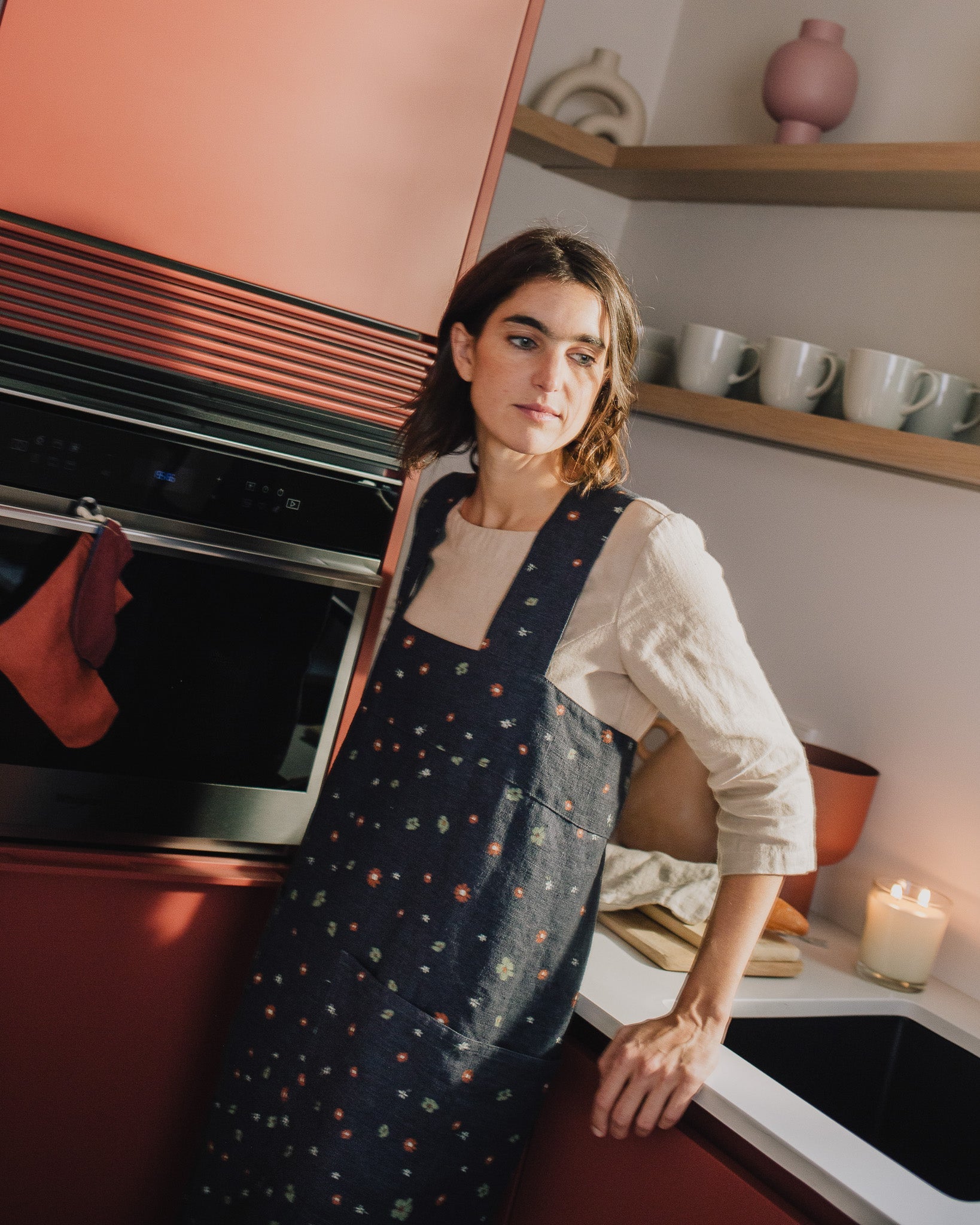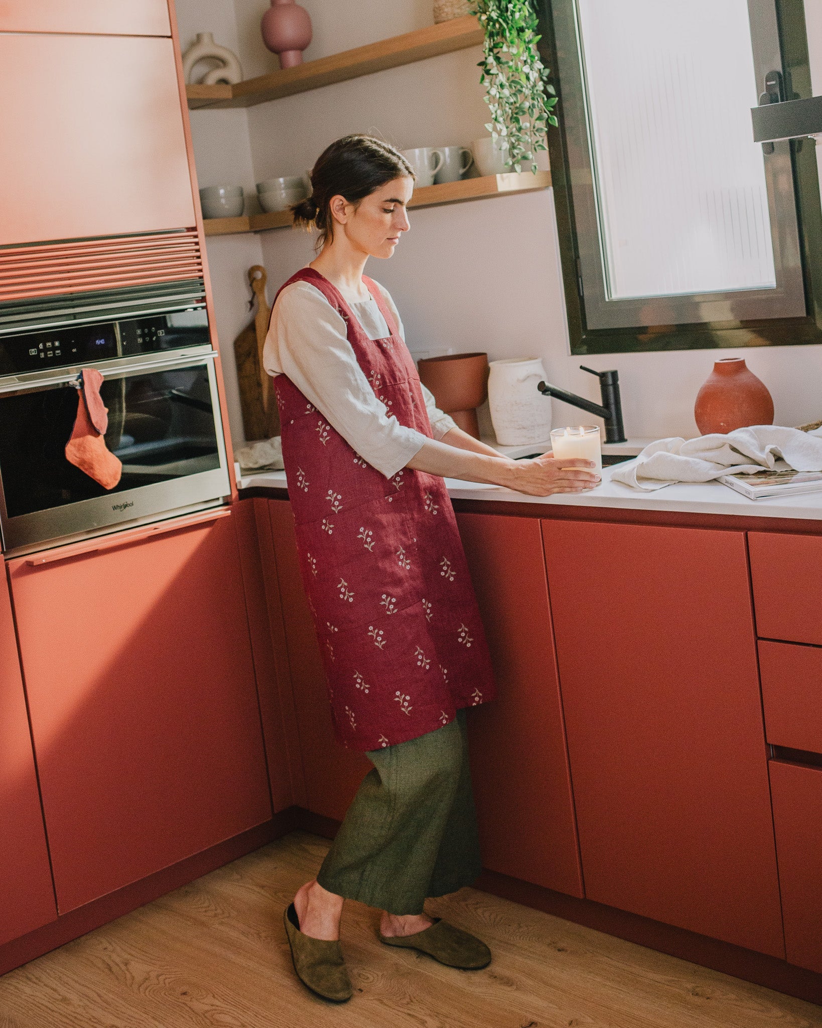 • Model is wearing an apron in heavy weight Idyllic Burgundy pattern (1st photo).