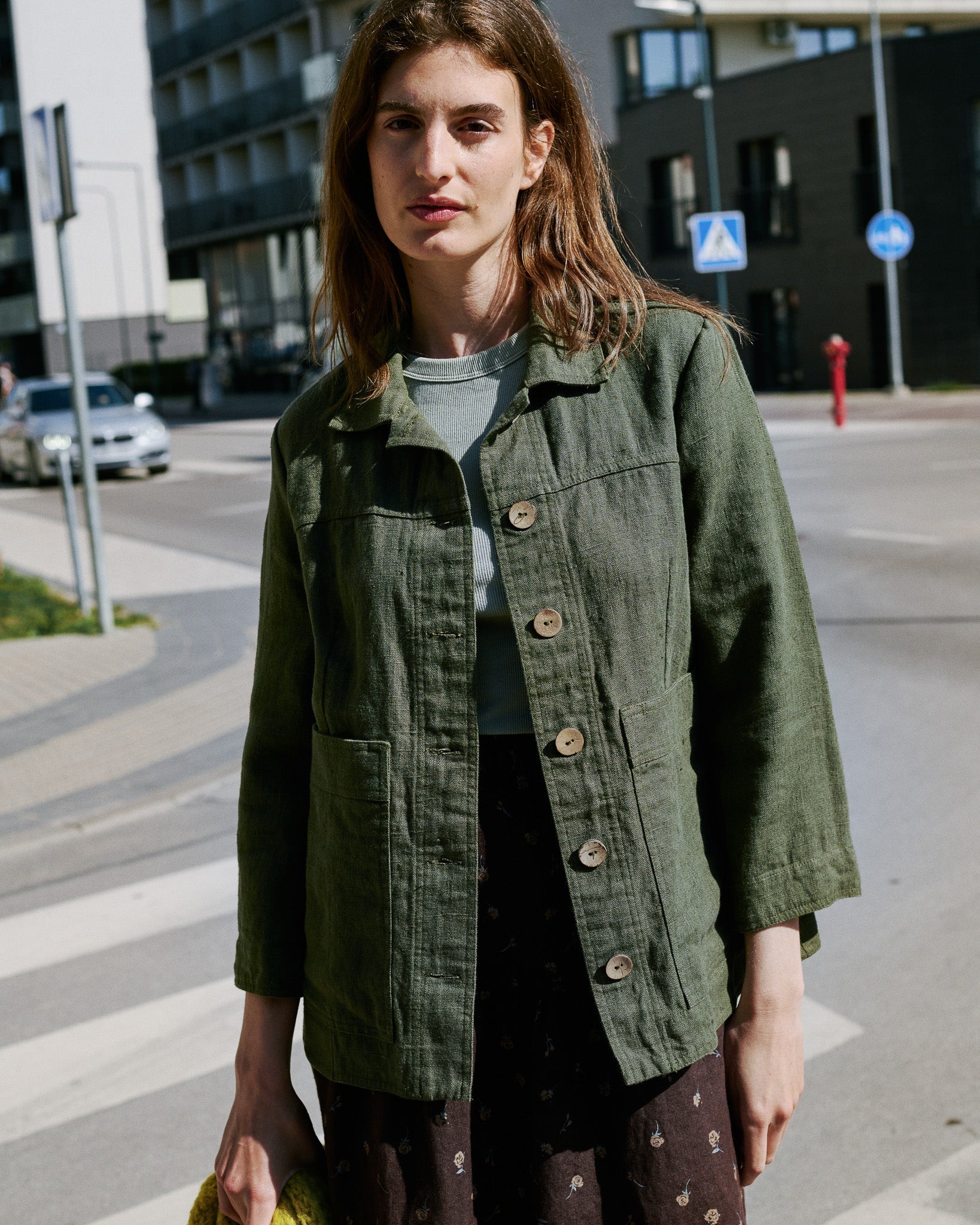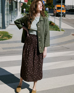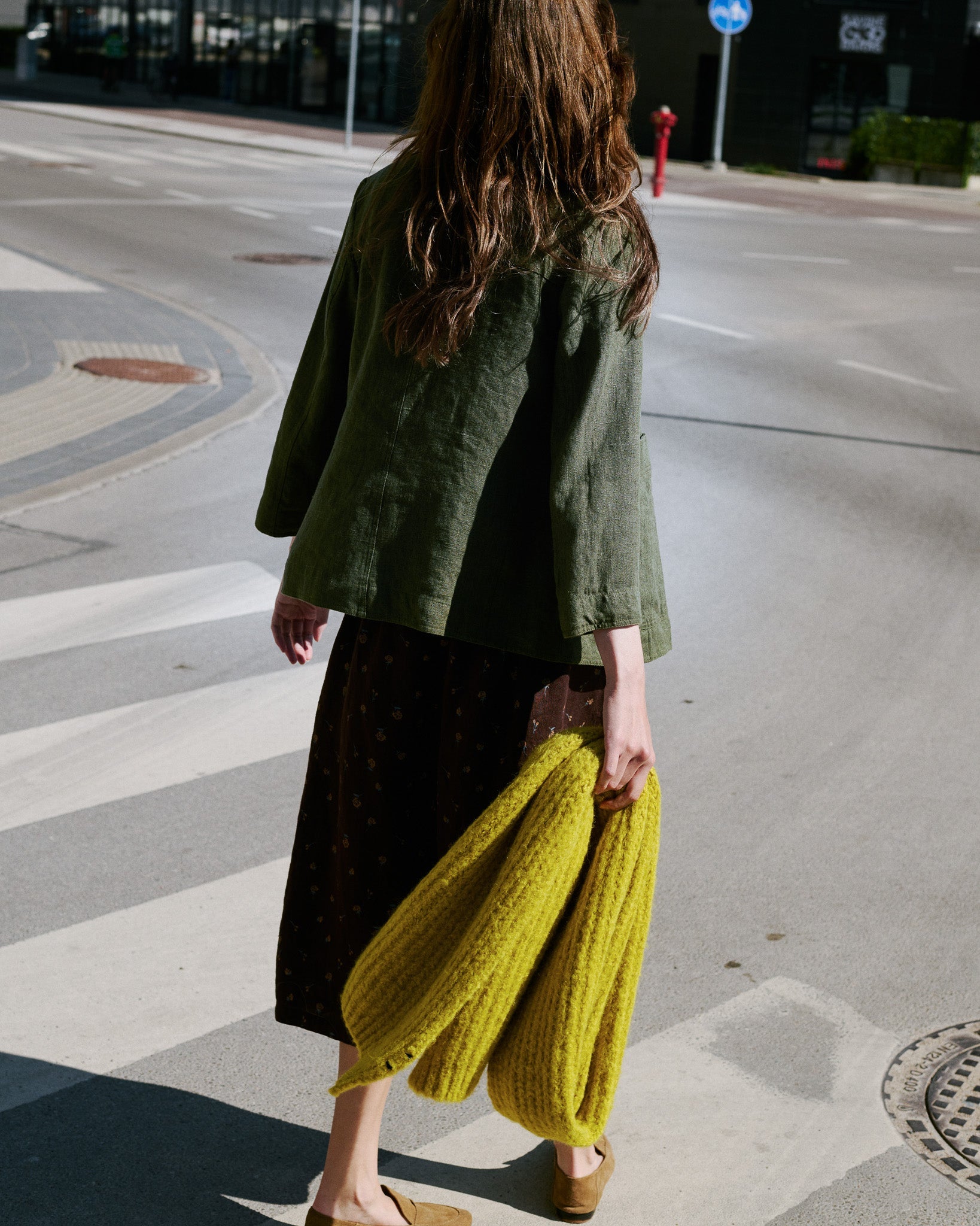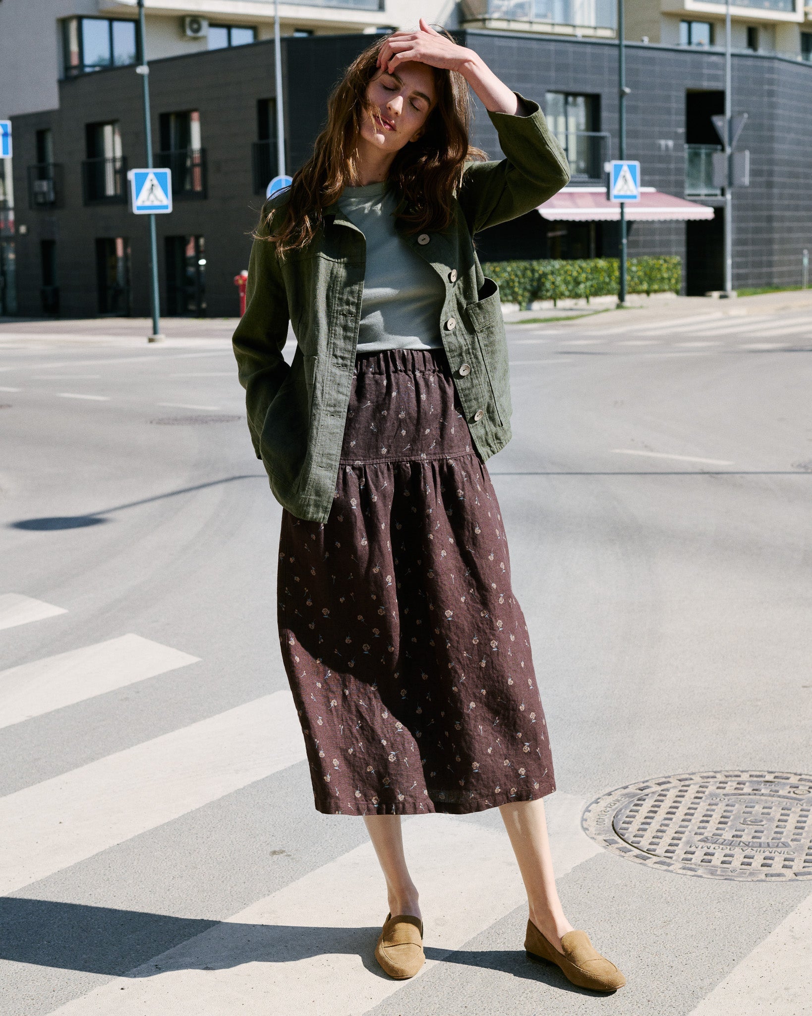 • Model is wearing a jacket in heavy khaki linen, paired with Anjali skirt in espresso rose.