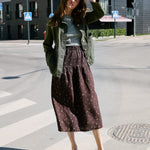 • Model is size S (179 cm/5.87 ft) and wears a jacket in heavy khaki, paired with Anjali skirt in espresso rose.