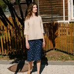 • Model is wearing a top in oat milk, paired with Matera skirt in midnight rose.