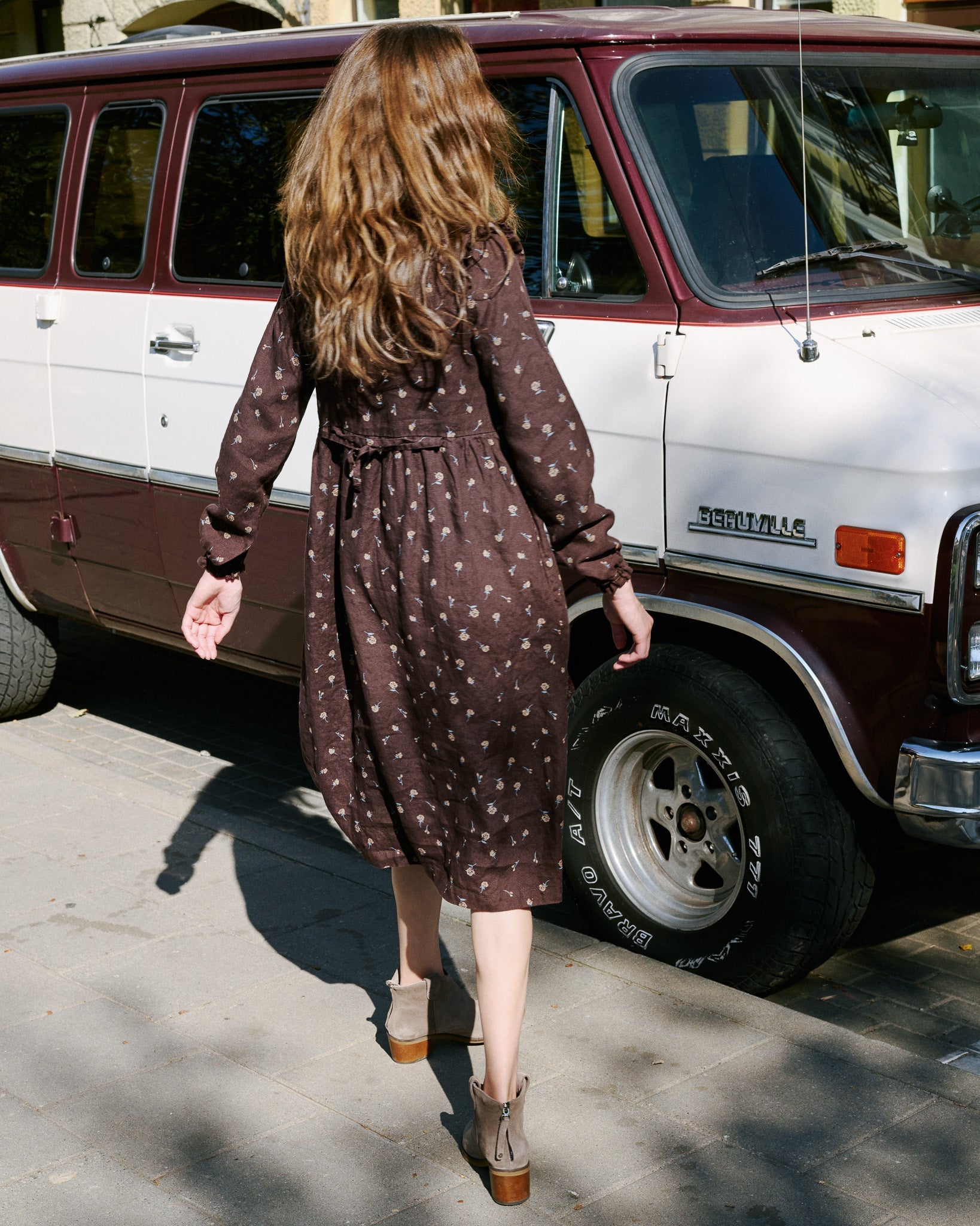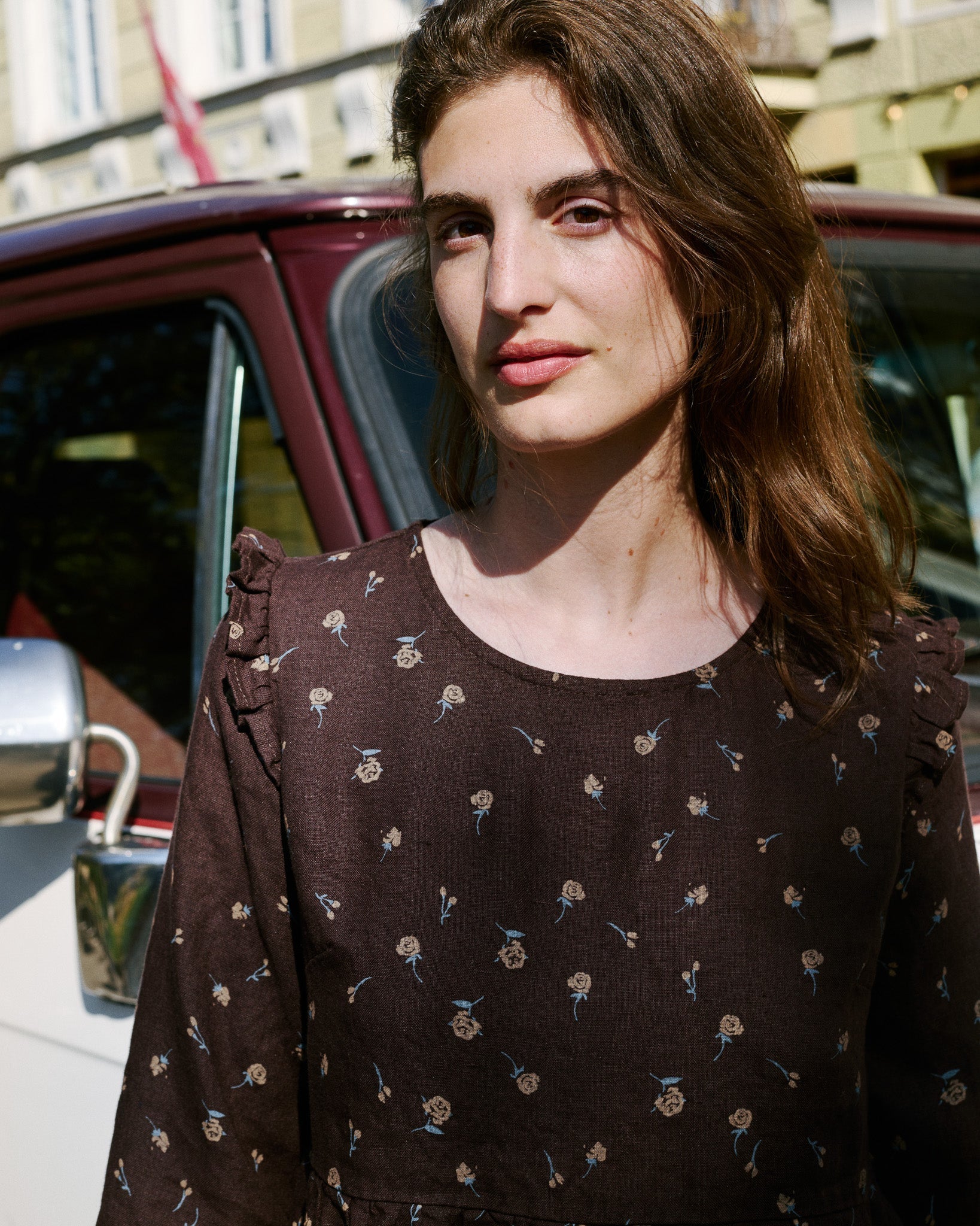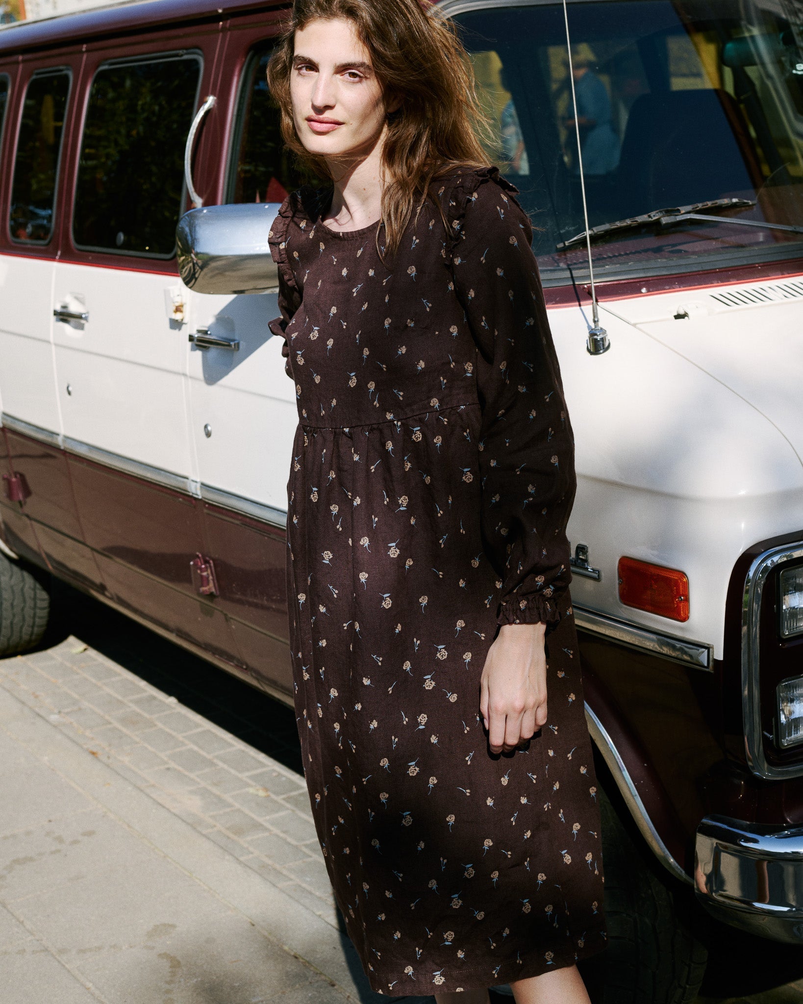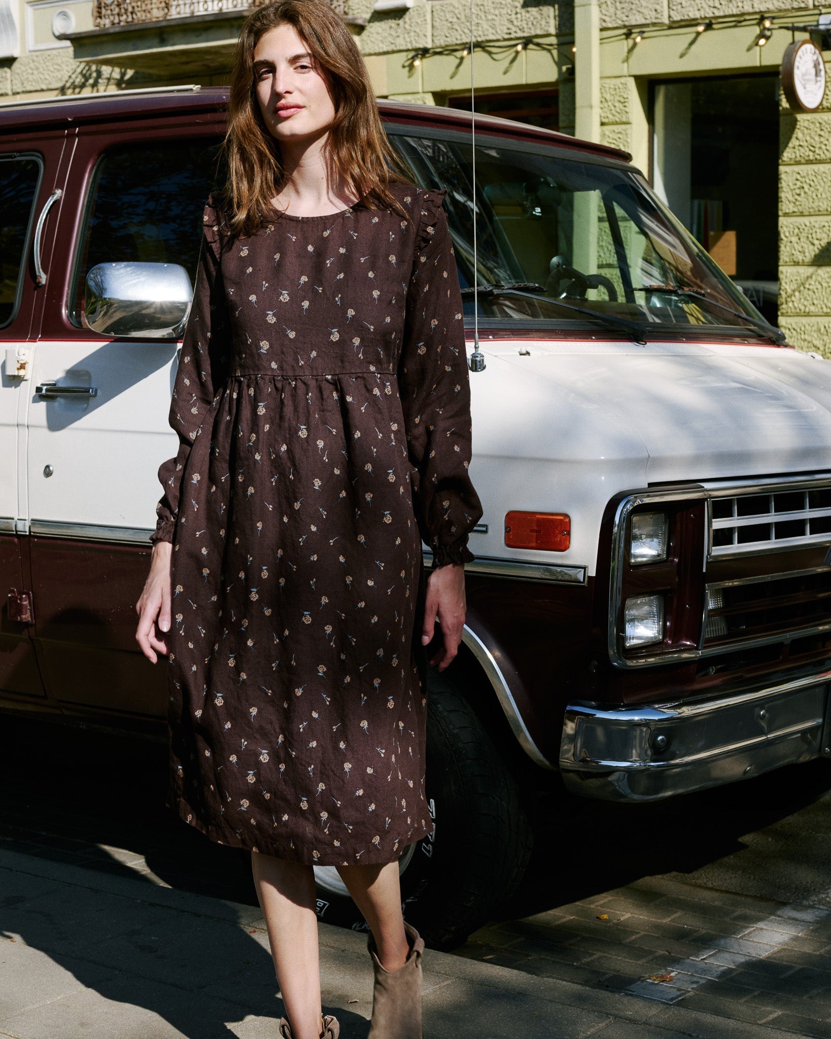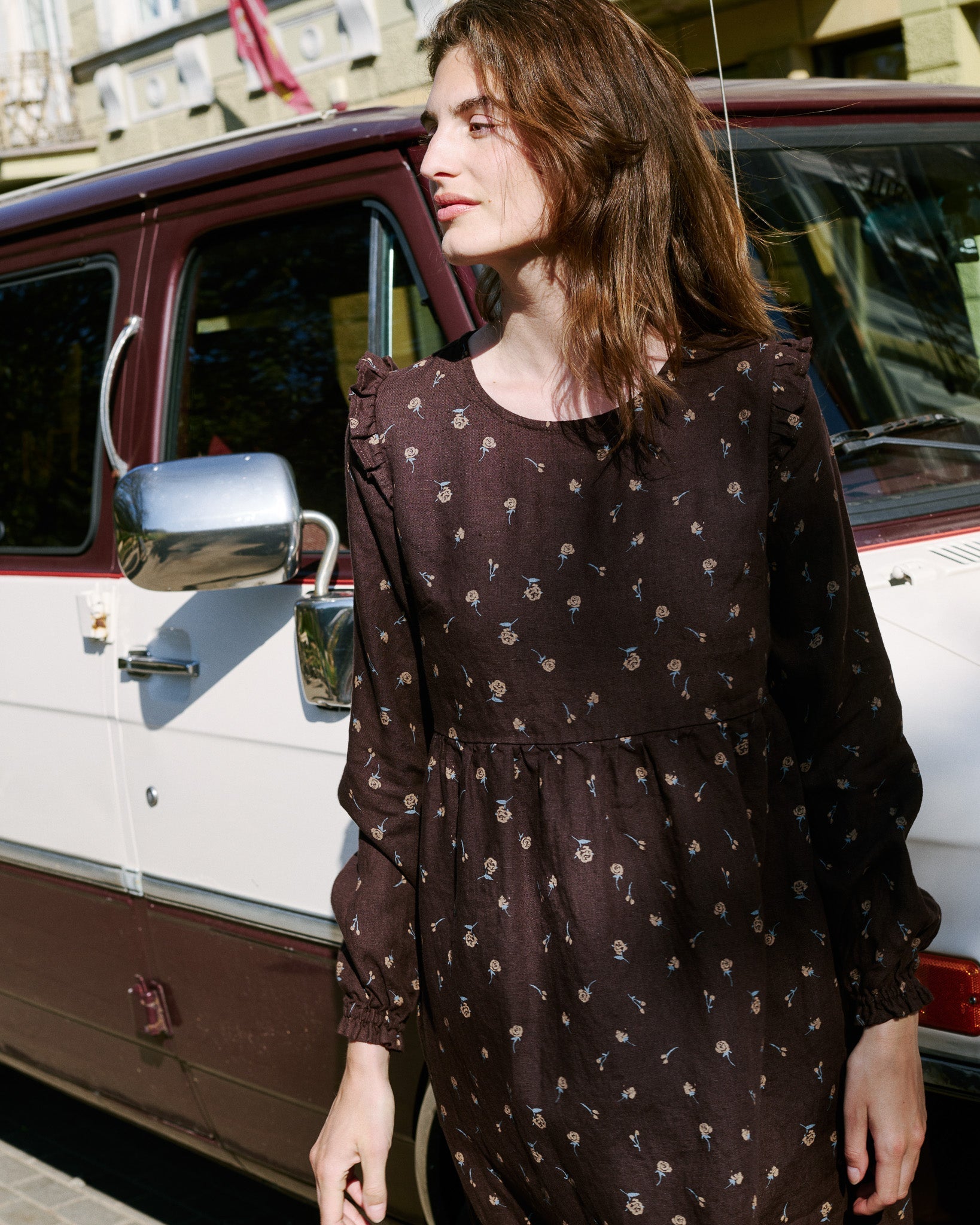 • The most darling linen dress with tiny ruffles at the shoulders.