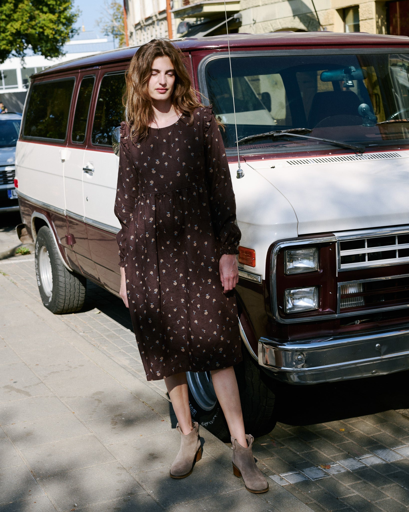 • Model is wearing a dress in espresso rose.
