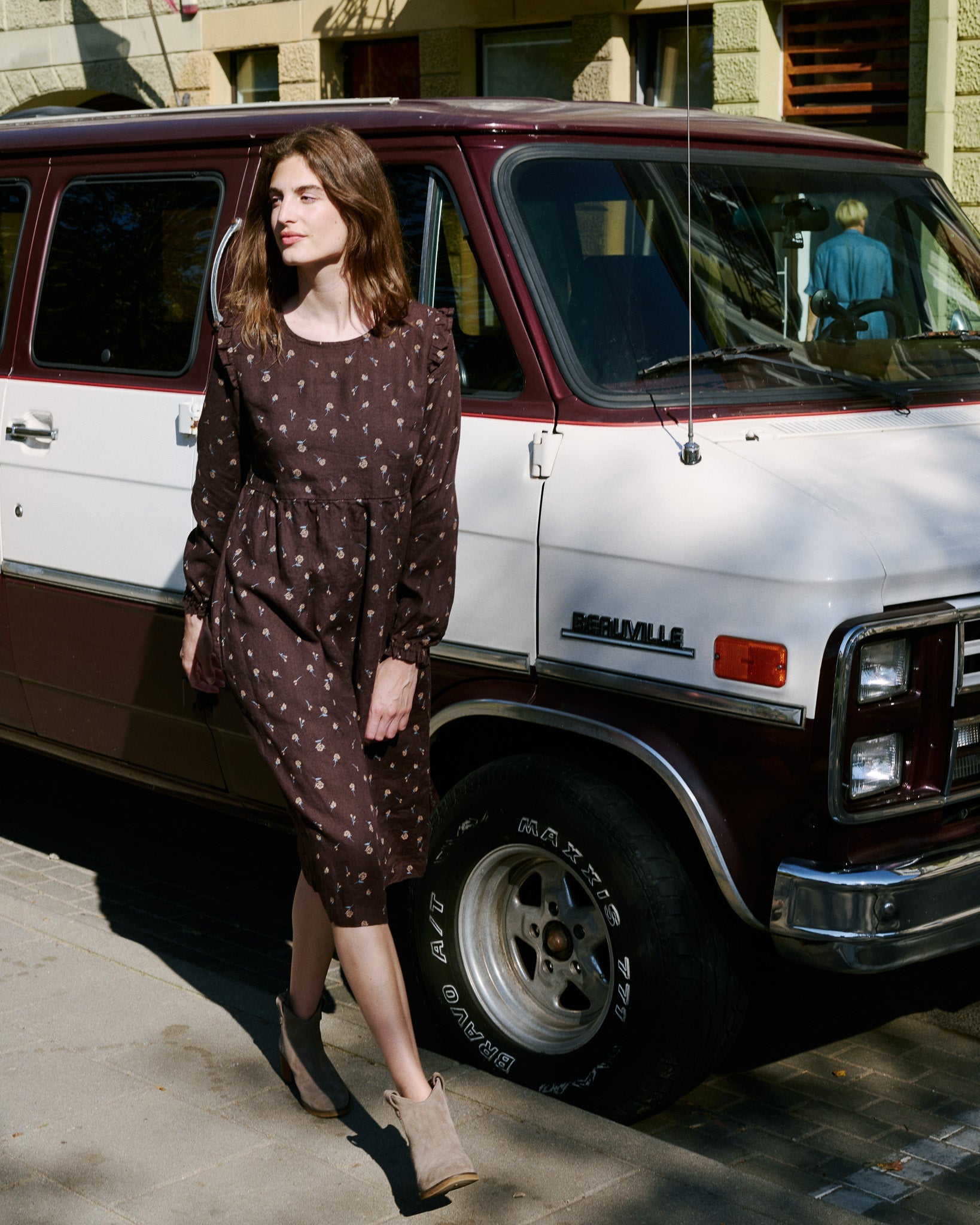 • Model is wearing a dress in creamy brown.