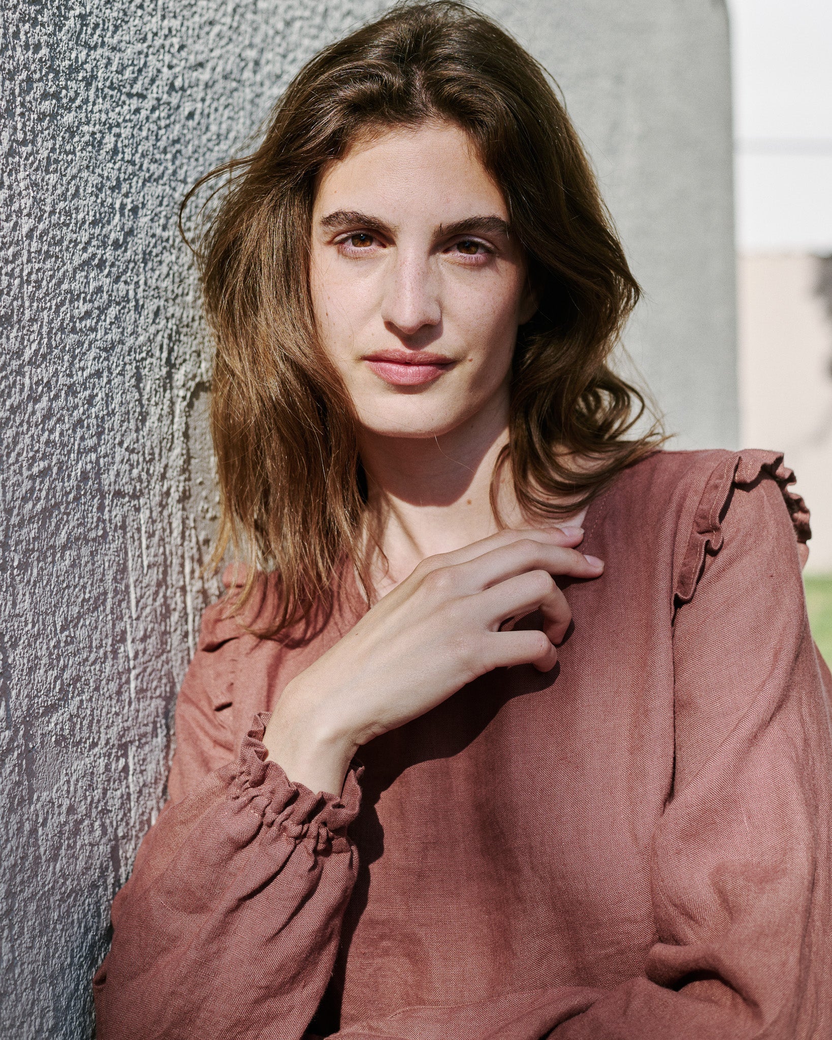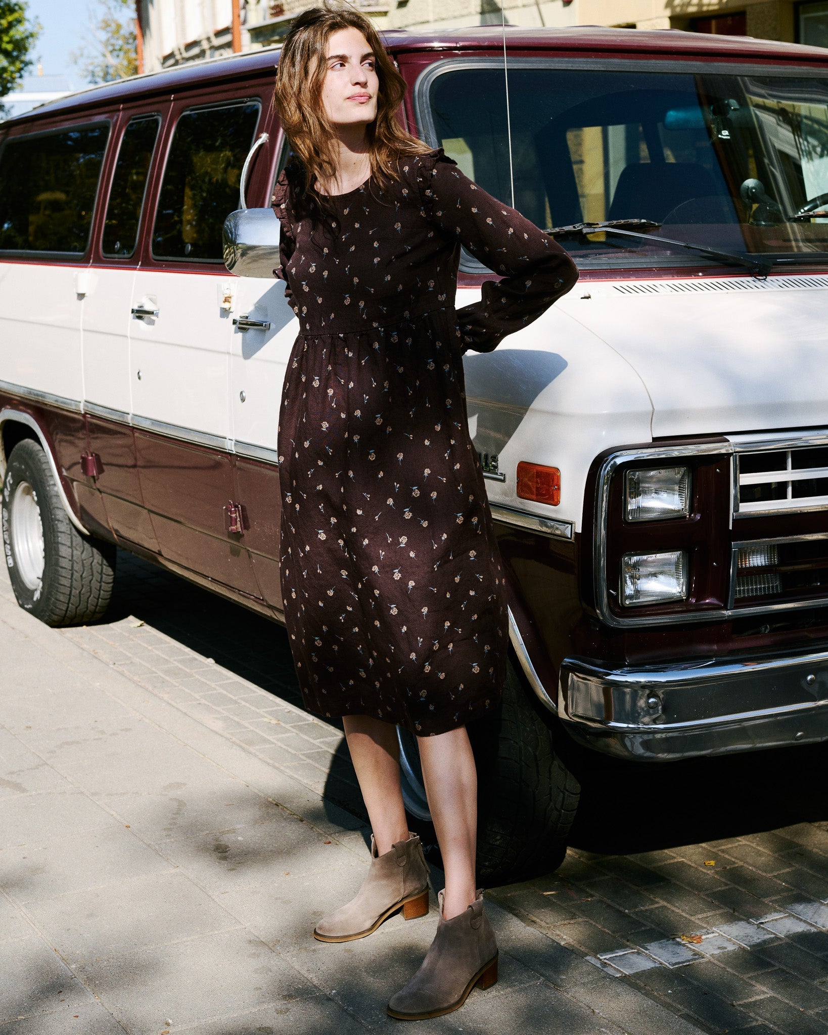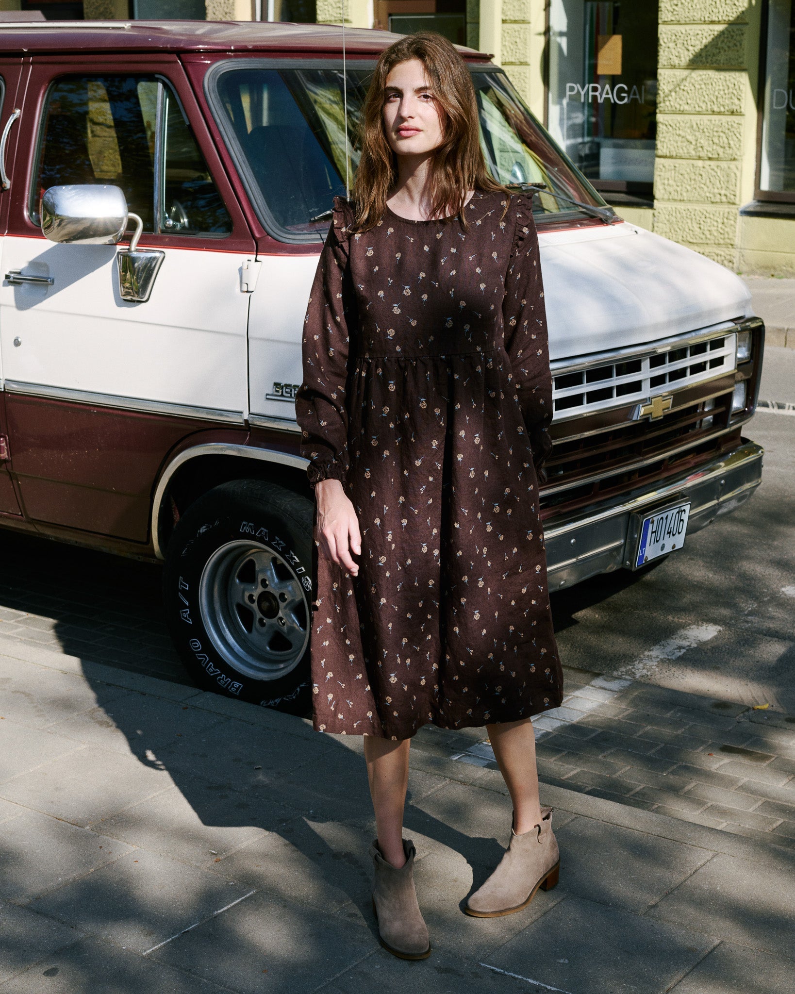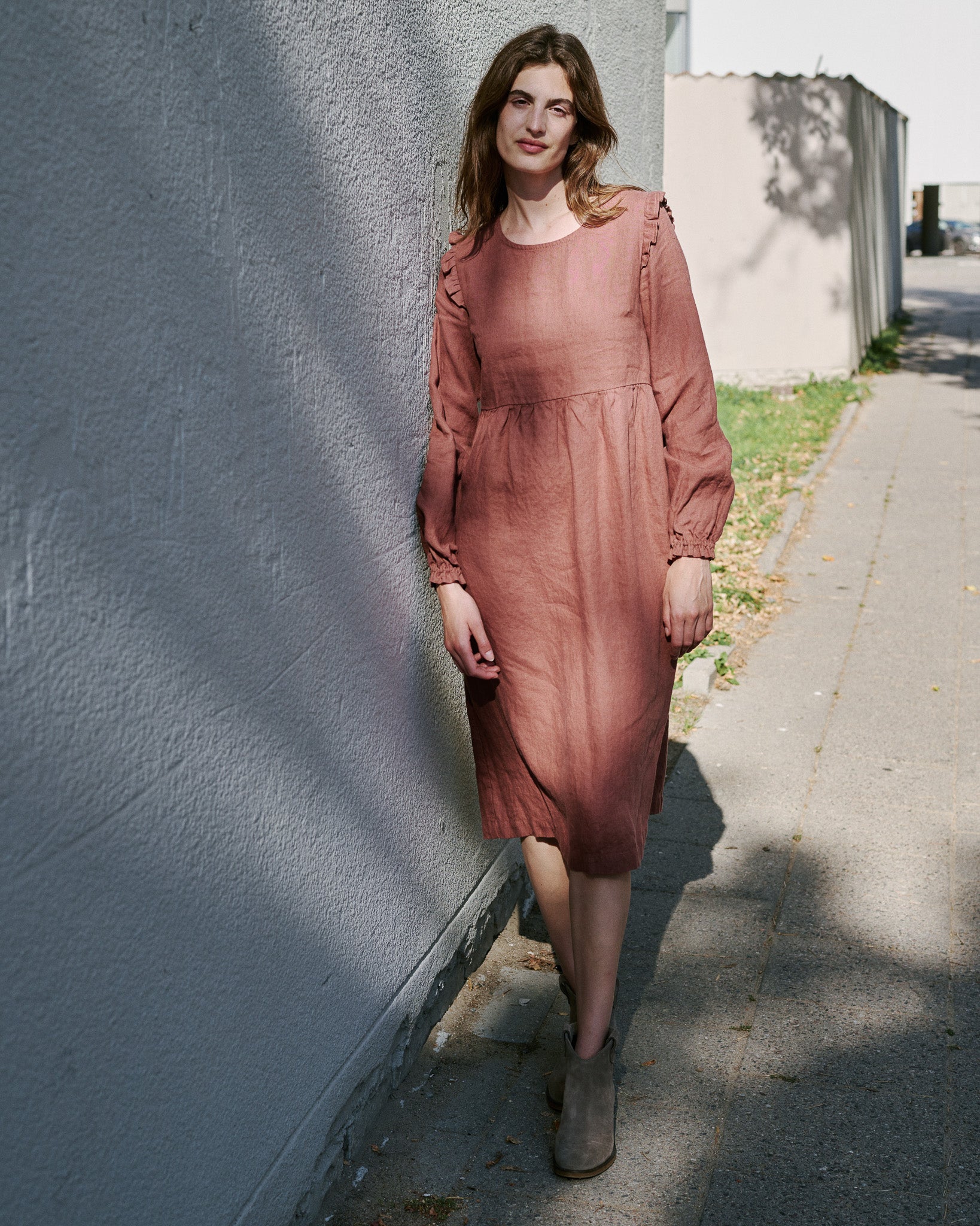 • The most darling linen dress with tiny ruffles at the shoulders.