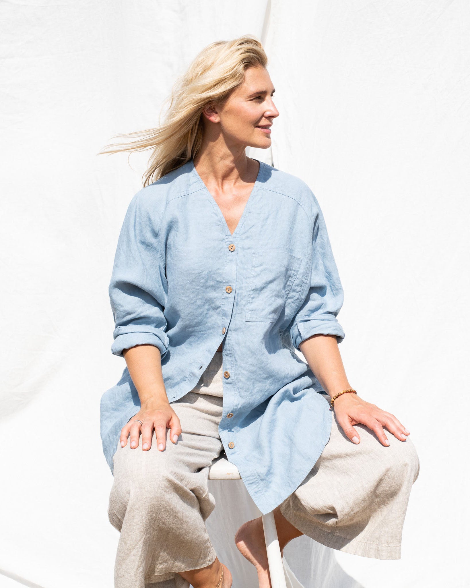 • Oversized, easy, drapey, relaxed-fit linen shirt (or tunic) for everyday wear.