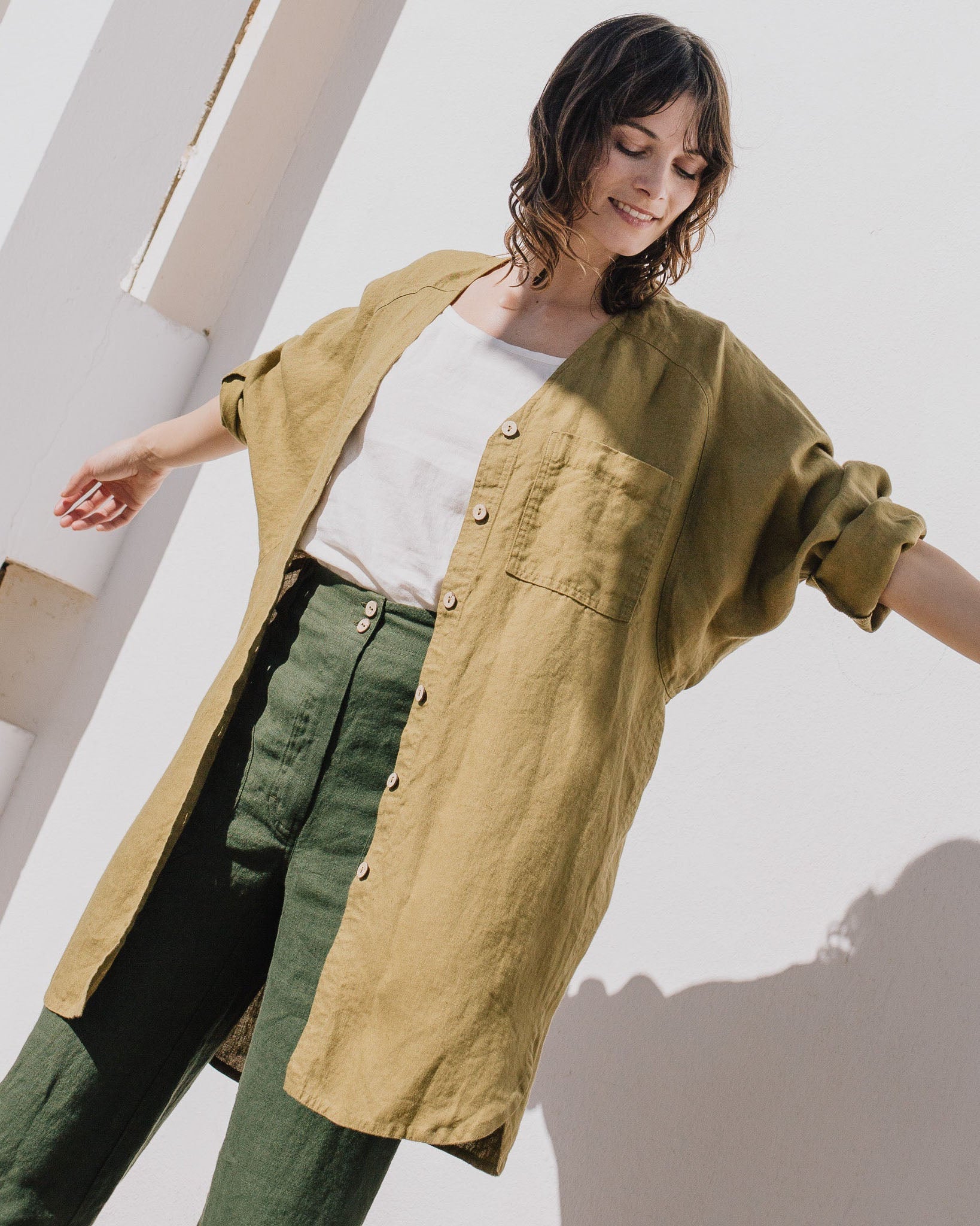 • Oversized, easy, drapey, relaxed-fit linen shirt (or tunic) for everyday wear.