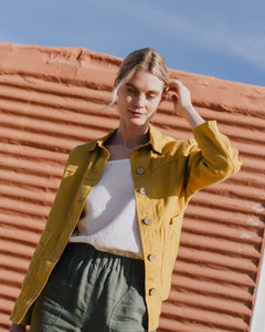 • Model is size S and wears a top in size S in honey, paired with OIA skirt in juniper green and Helsinki jacket in honey.