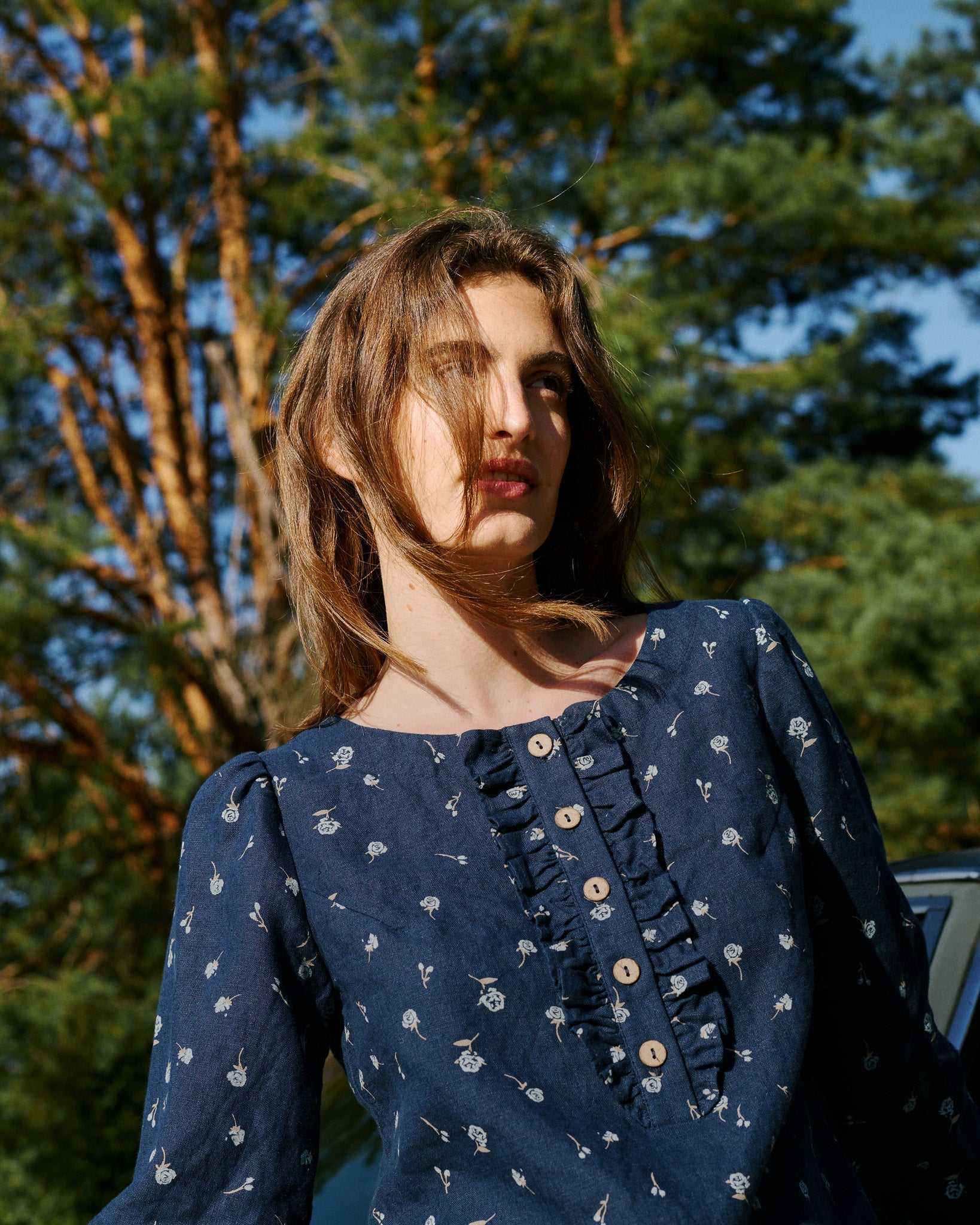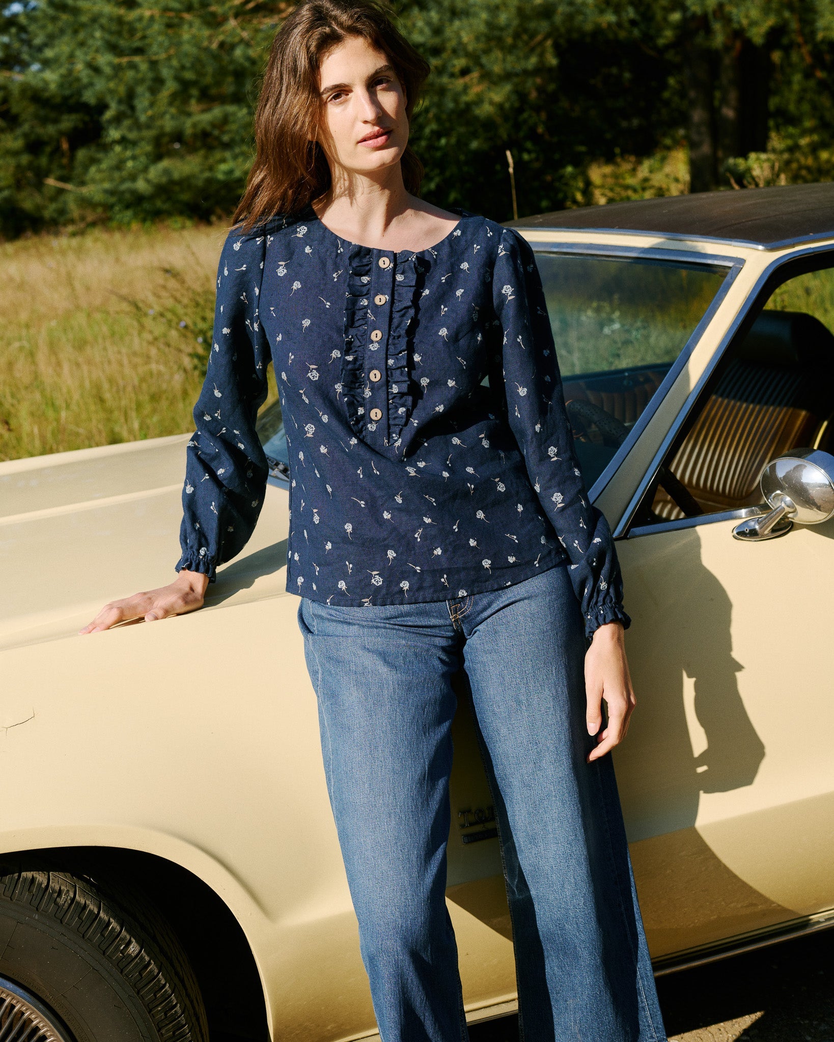 • Gorgeous linen top with a subtle rounded neckline and front frill.