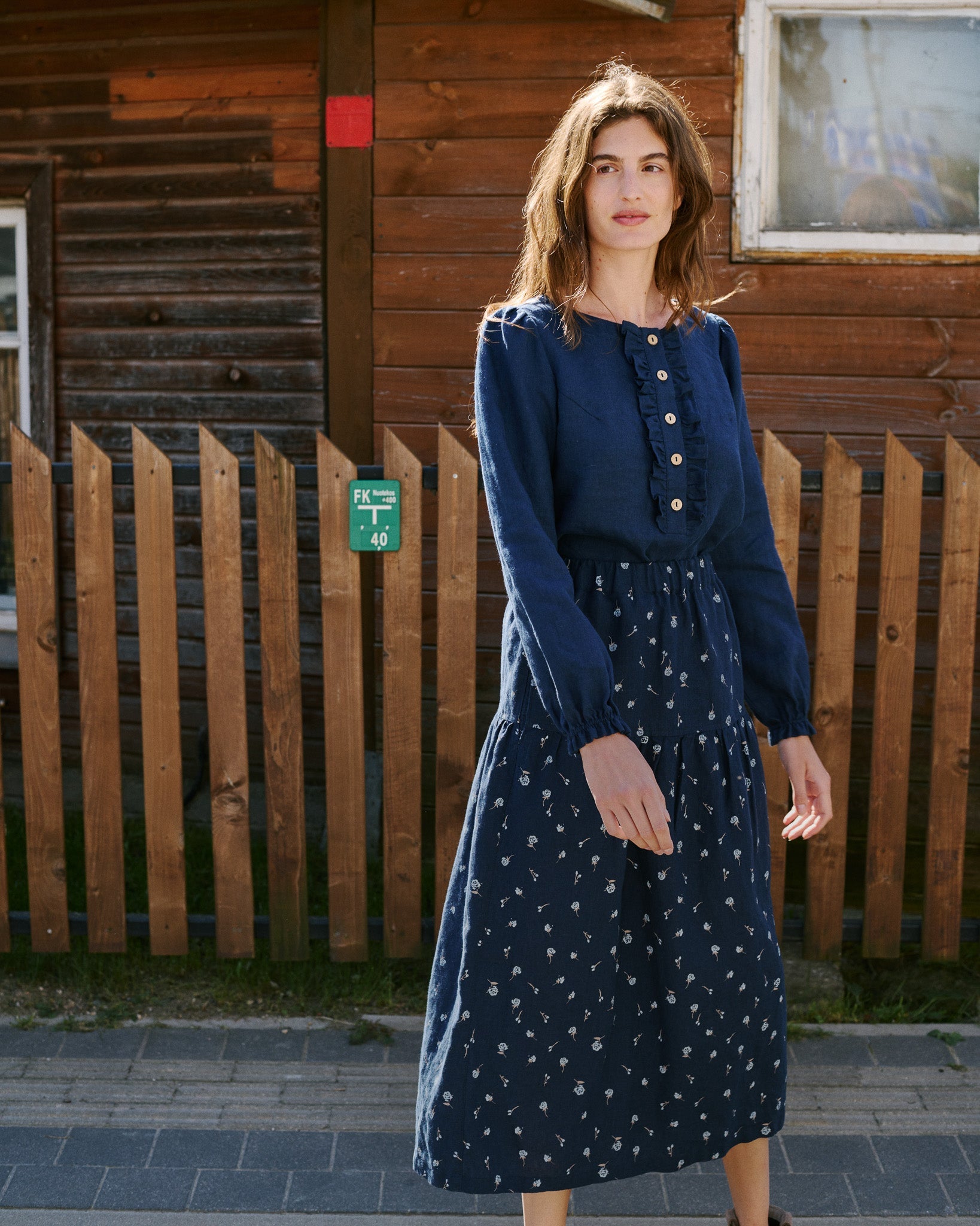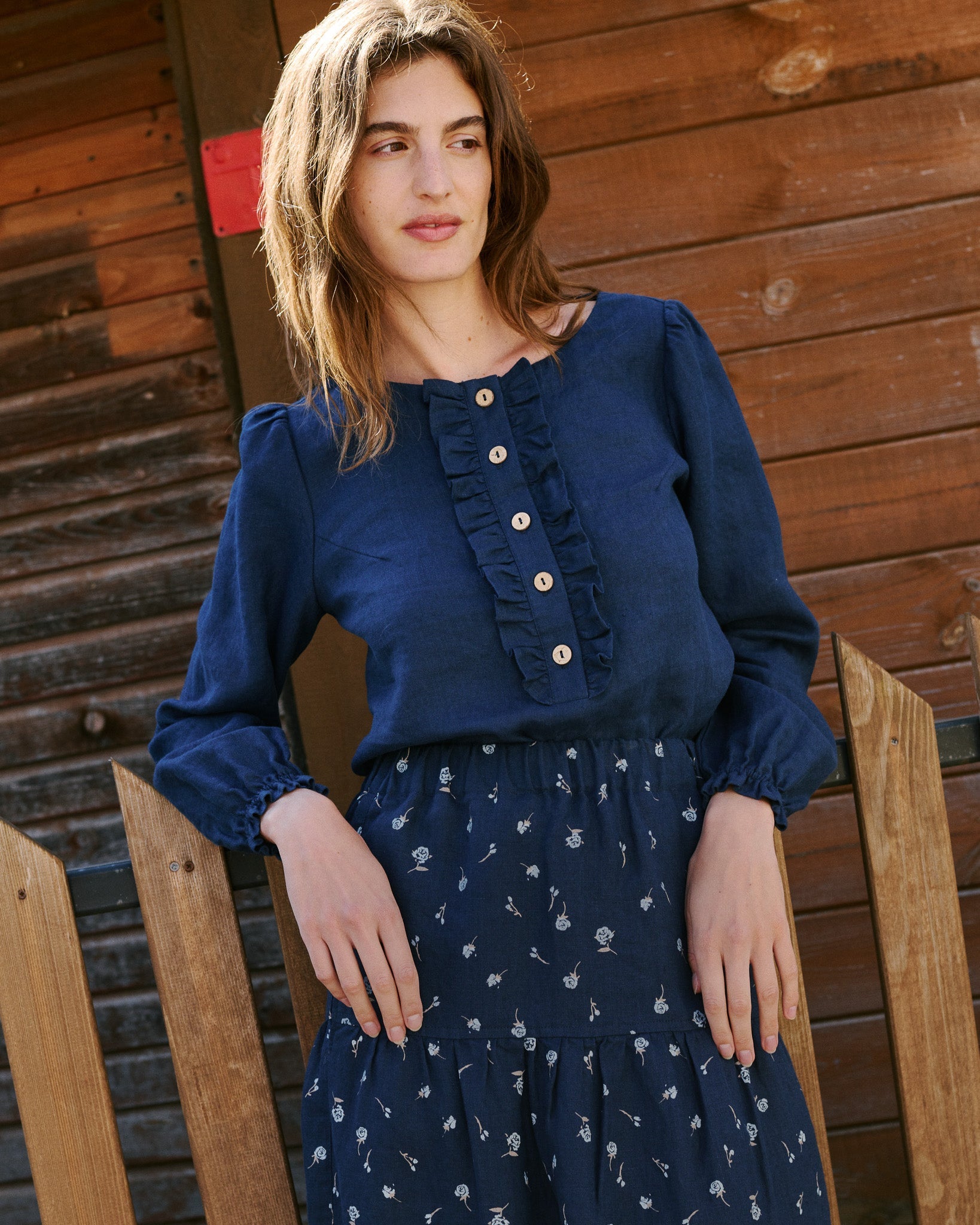 • Model is wearing a shirt in admiral blue, paired with Anjali skirt in midnight rose.