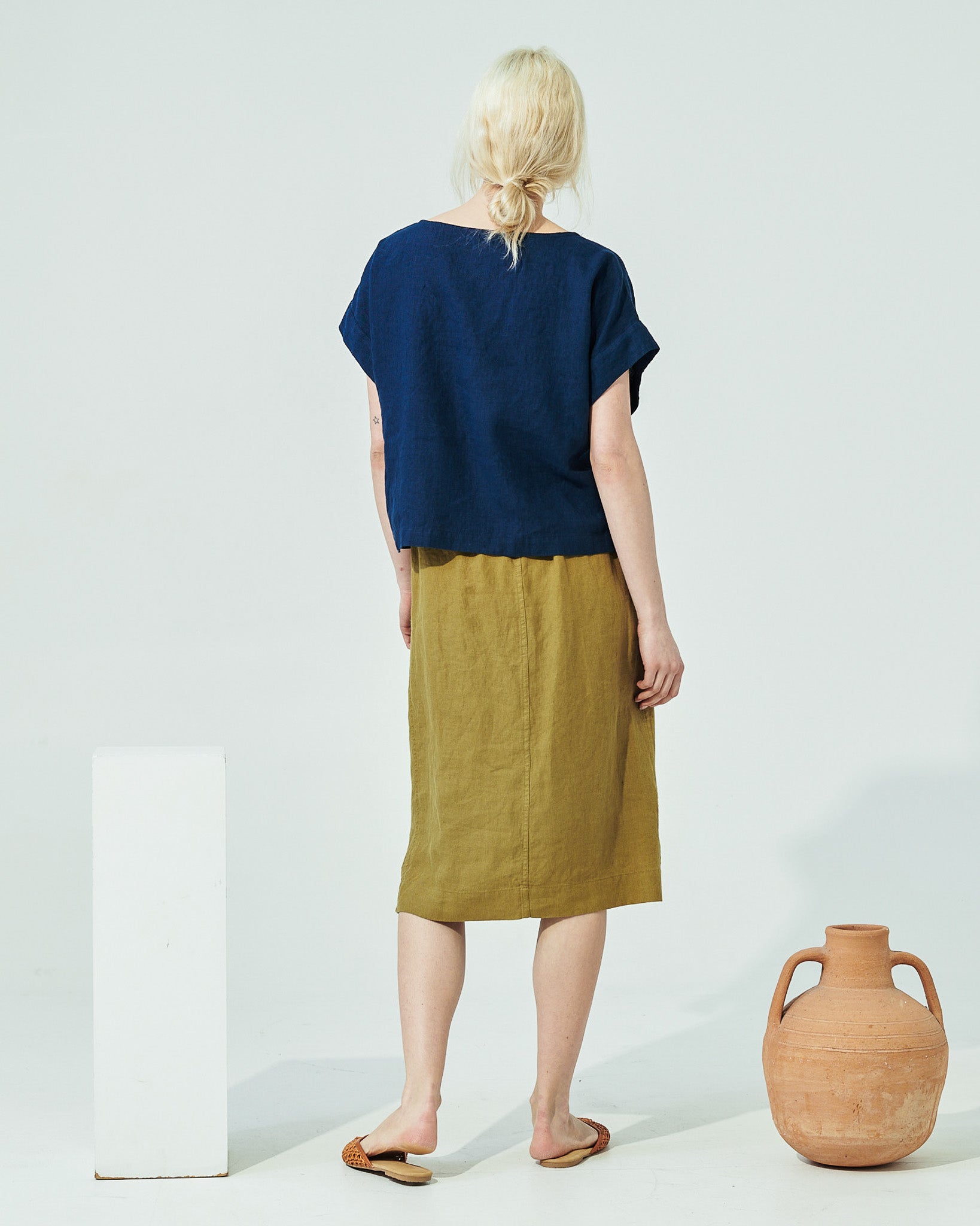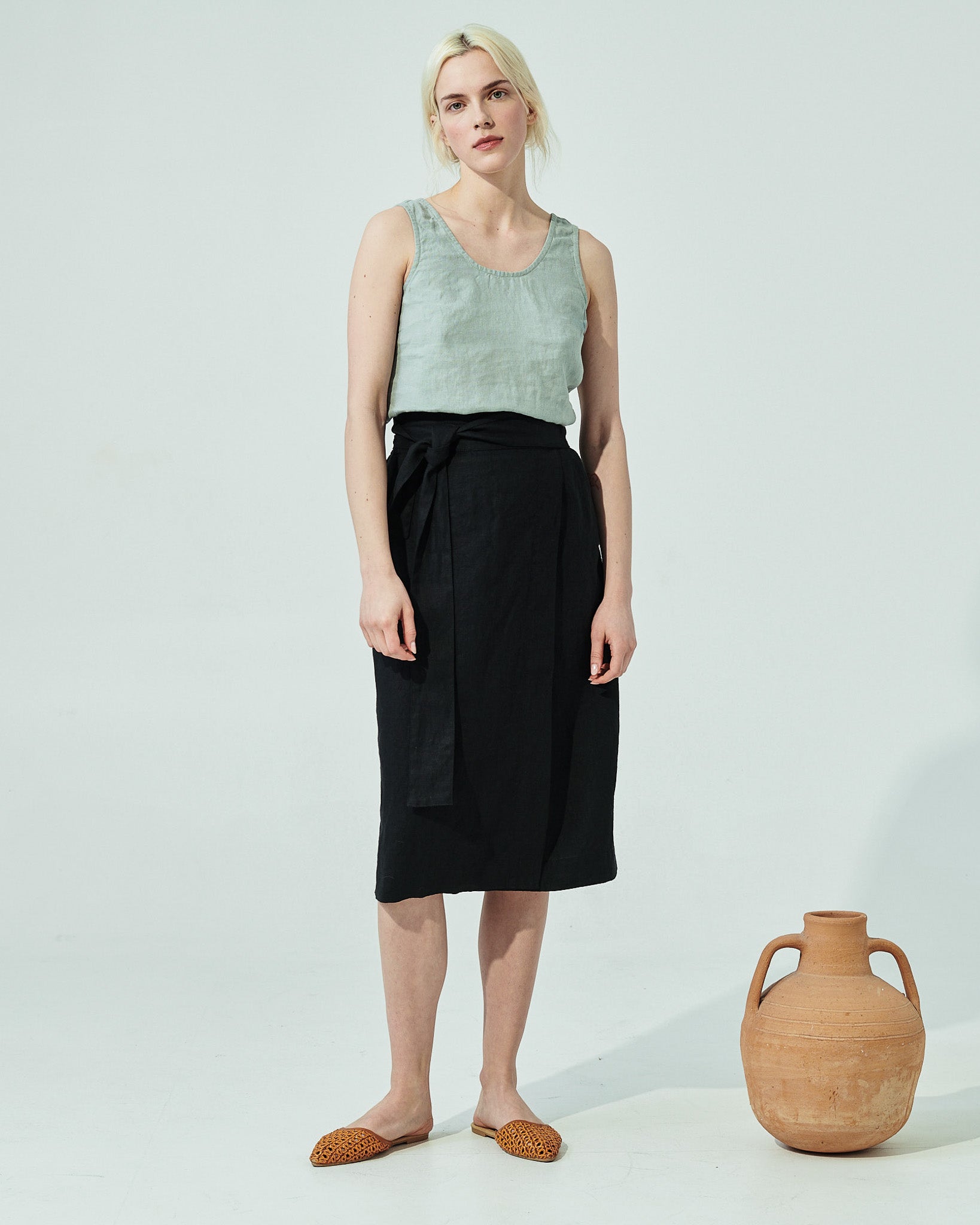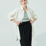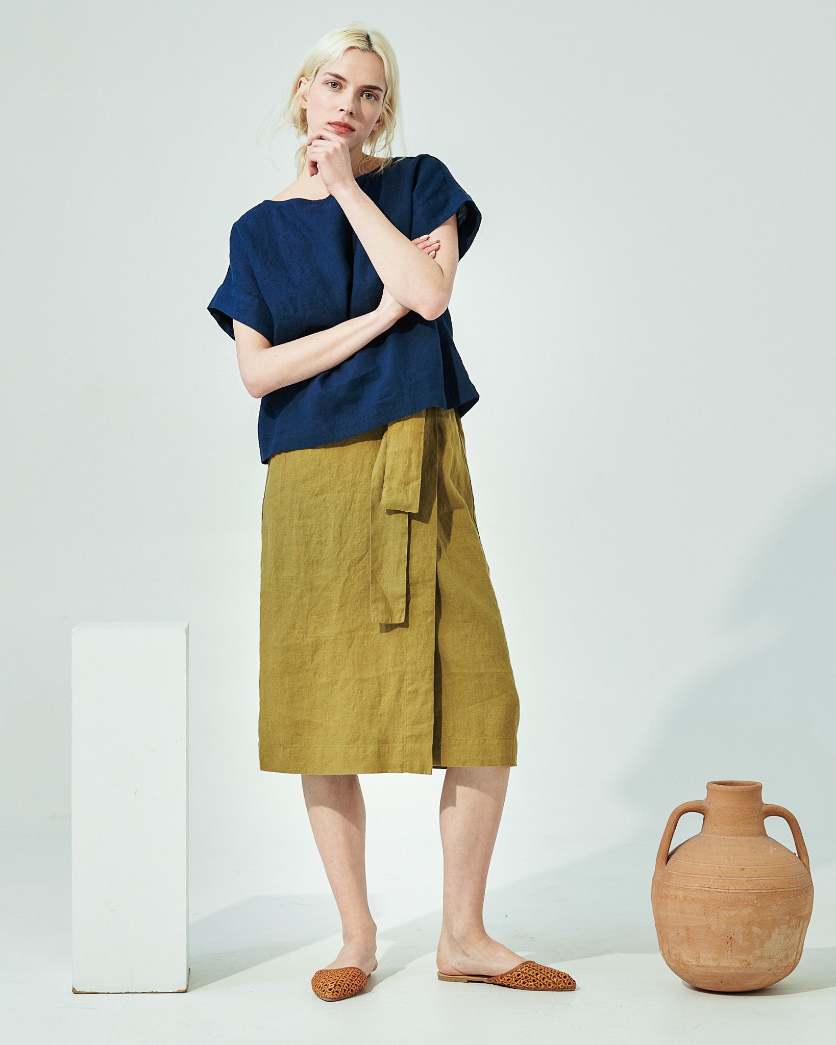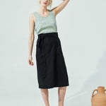 • Faux-wrap linen skirt for hassle free movements.