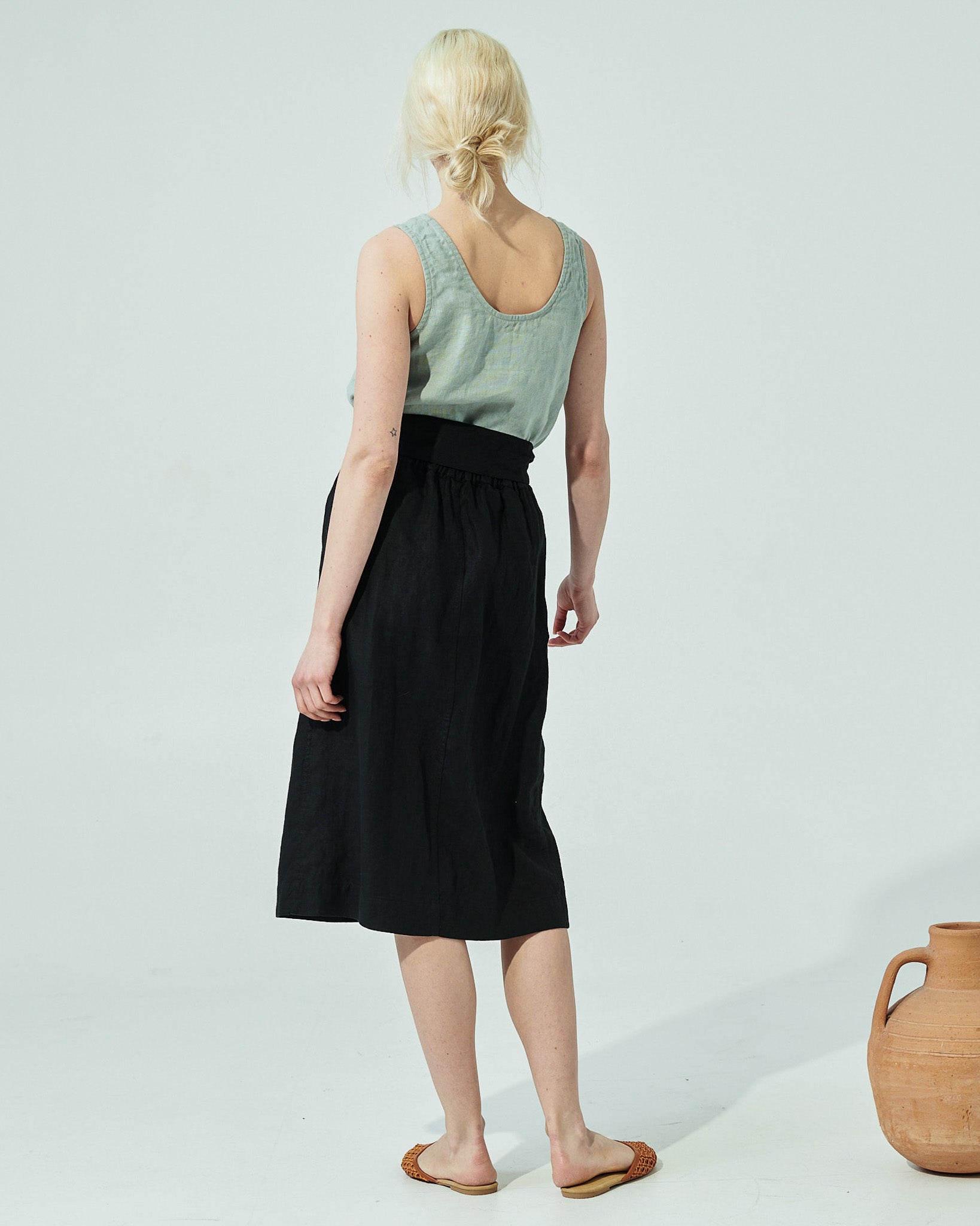 • Model is size S and wears a skirt in deepest black, paired with Porto tank top in succulent green.