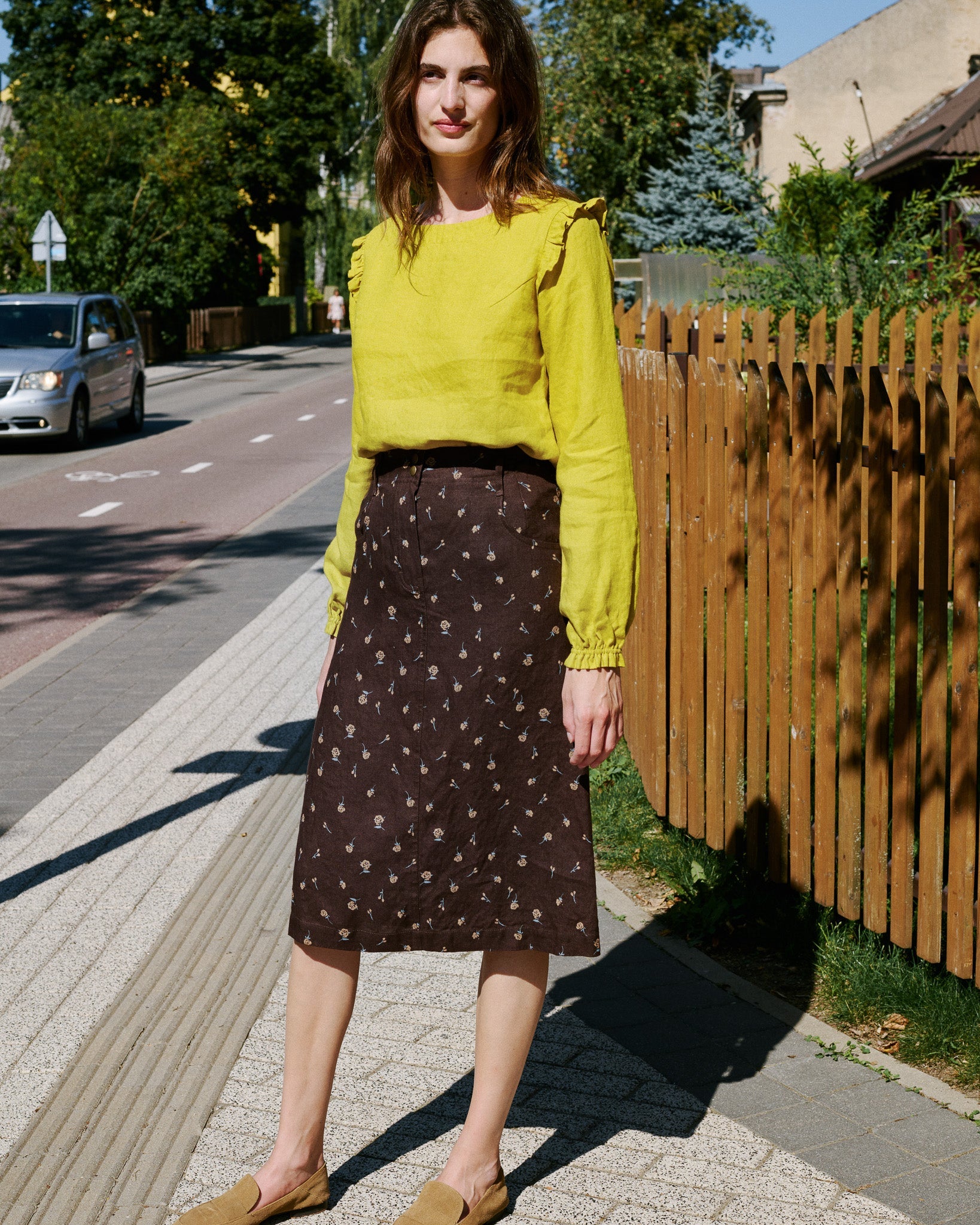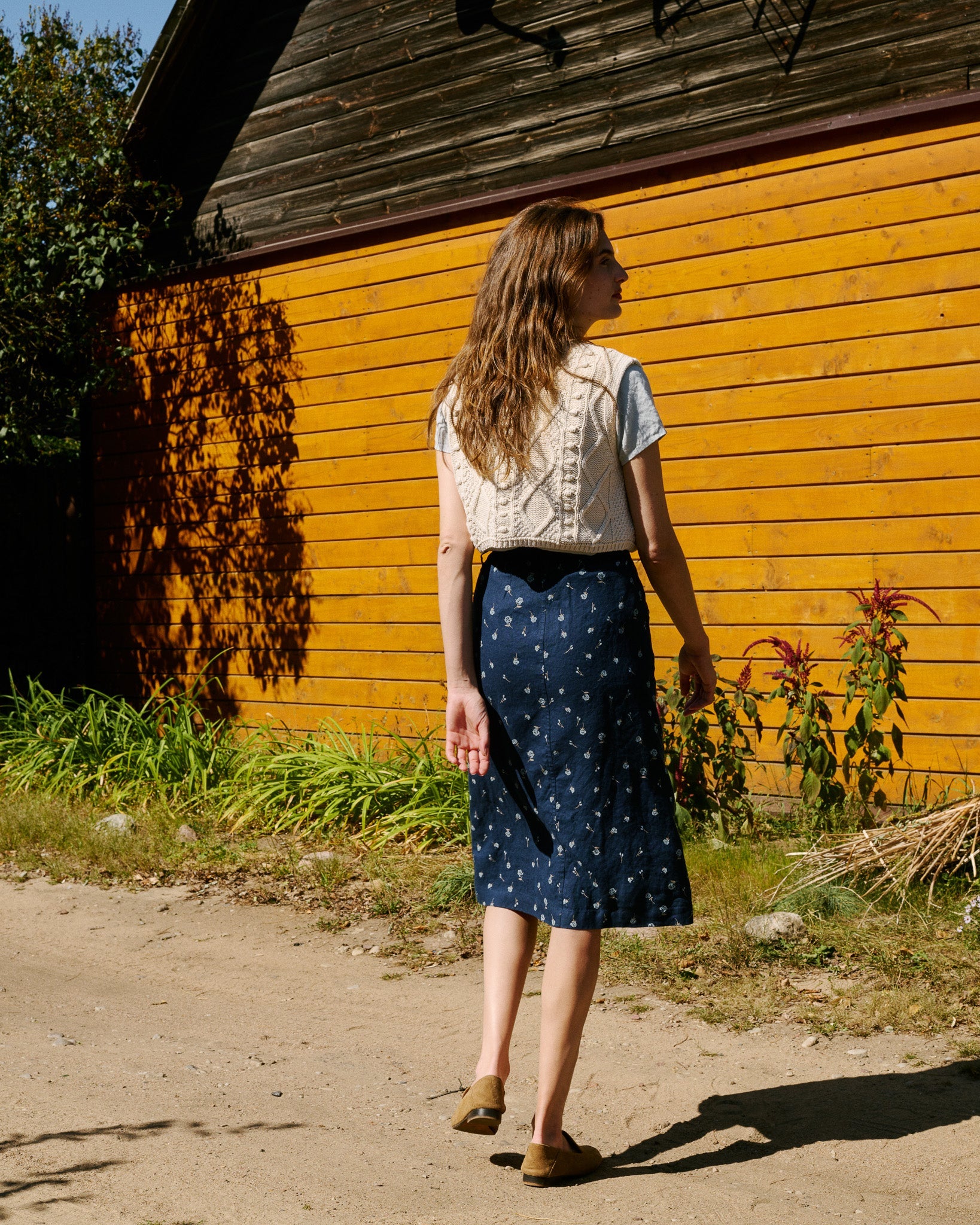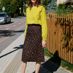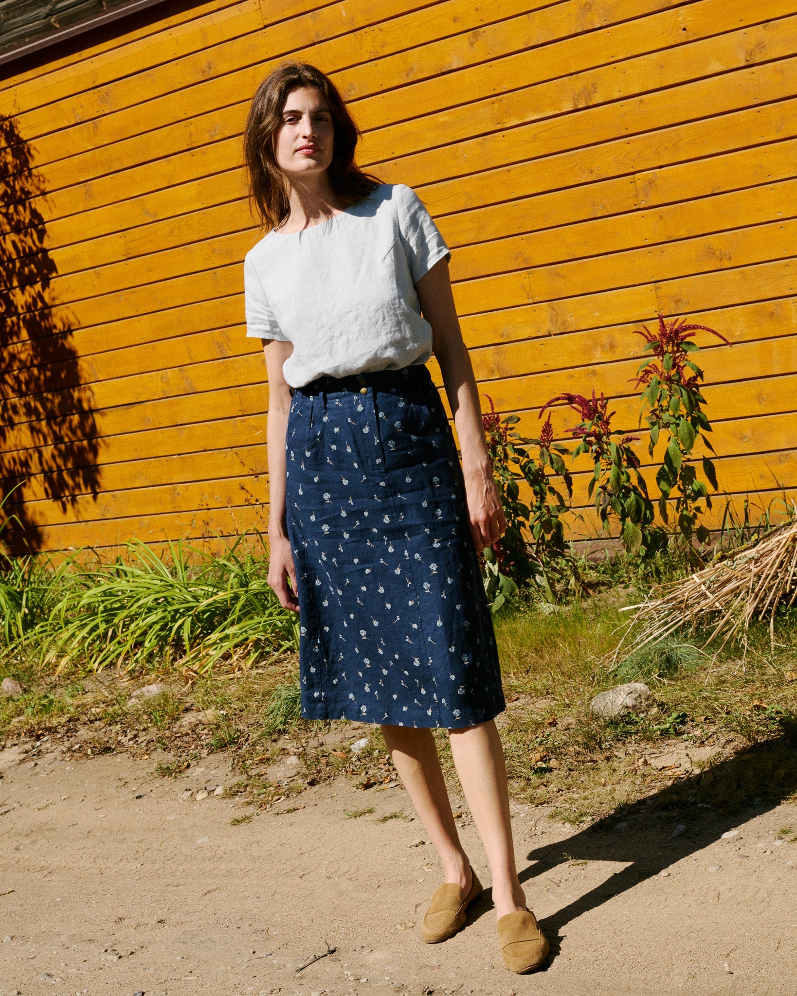 • Midi-length, slightly a-line skirt, gathered into a comfortable elastic waistband at the sides/back.