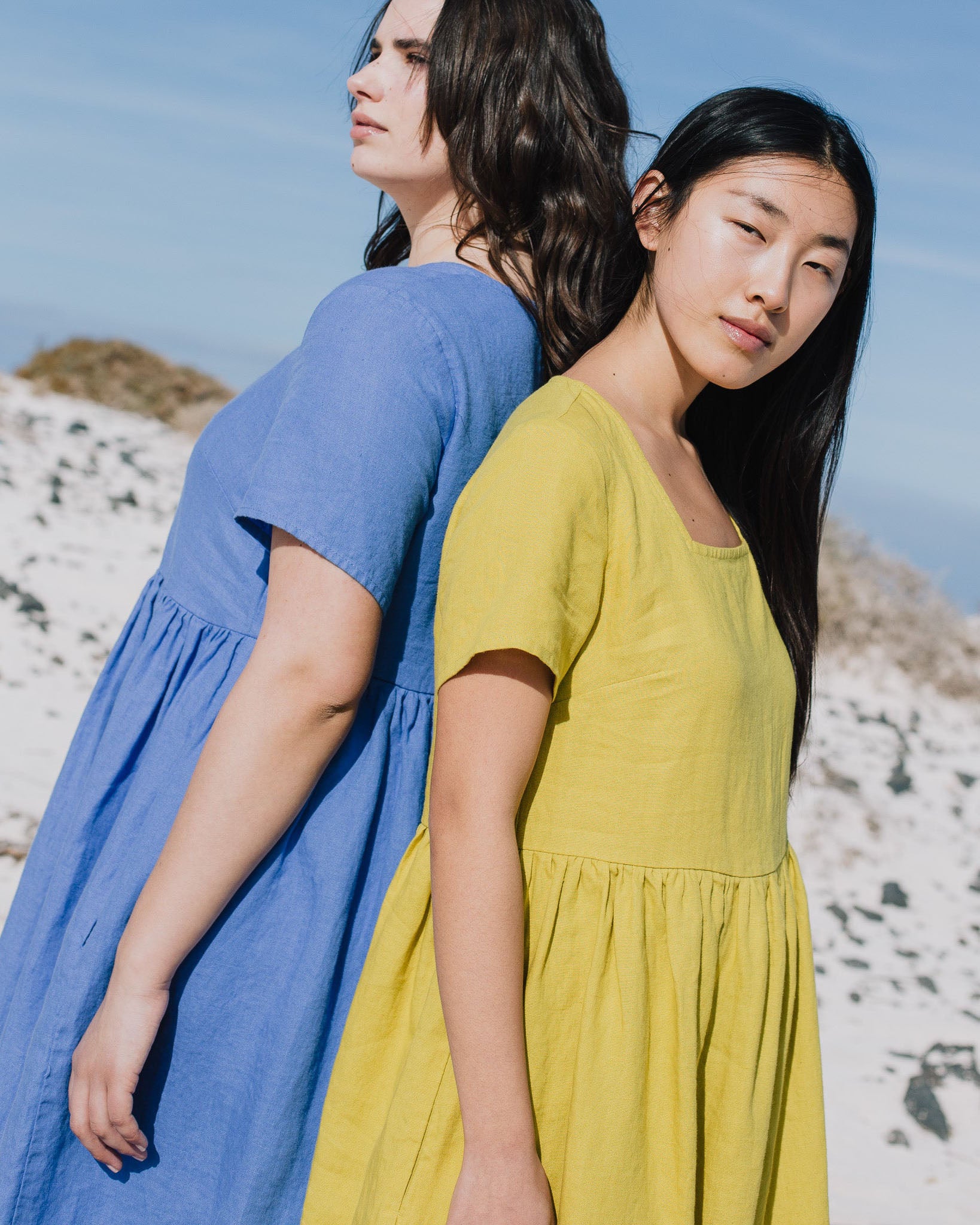 • Model is size S (165 cm/5.'5") and wears a dress in greenish mustard in size S. Model is size L and wears a dress in size L in cornflower blue.