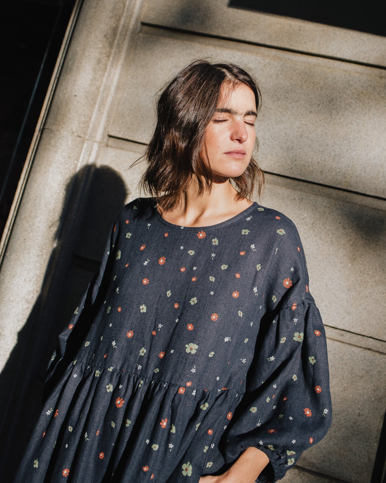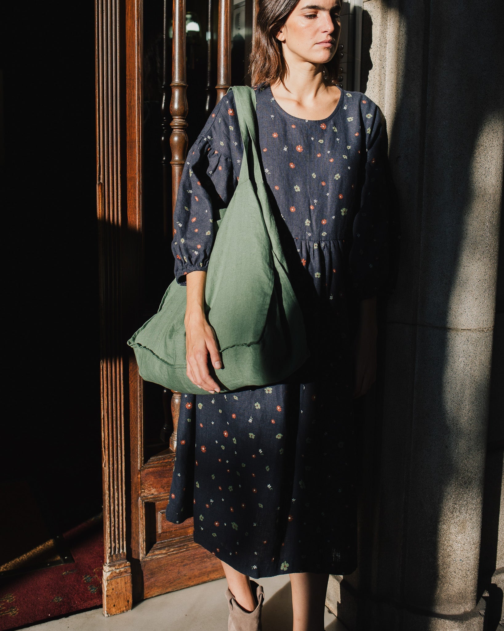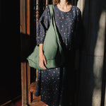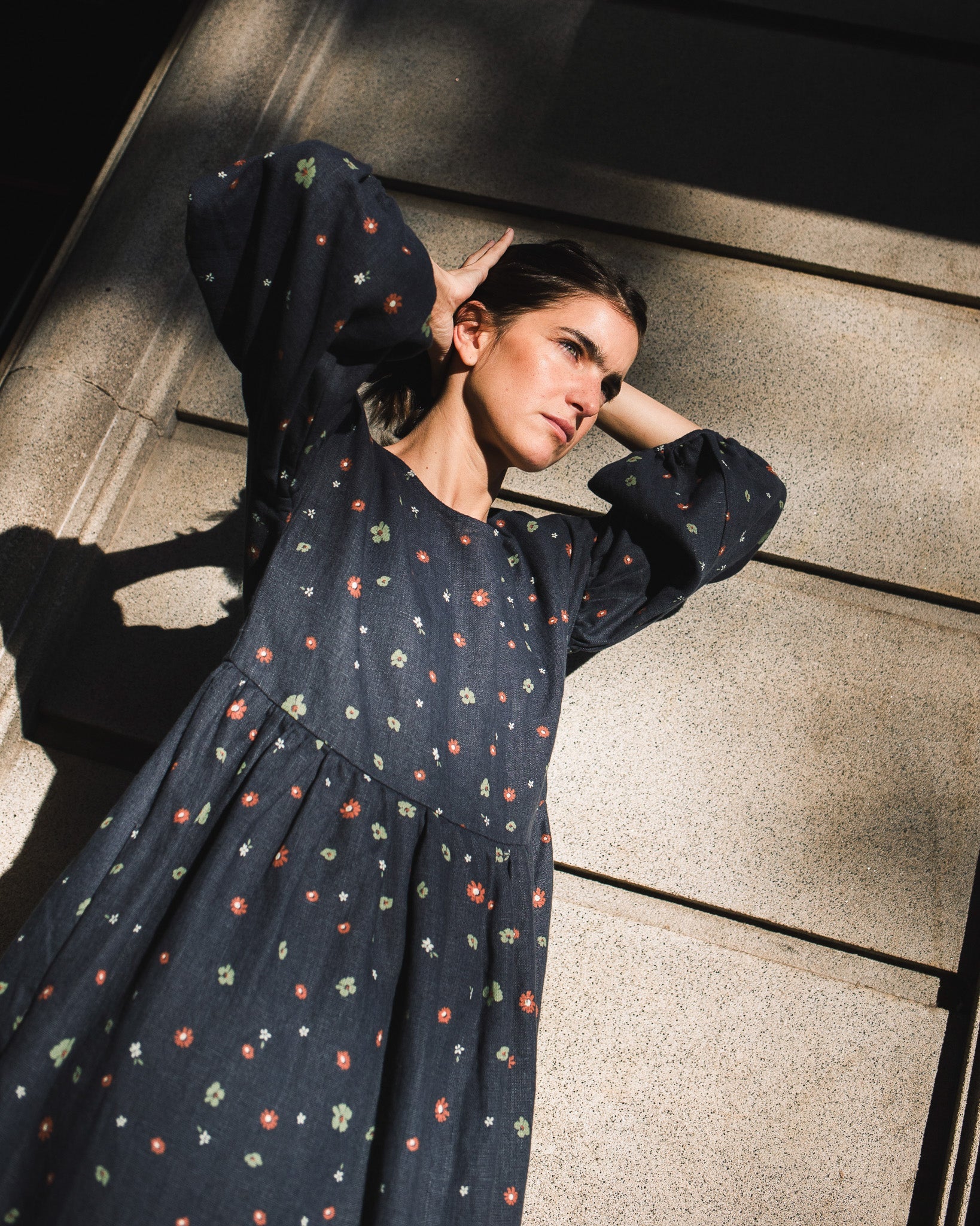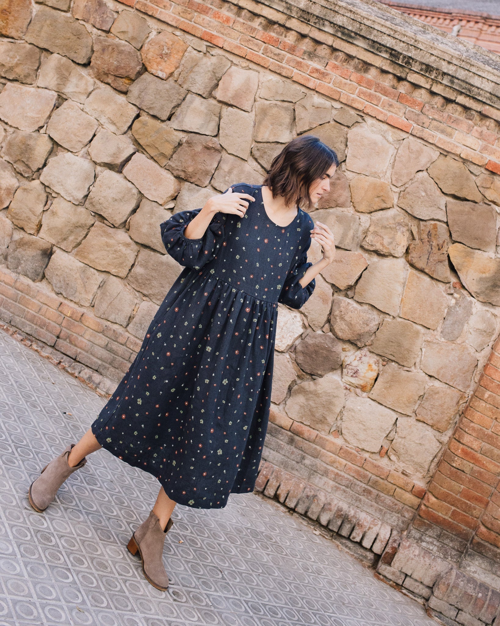• Model is wearing a dress in heavy linen 'night garden' pattern.