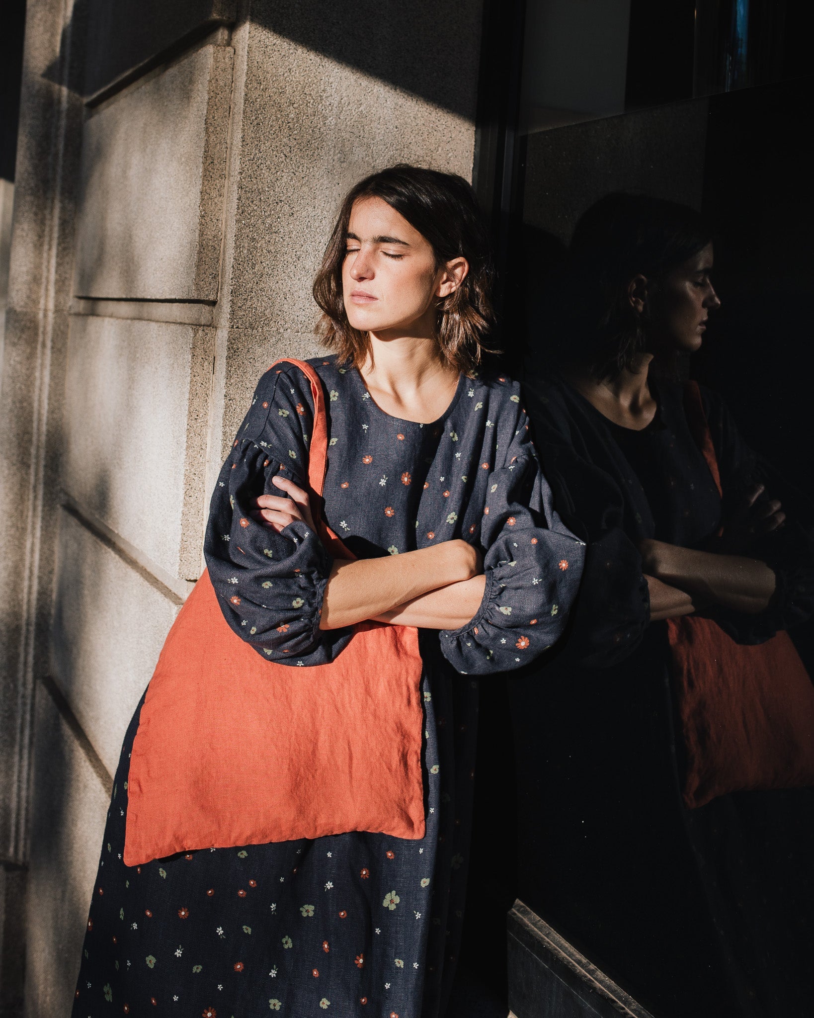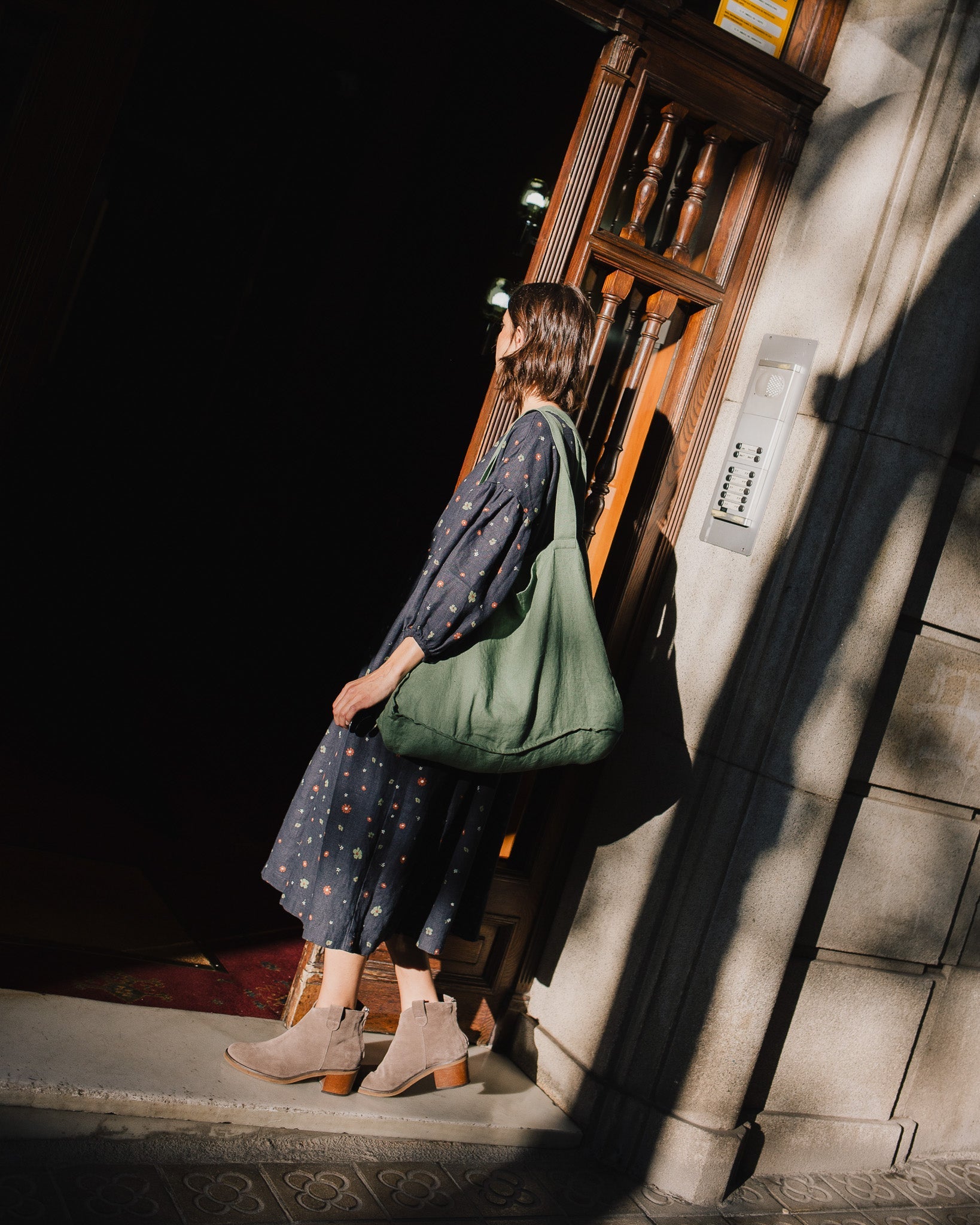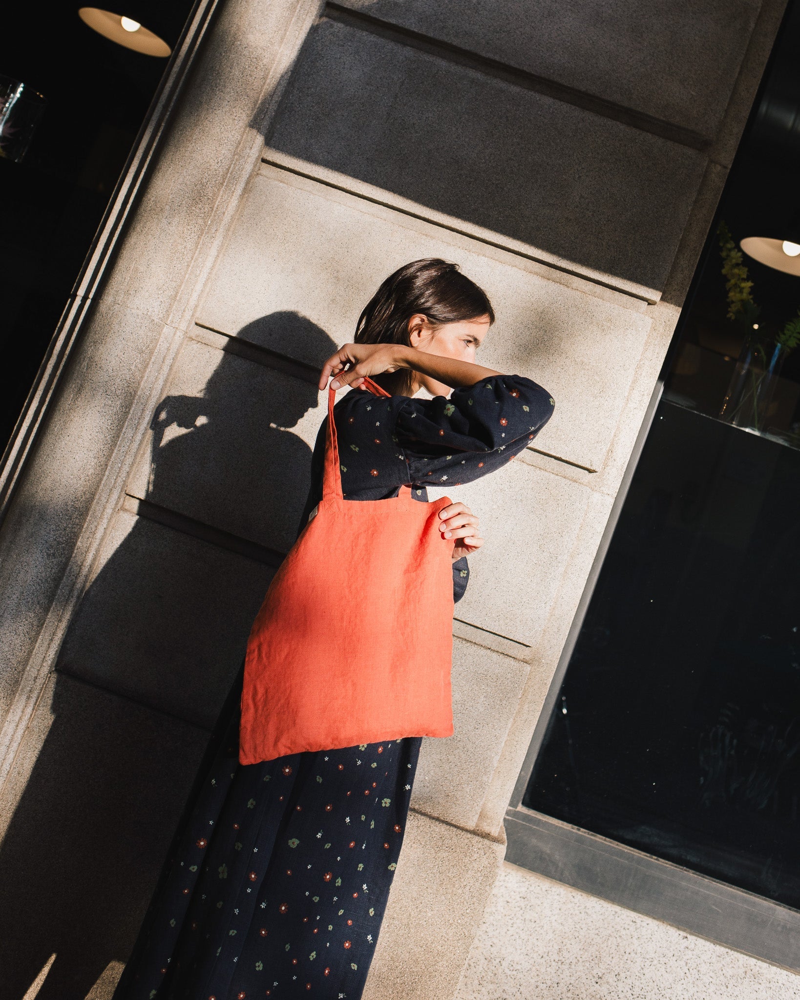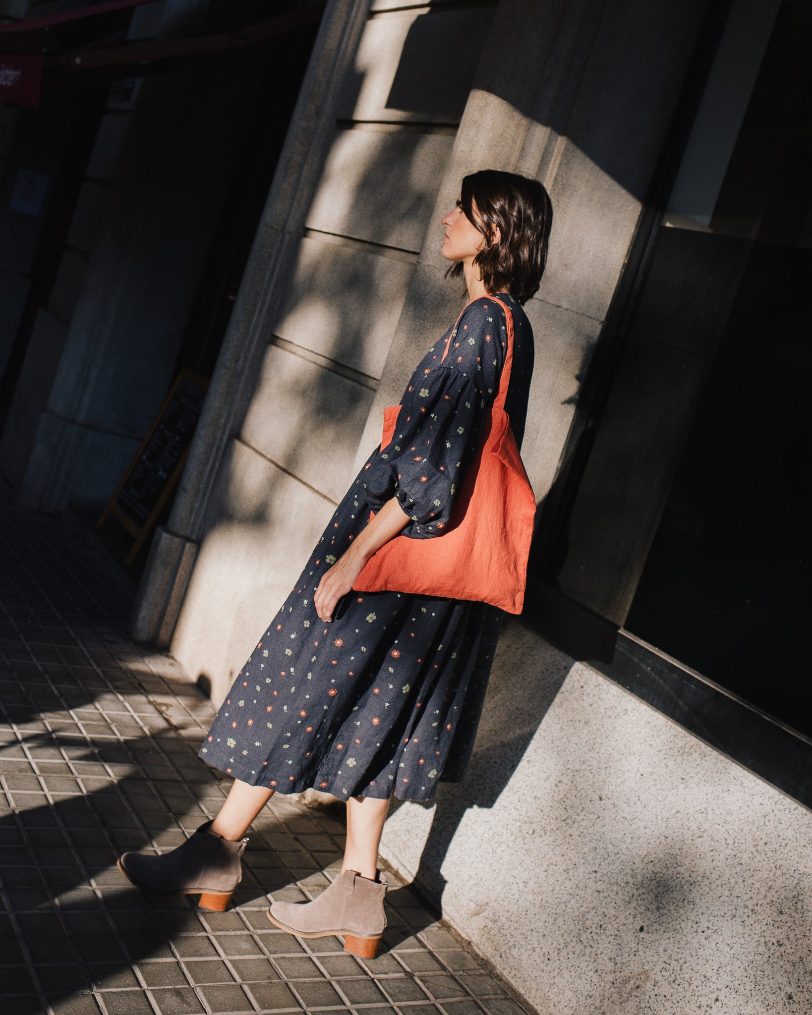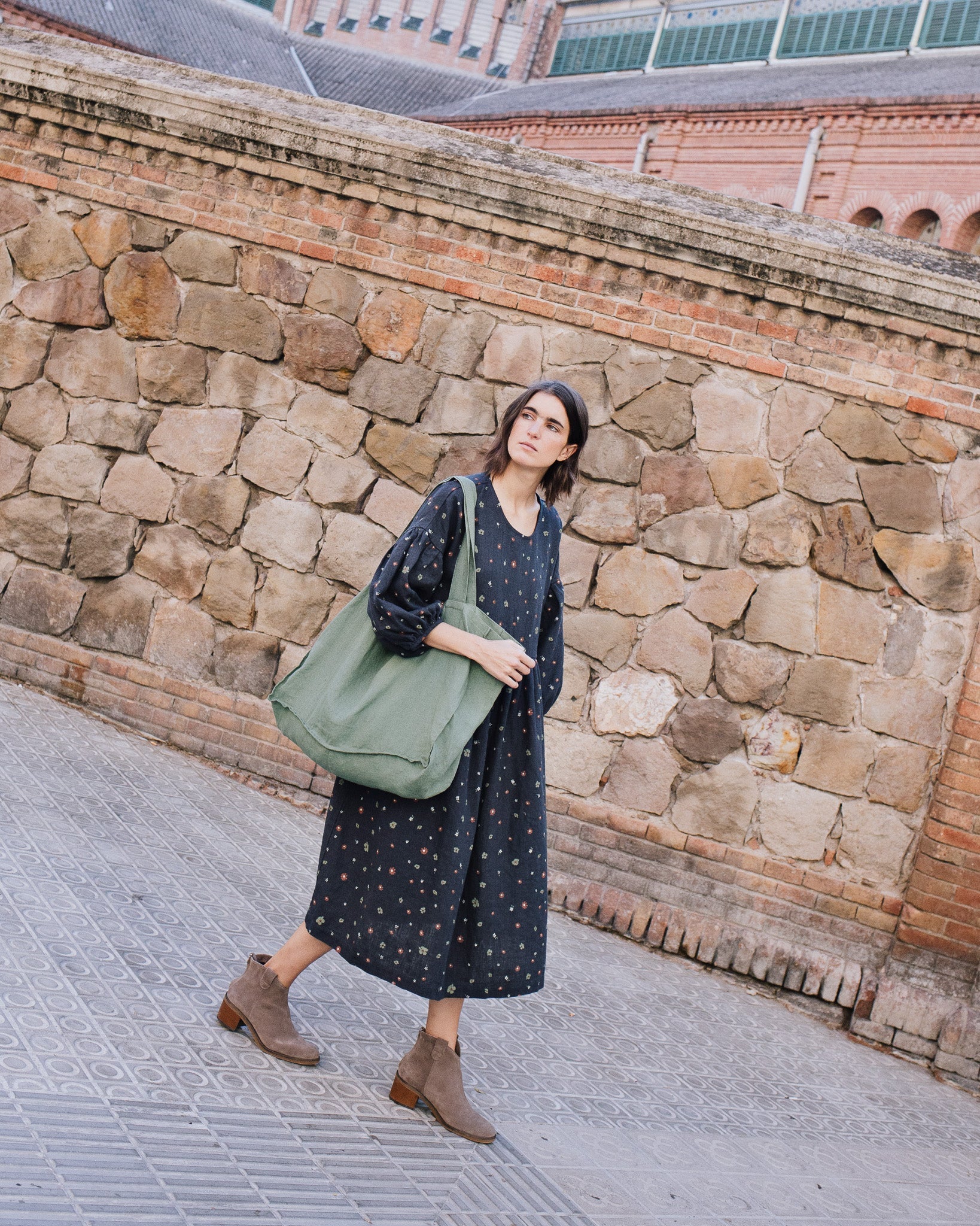 • Model is wearing a dress in heavy linen 'night garden' pattern.
