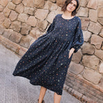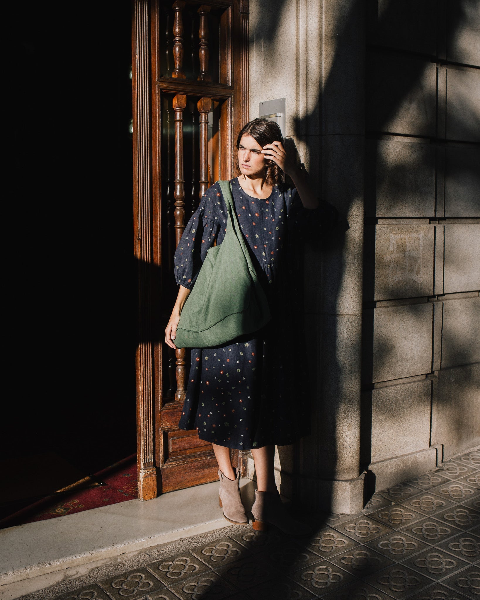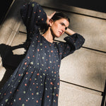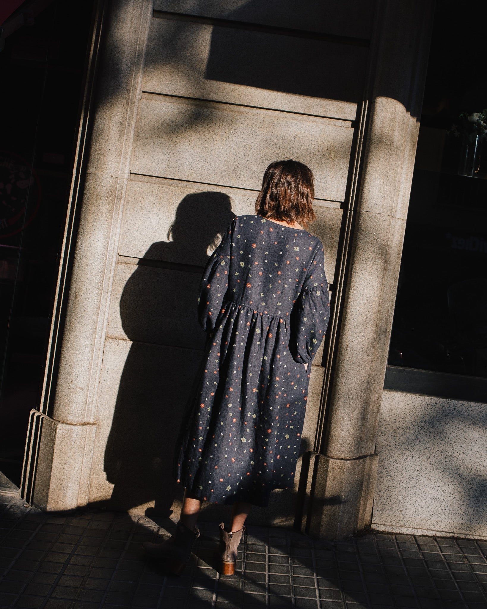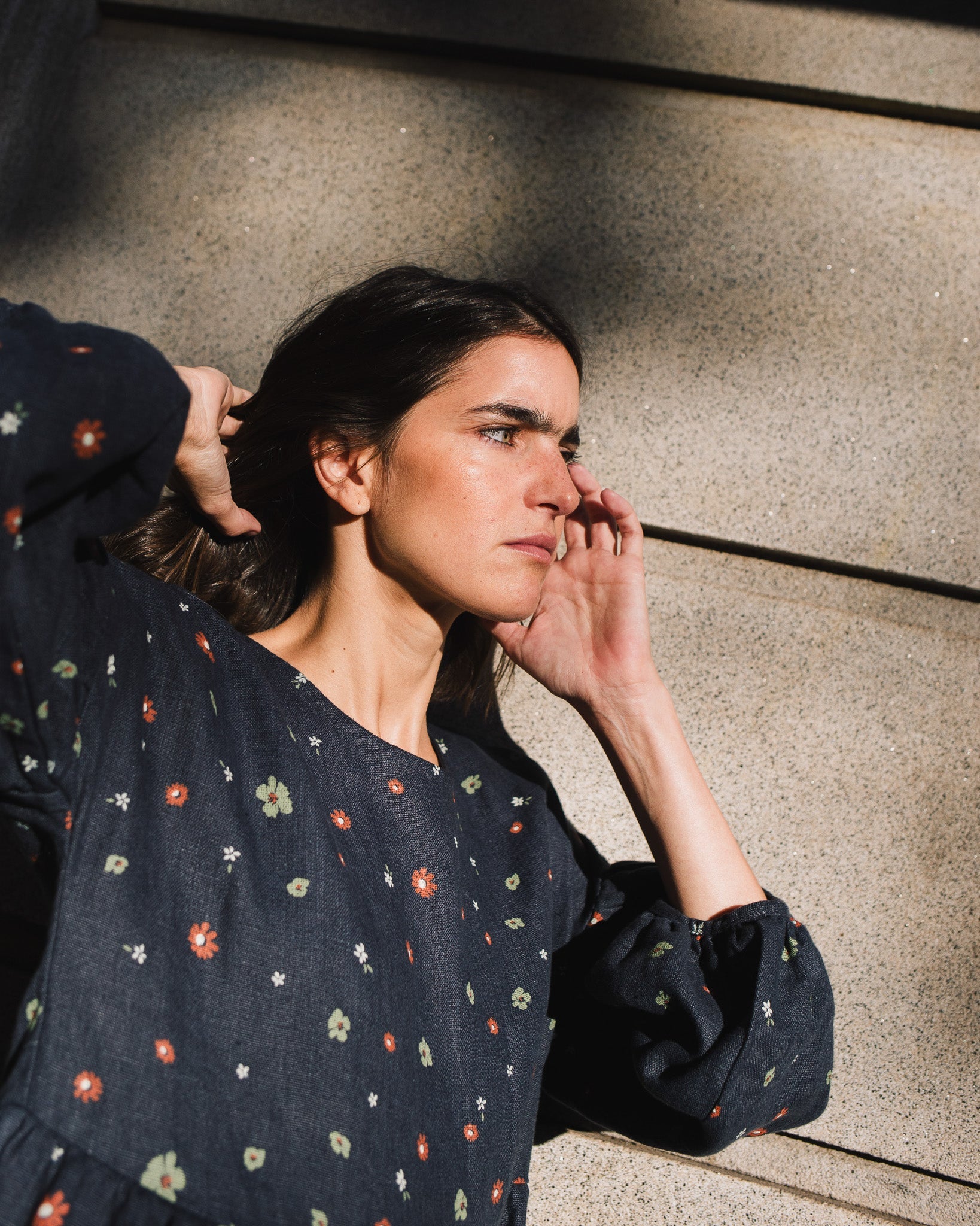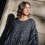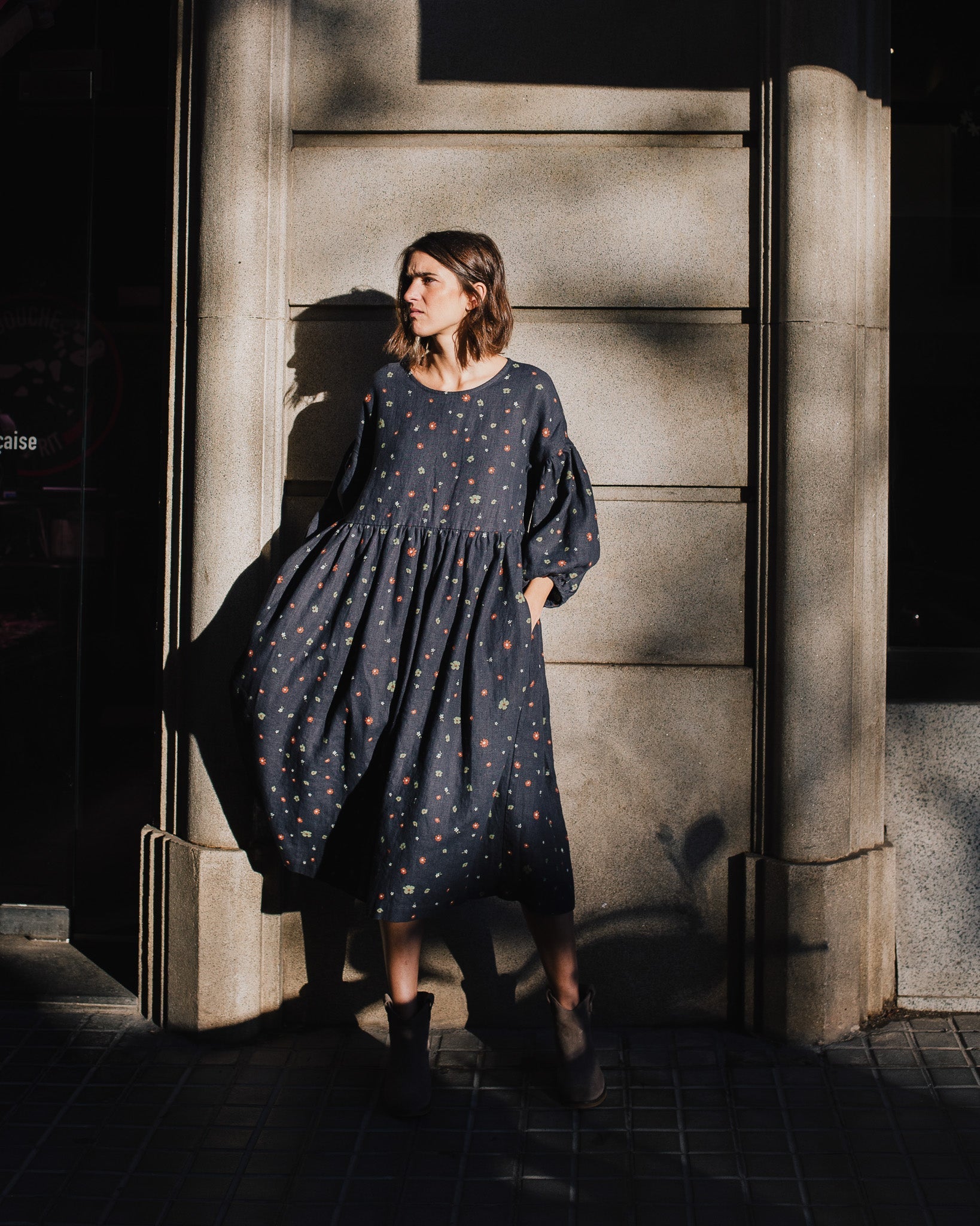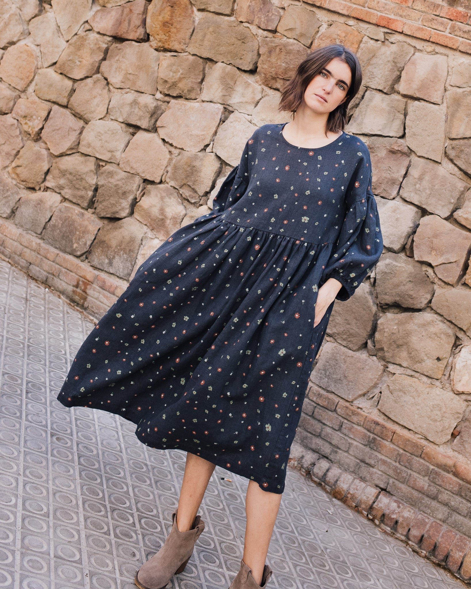 • Model is wearing a dress in heavy linen 'Night Garden' pattern.