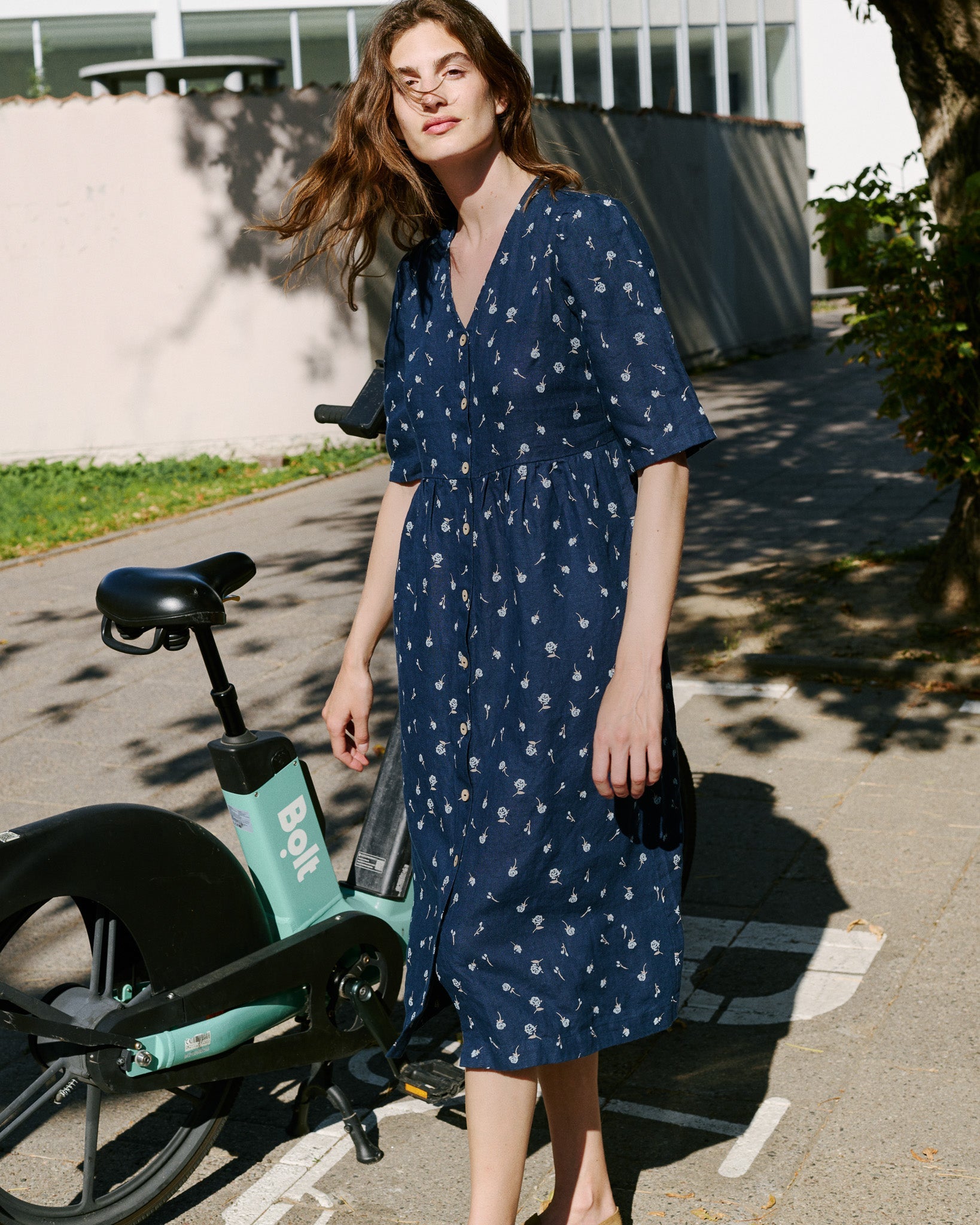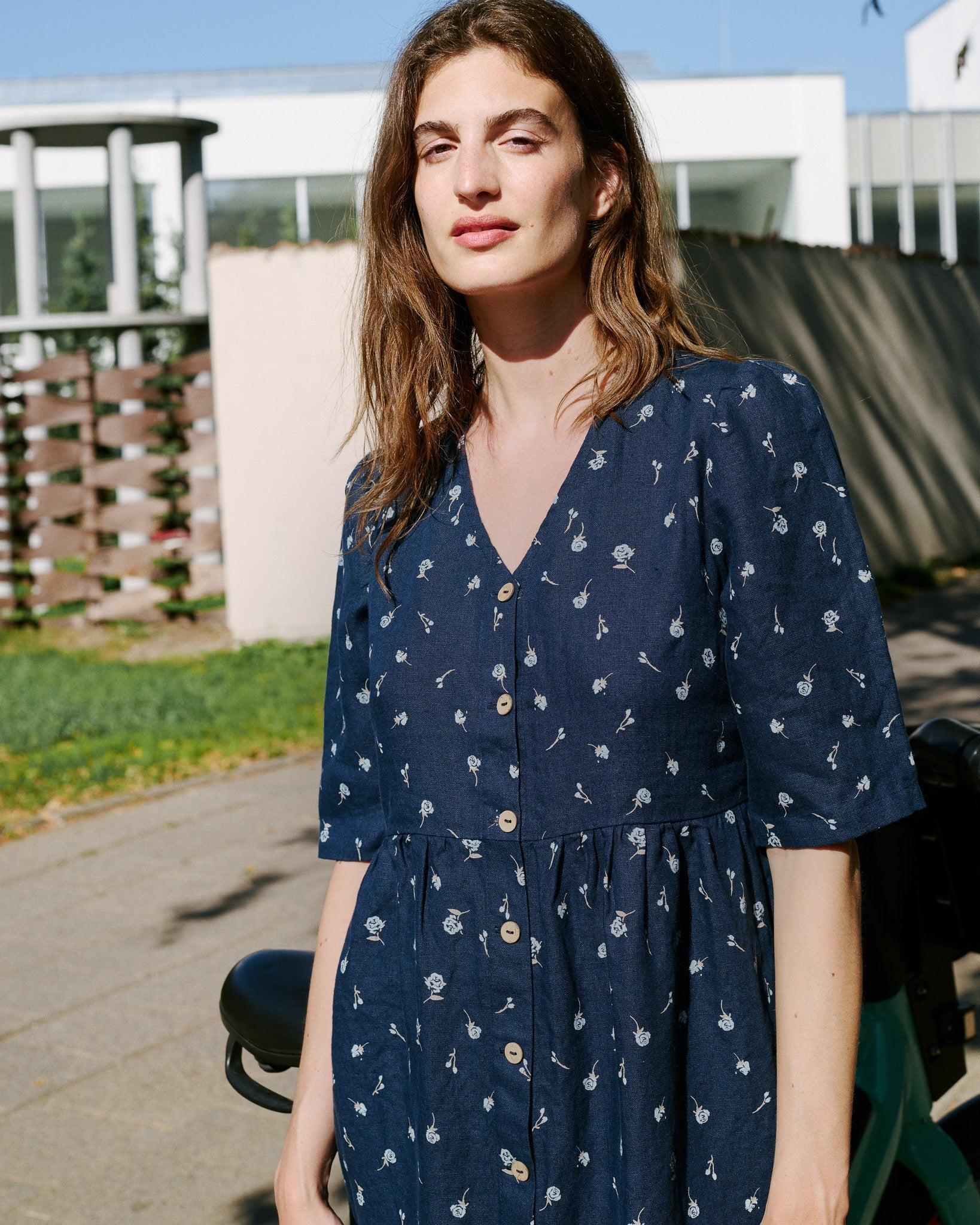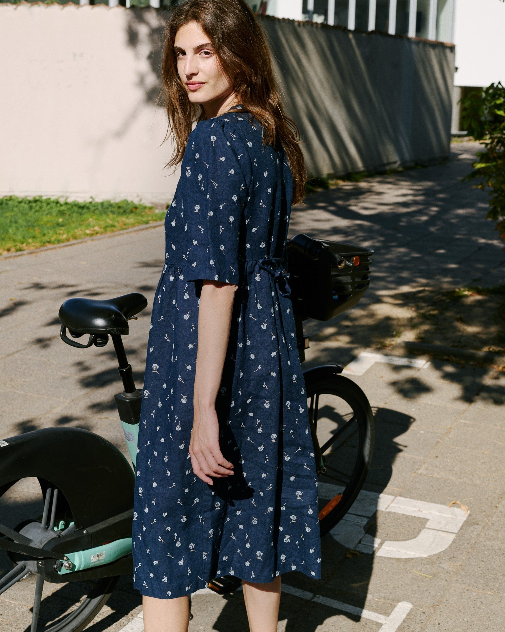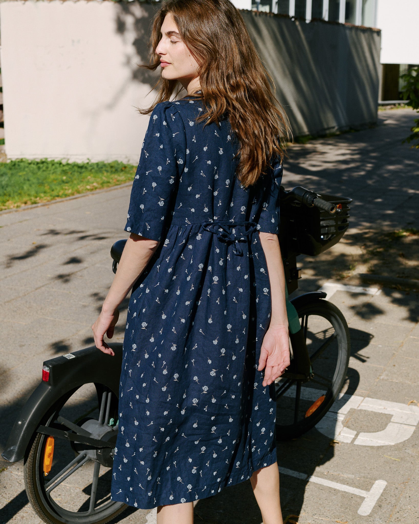 • Washed, soft, elbow-sleeve linen dress with a softly gathered skirt.