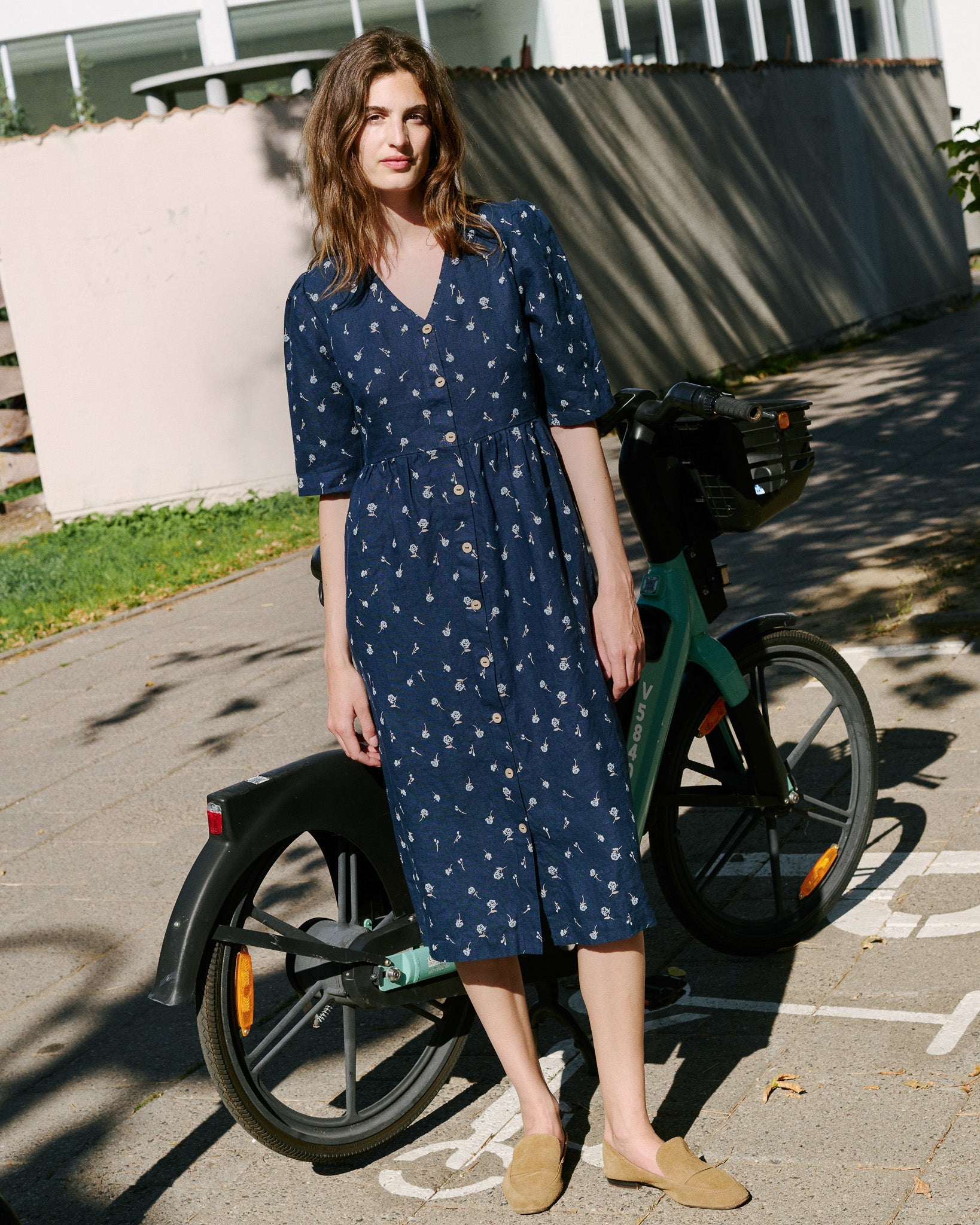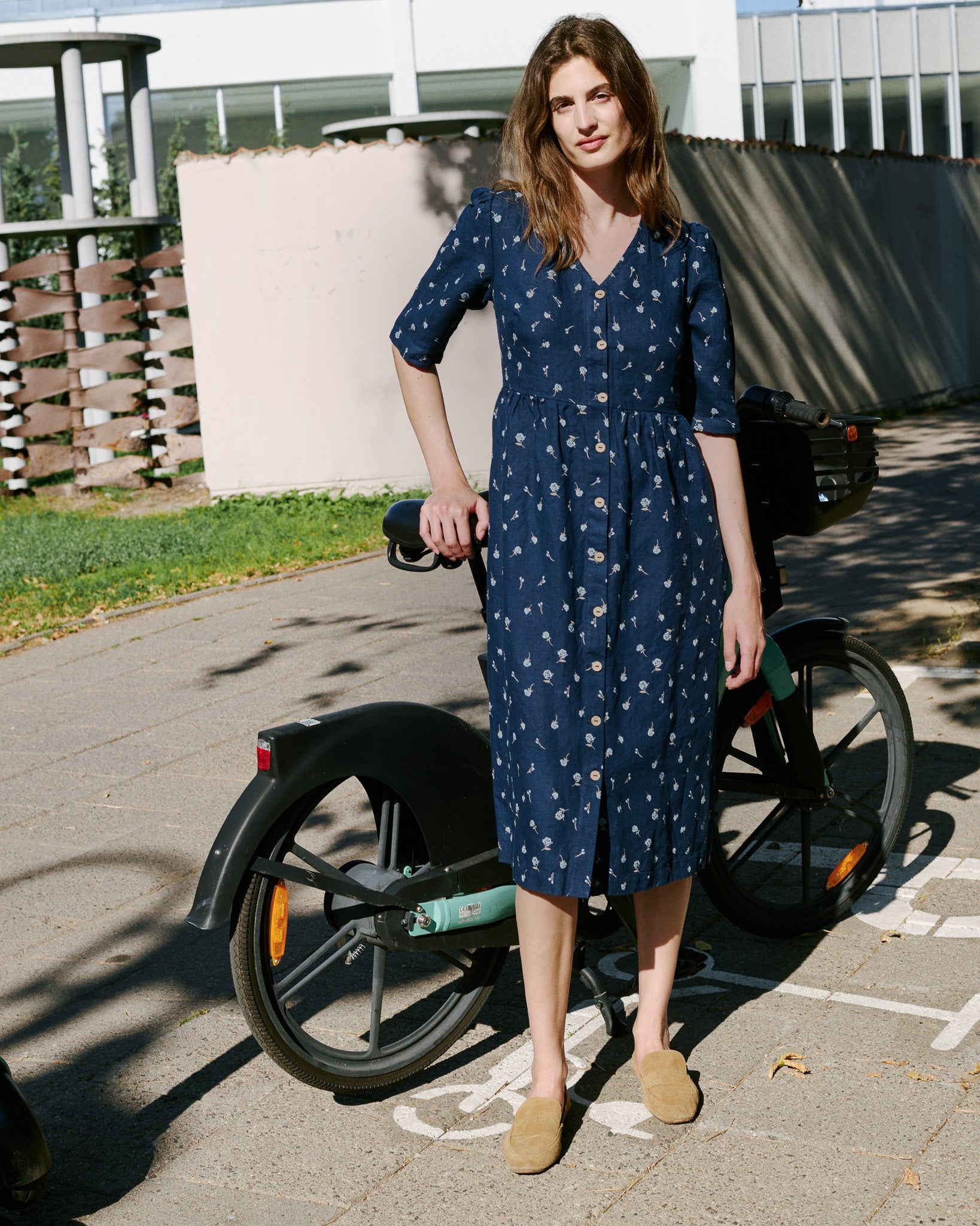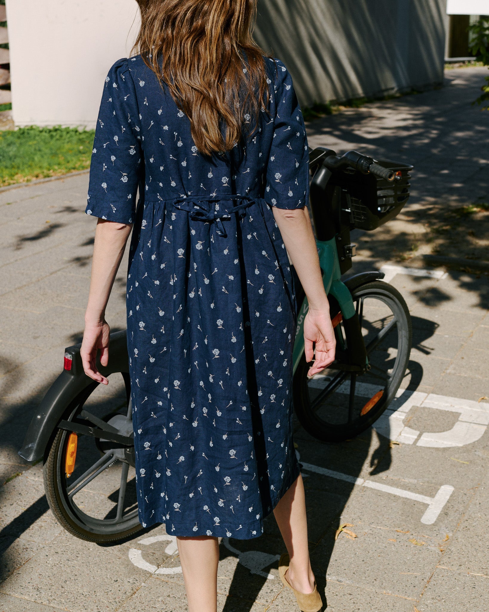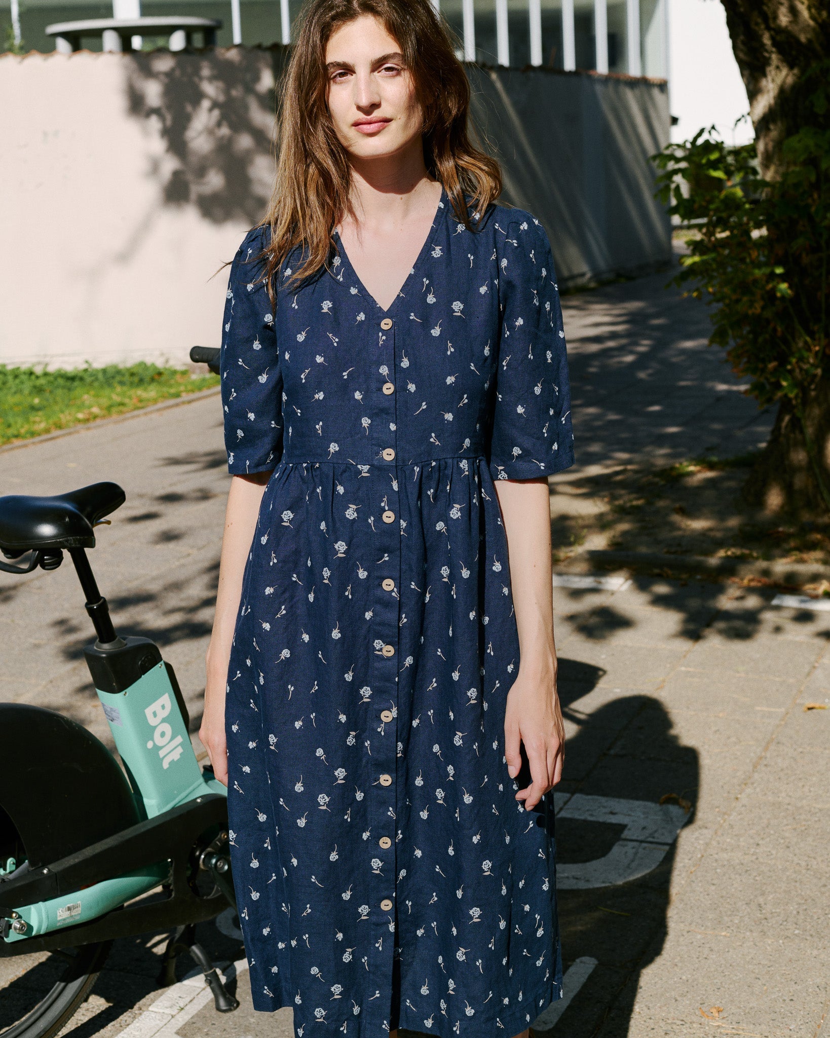 • Washed, soft, elbow-sleeve linen dress with a softly gathered skirt.