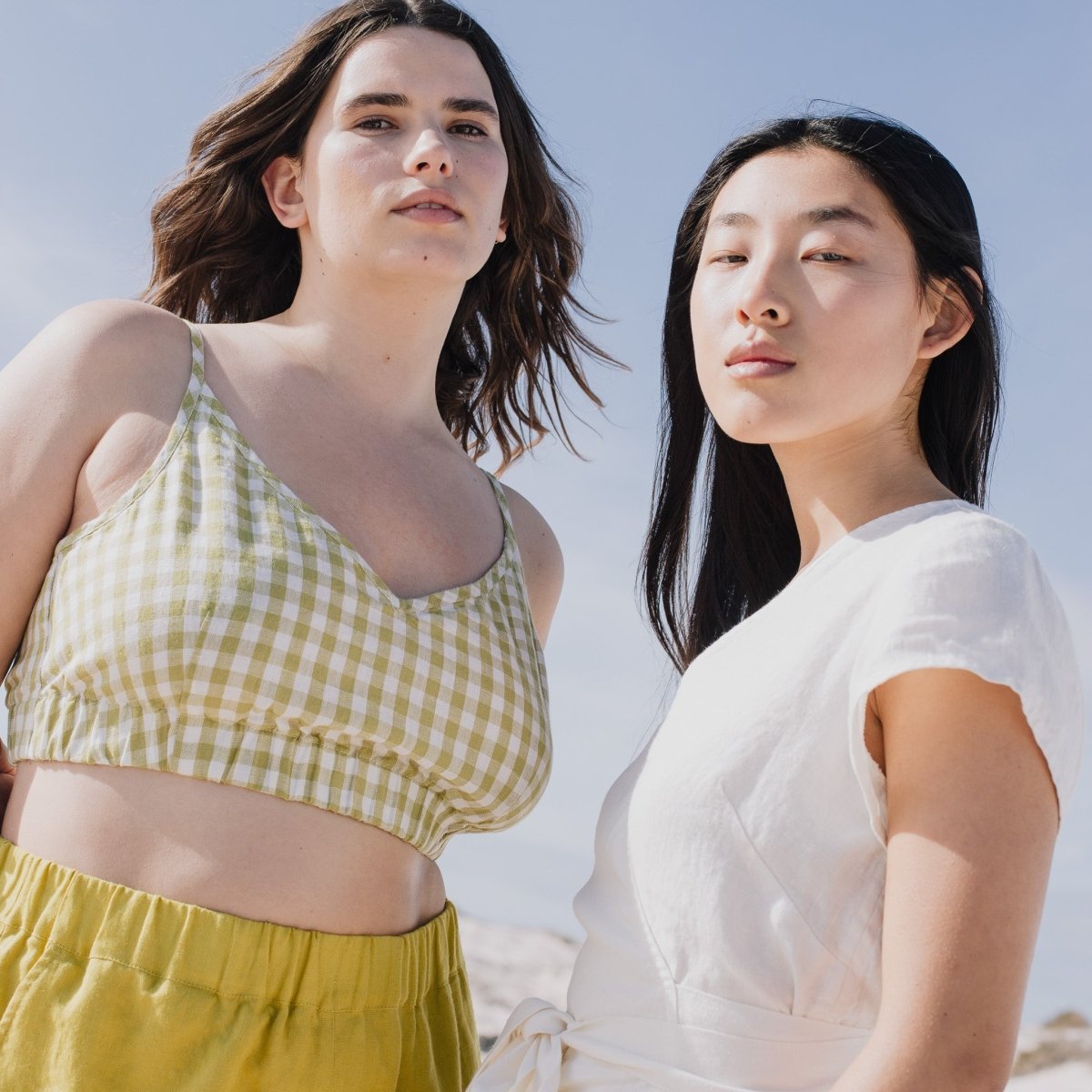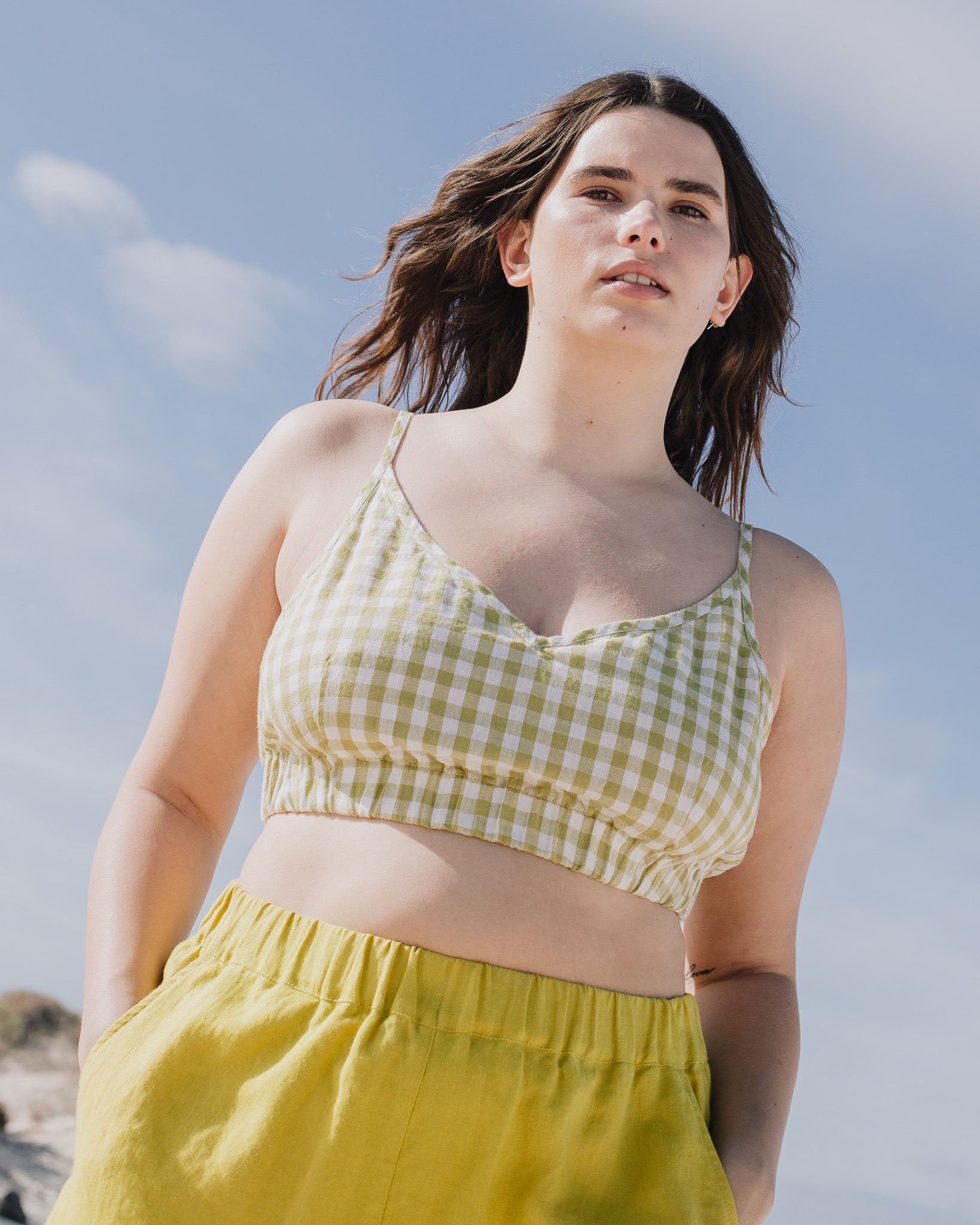 • Model is L at the top and XL at the bottom and wears linen bustier in lime/white gingham in size L and greenish mustard Main shorts in size XL.