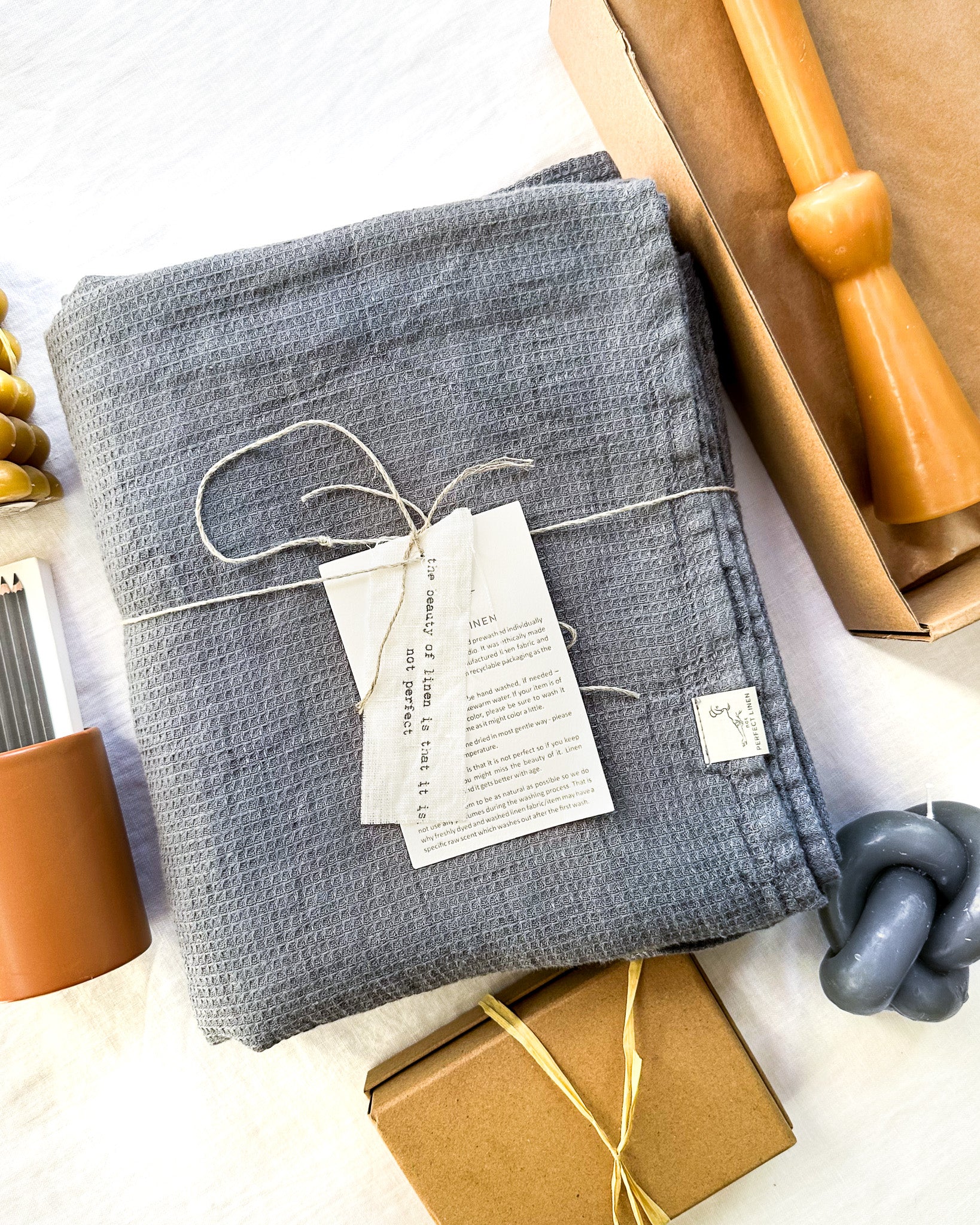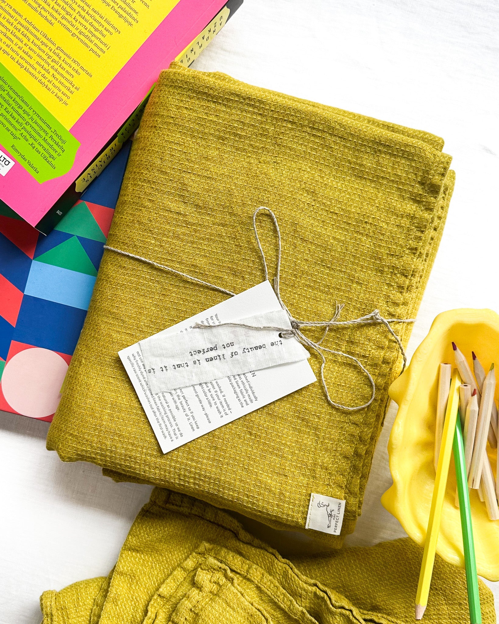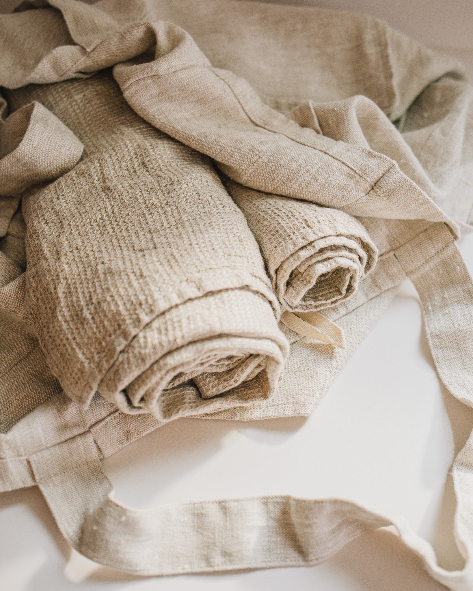 • Washed, soft waffle-weave bath towel made of 100% natural linen.