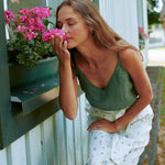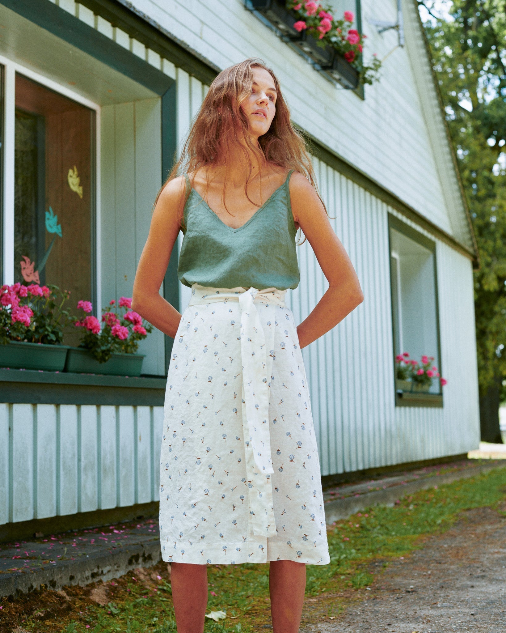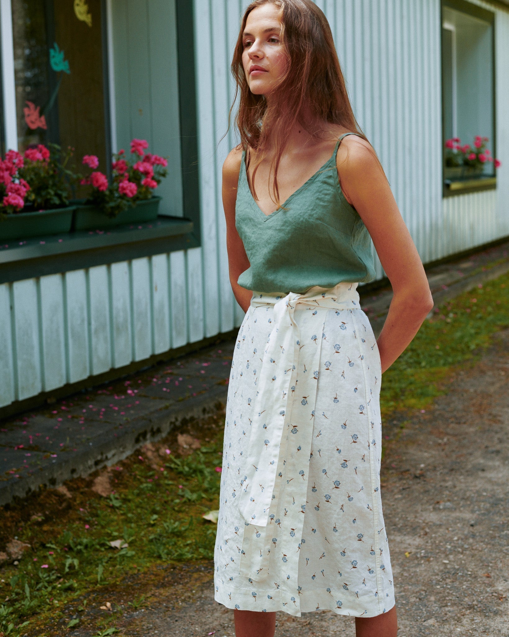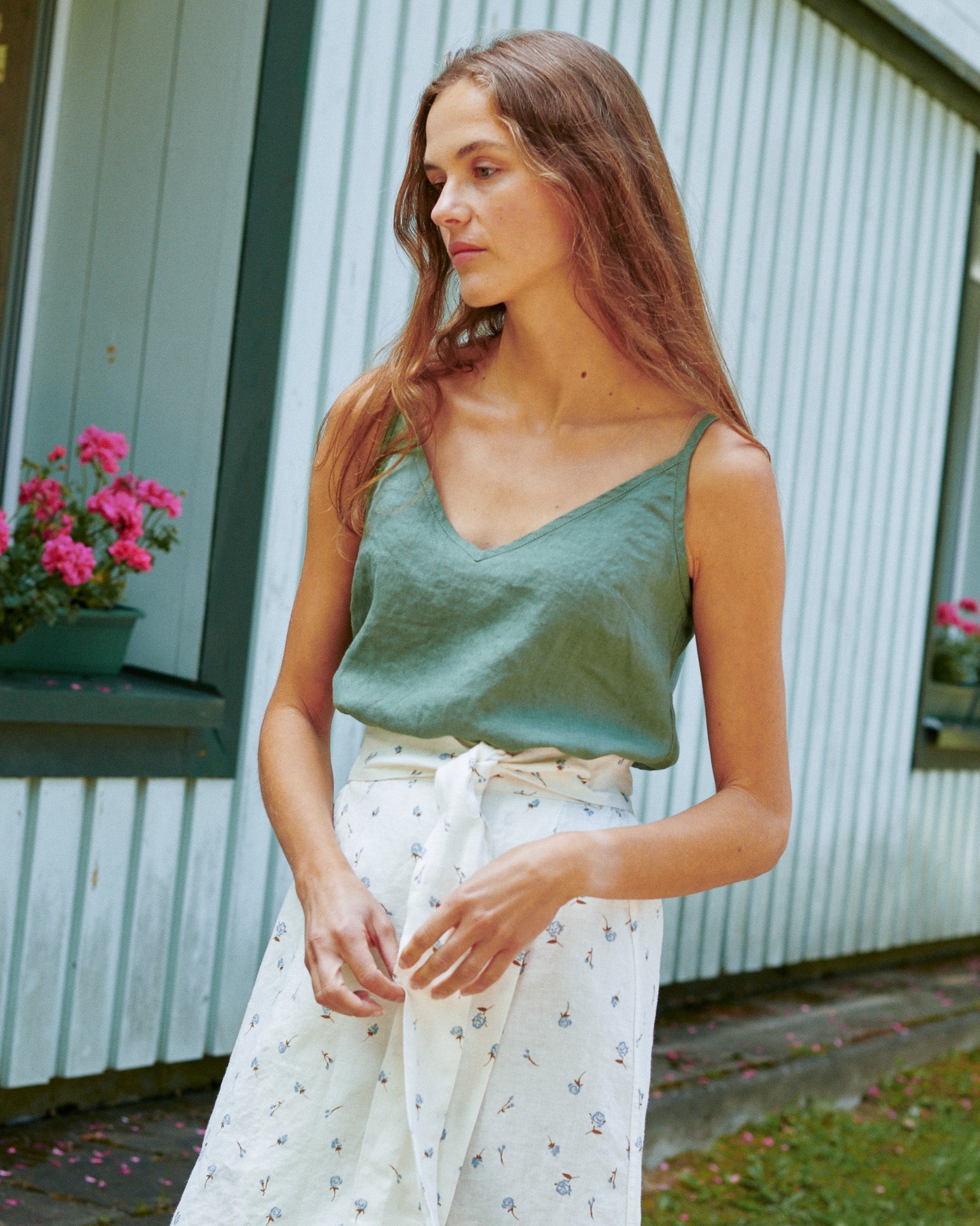 • Model wears a top in vintage green, paired with MARFA skirt in blue rose.