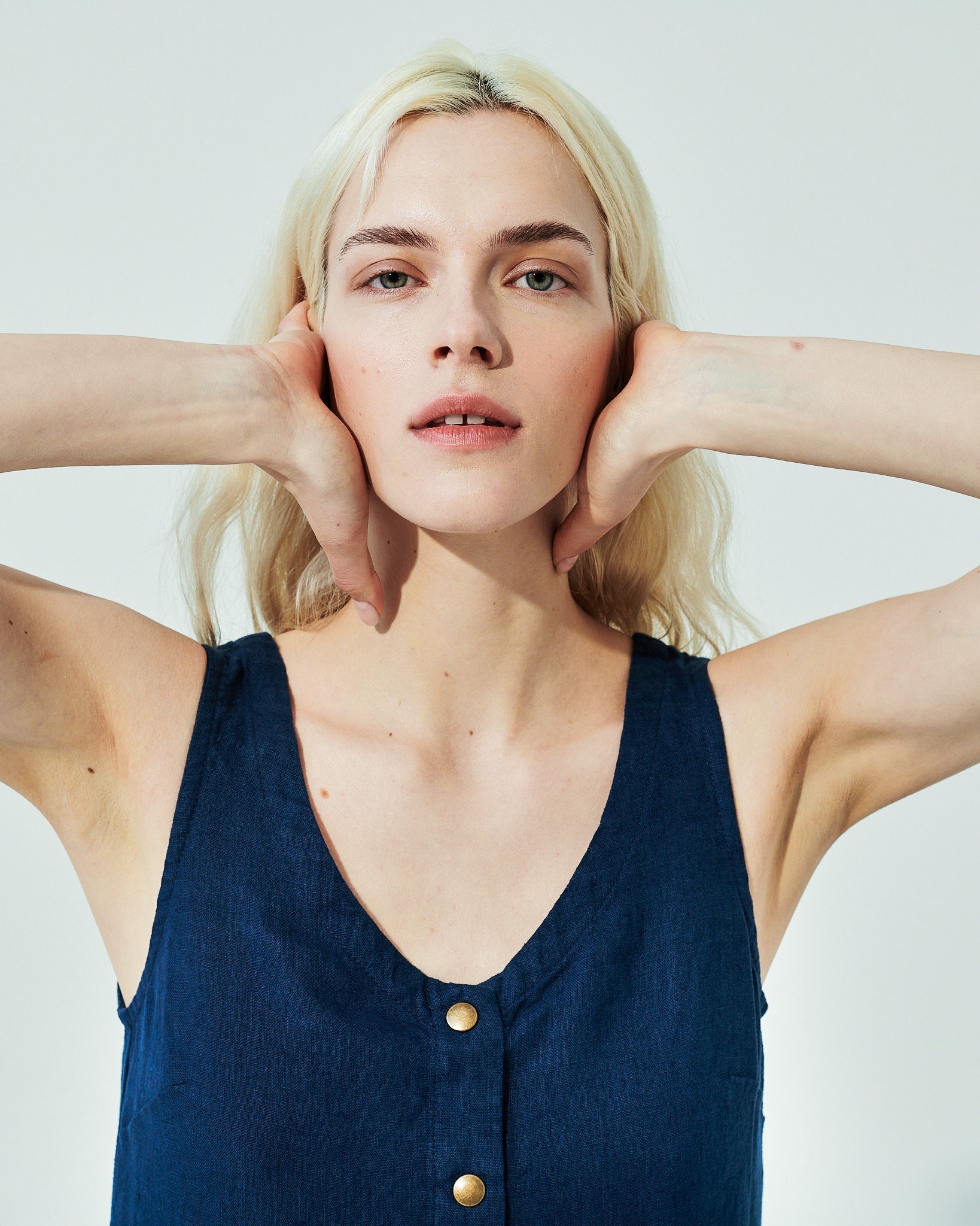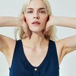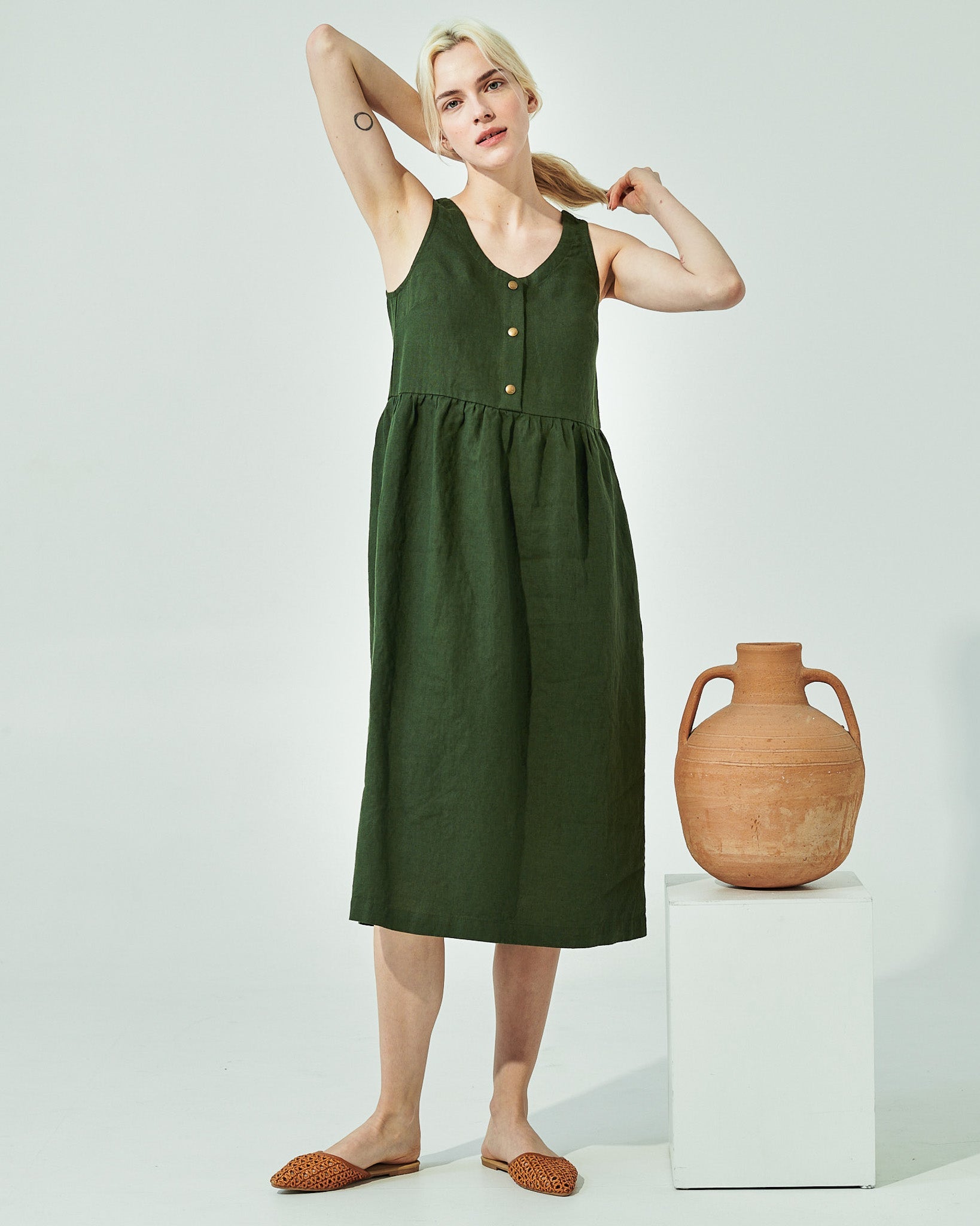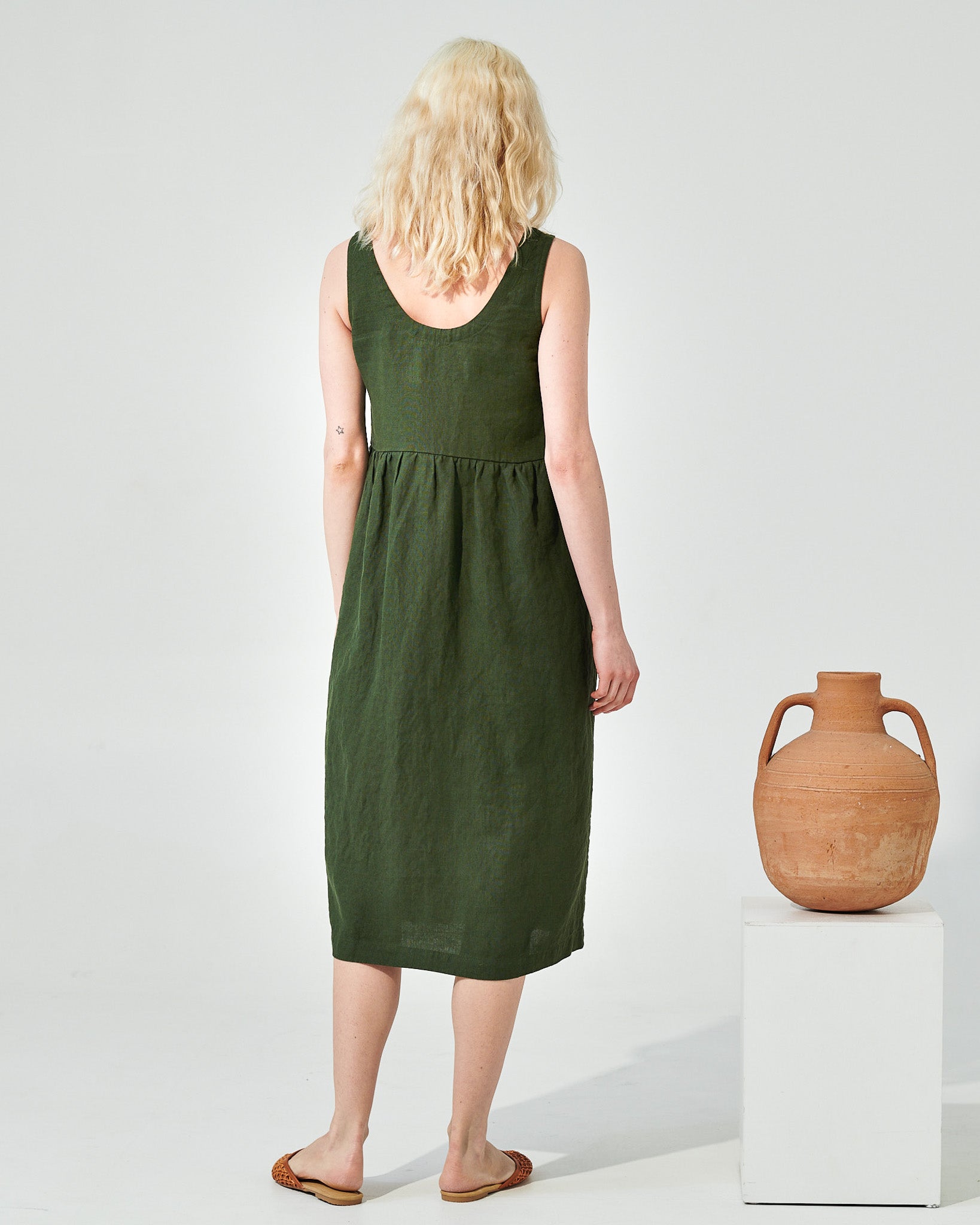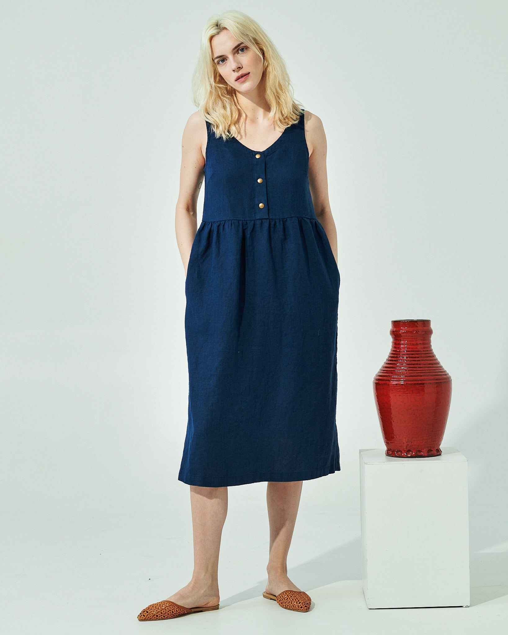 • Washed, soft, easy shape sleeveless linen dress with a softly gathered skirt and pockets set into side-seam at both hips.