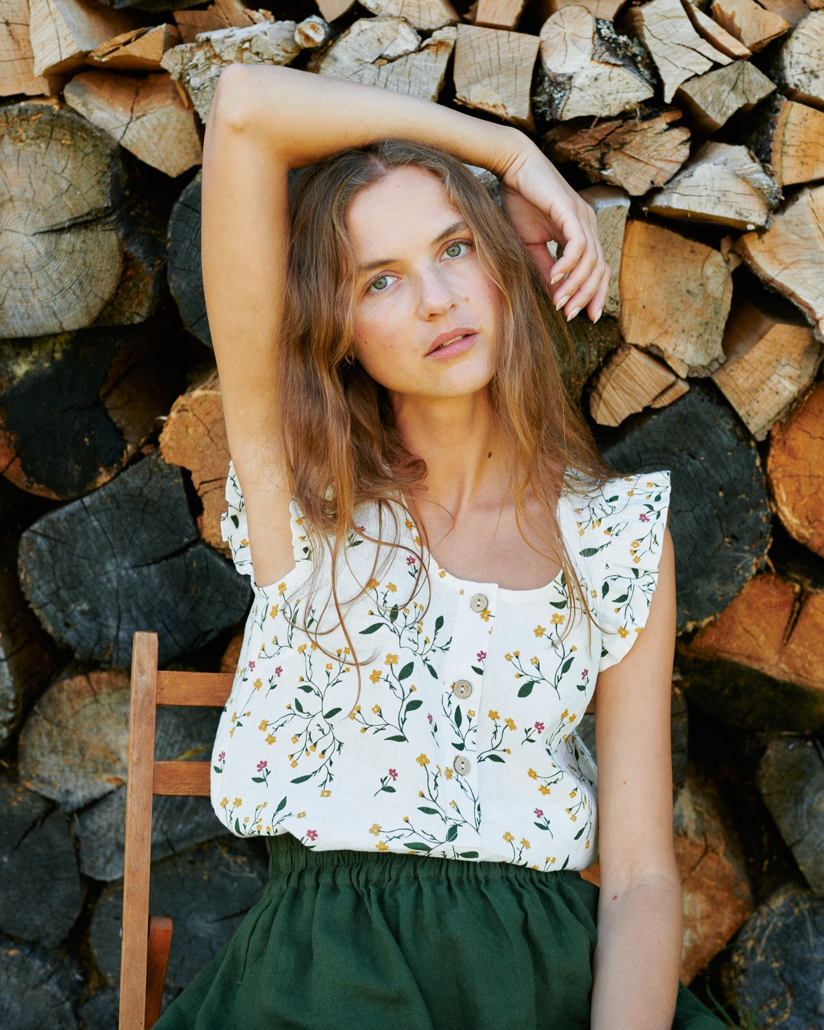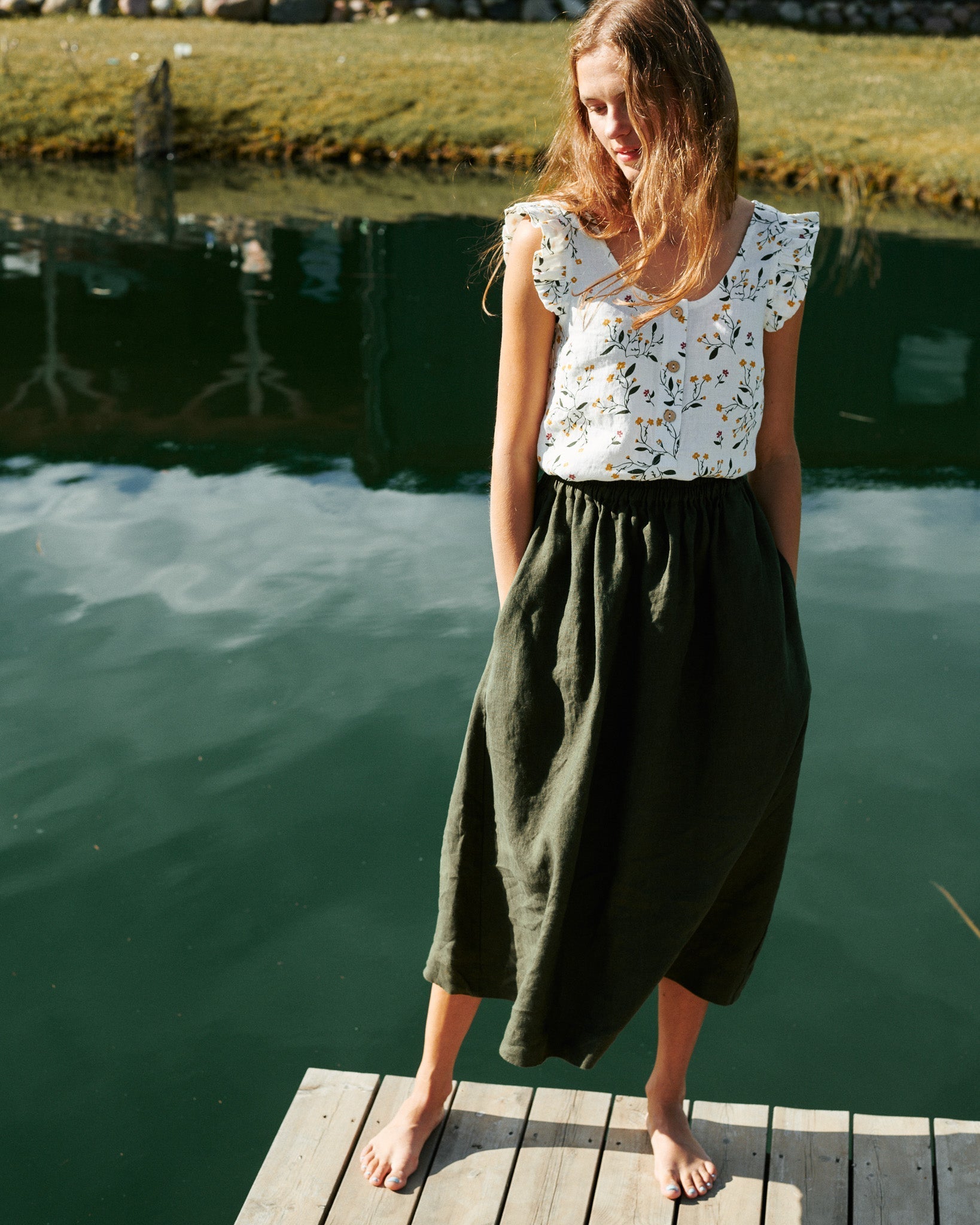 • Model wears a top in sunny field and a SION skirt in juniper green.